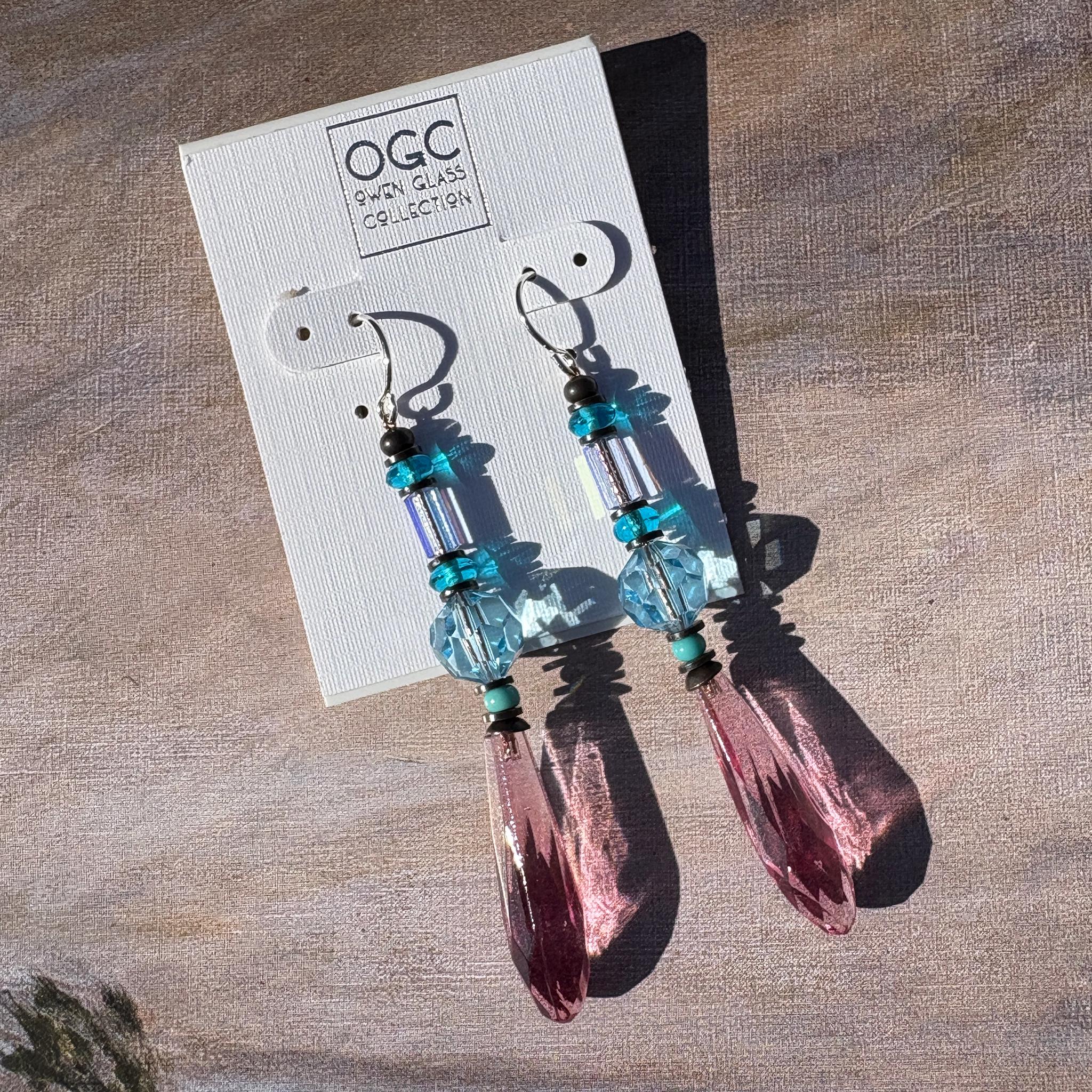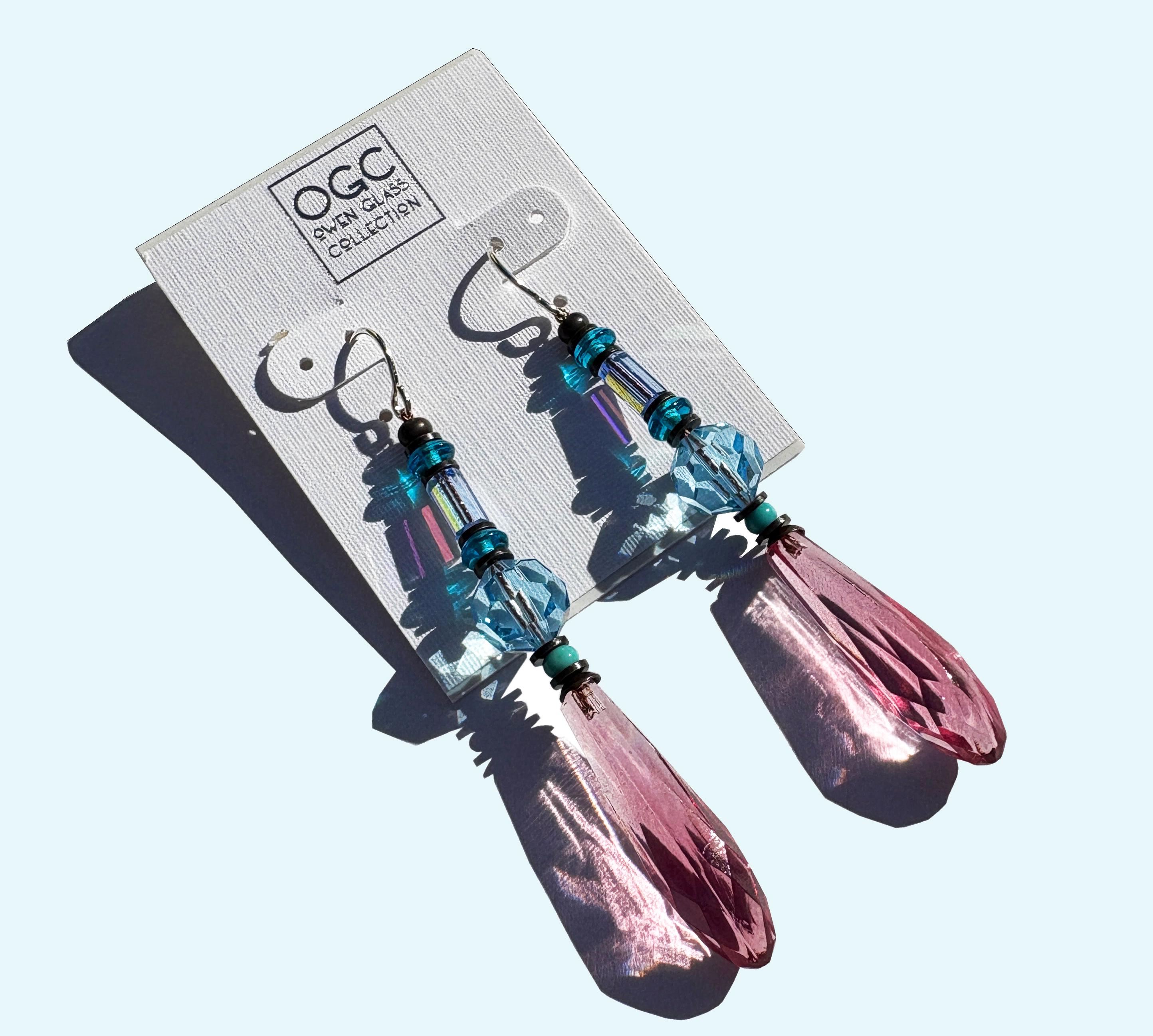 Pink chandelier earrings. Light rose glass prisms, designed by Allen Owen and made for us in Germany. Accents are Austrian crystal and Czechoslovakian glass in shades of sapphire and turquoise. Style 132 earrings measure 2 inches long. Trim is antiqued bronze from our own tooling with sterling silver ear wires. All handwork done in the USA.