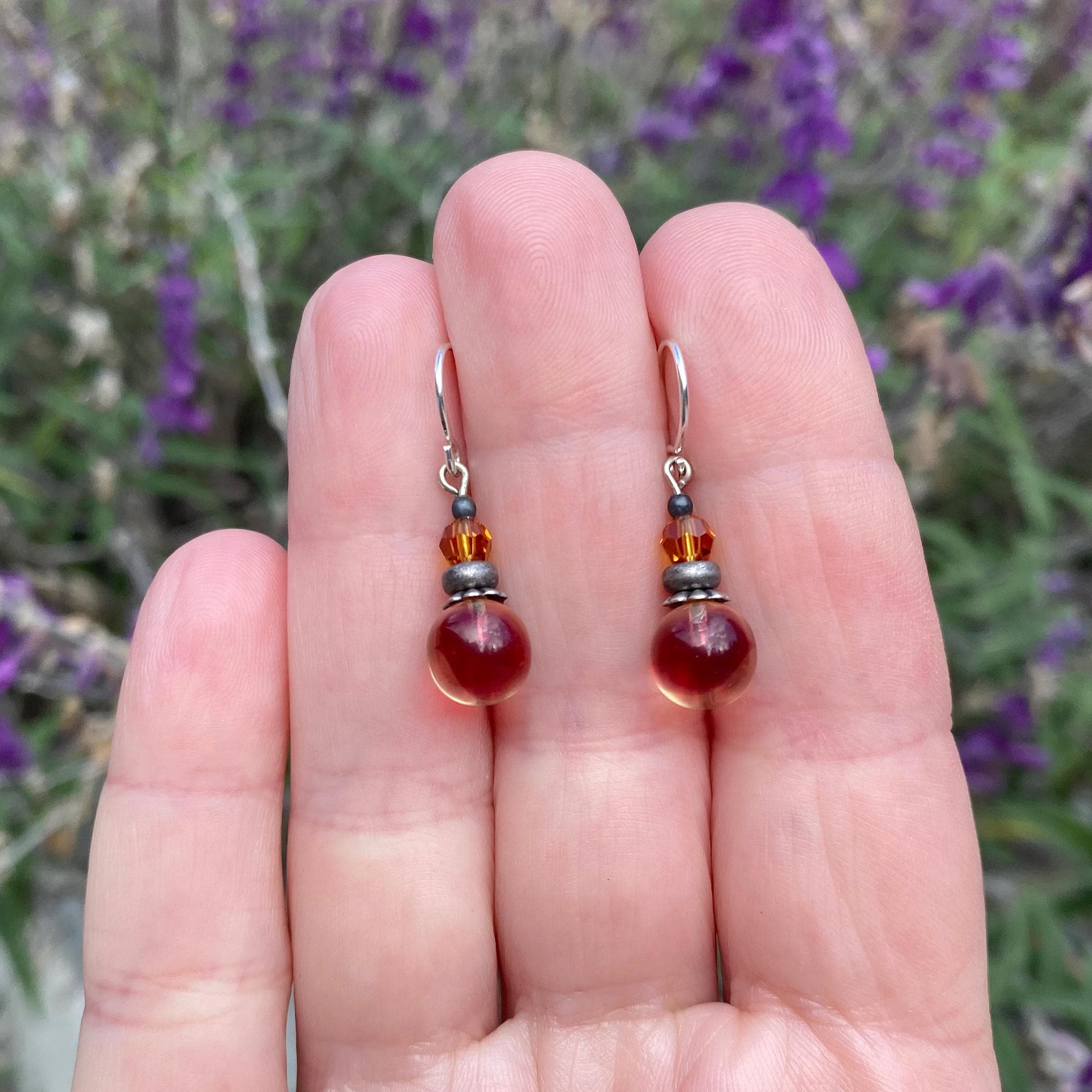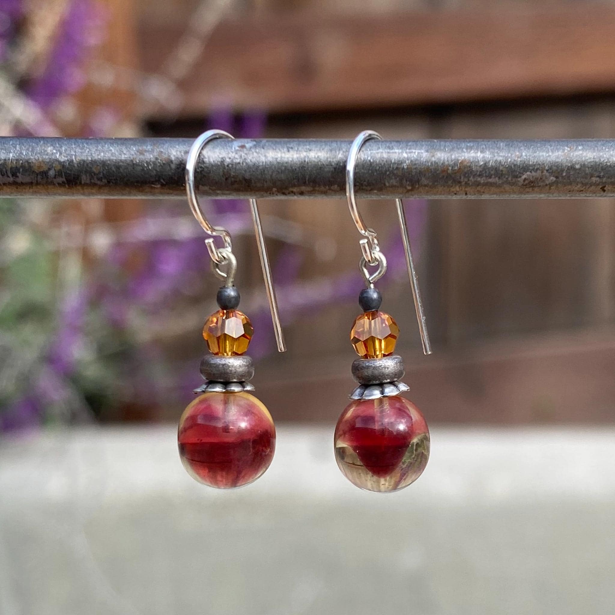 Two-toned dark rose and pale yellow glass drops, designed by Allen Owen and made for us in Germany. Top beads are topaz Austrian crystal. Ear wires are sterling silver. Metal trim is antiqued silver-dipped brass. Bubbles 27 earrings measure 3/4 inches long. All handwork done in the USA.