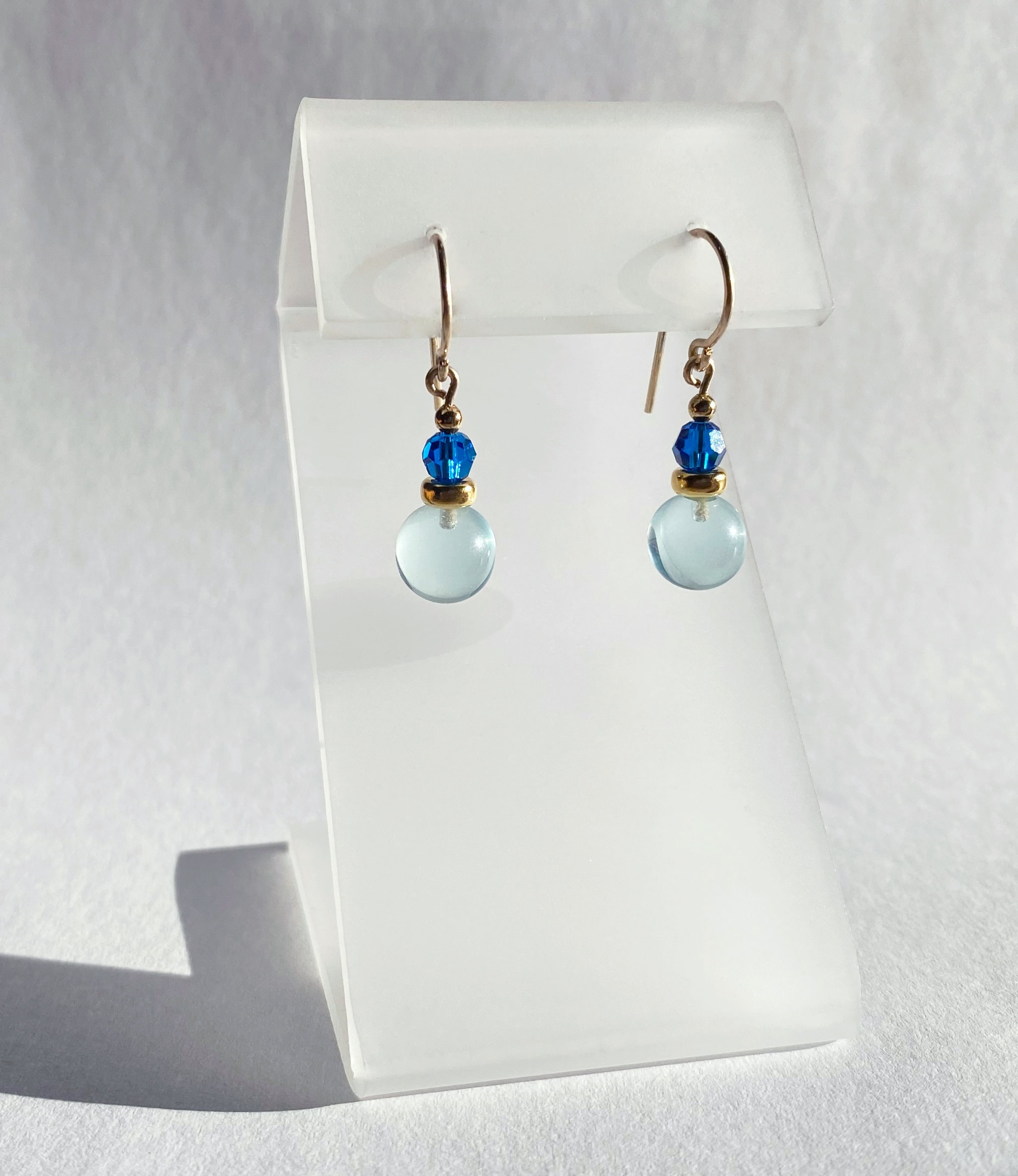 Aquamarine glass and gold earrings. German glass drops from our collection with Austrian crystal capri blue top beads. Ear wires are 14k. gold filled. "Bubbles 66" measure 3/4 inches in length. All handwork done in the USA.