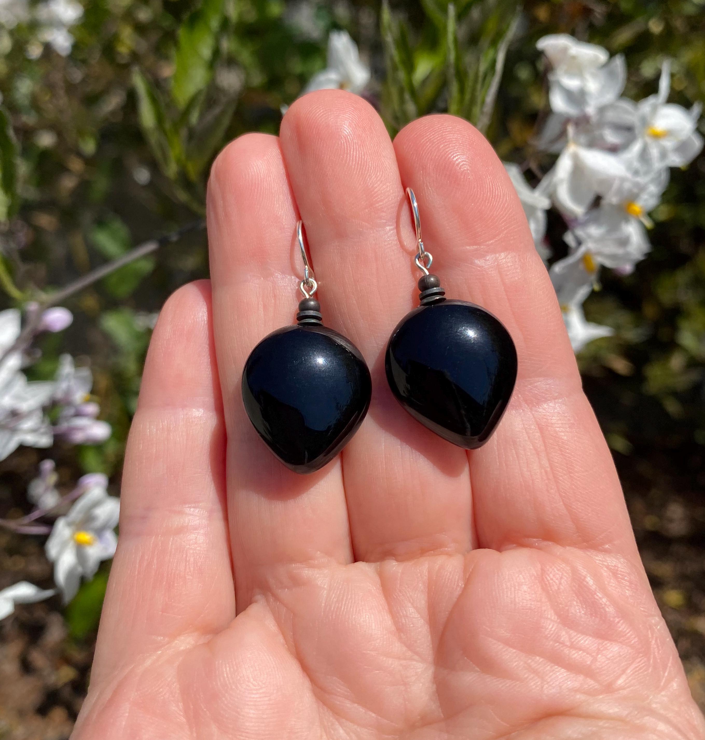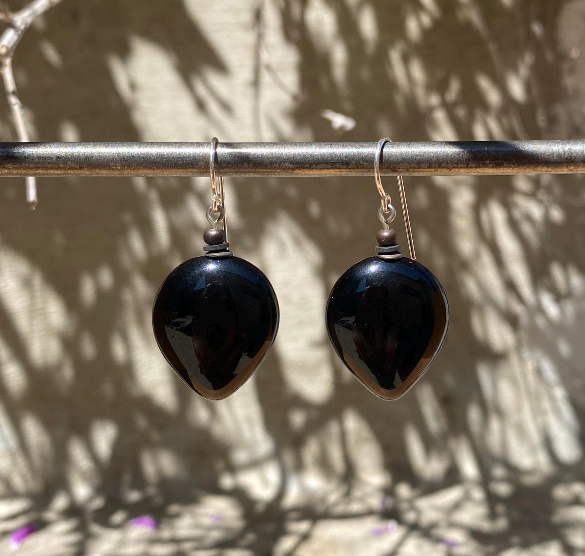 Black earrings. Jet glass drops, designed by Allen Owen and made for us in Germany. Metal trim is antiqued bronze with sterling silver ear wires. "Almonds 8" earrings measure 1 1/8 inches long. All handwork done in the USA.