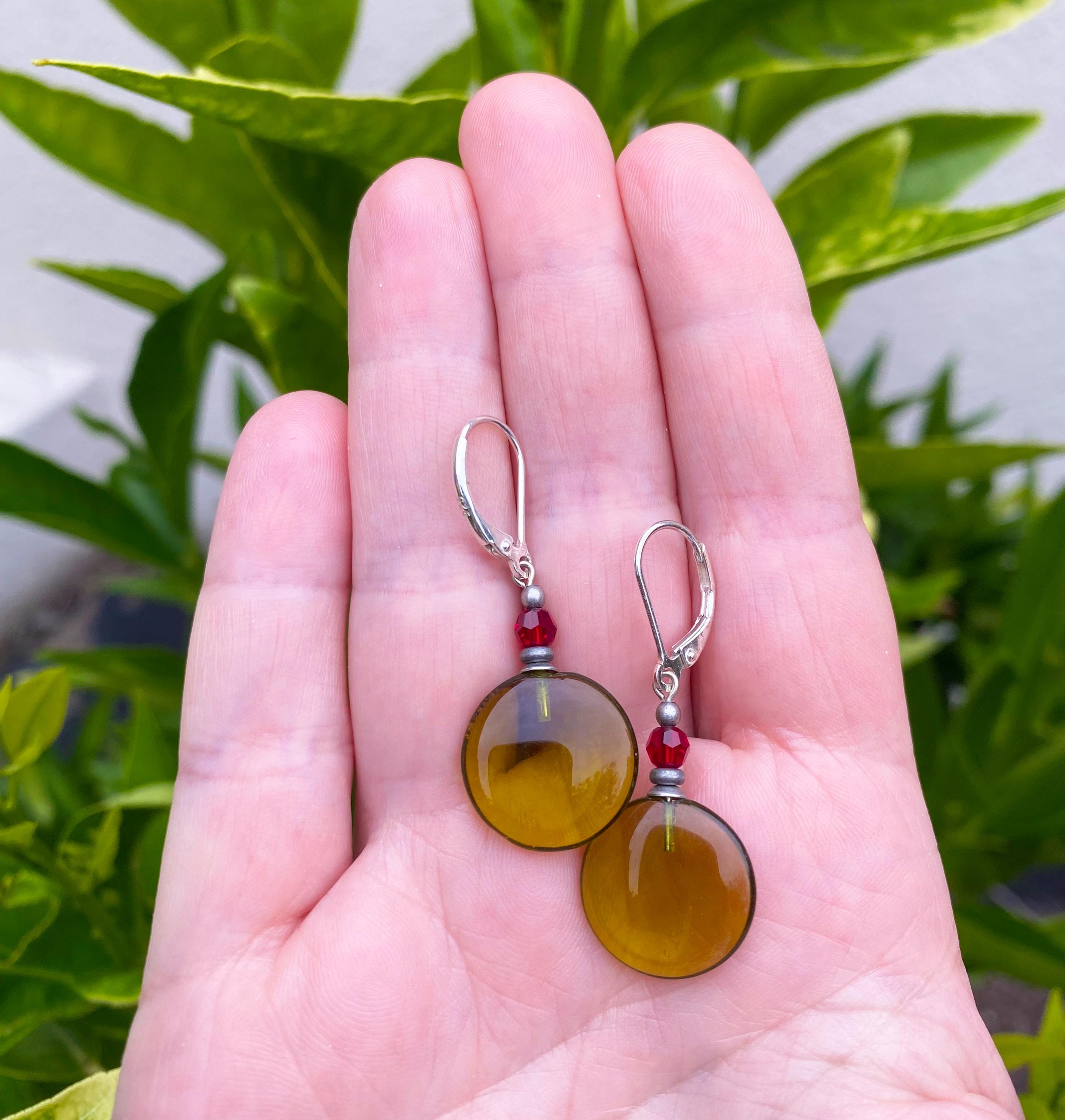 Olivine green glass earrings. These green drops were designed by Allen Owen and are made for us in Germany. The siam red top beads are Austrian crystal. Metal trim is antiqued silver-plated brass with sterling silver ear wires. Windows 7 measure 1 inch in length. All hand work done in the USA.