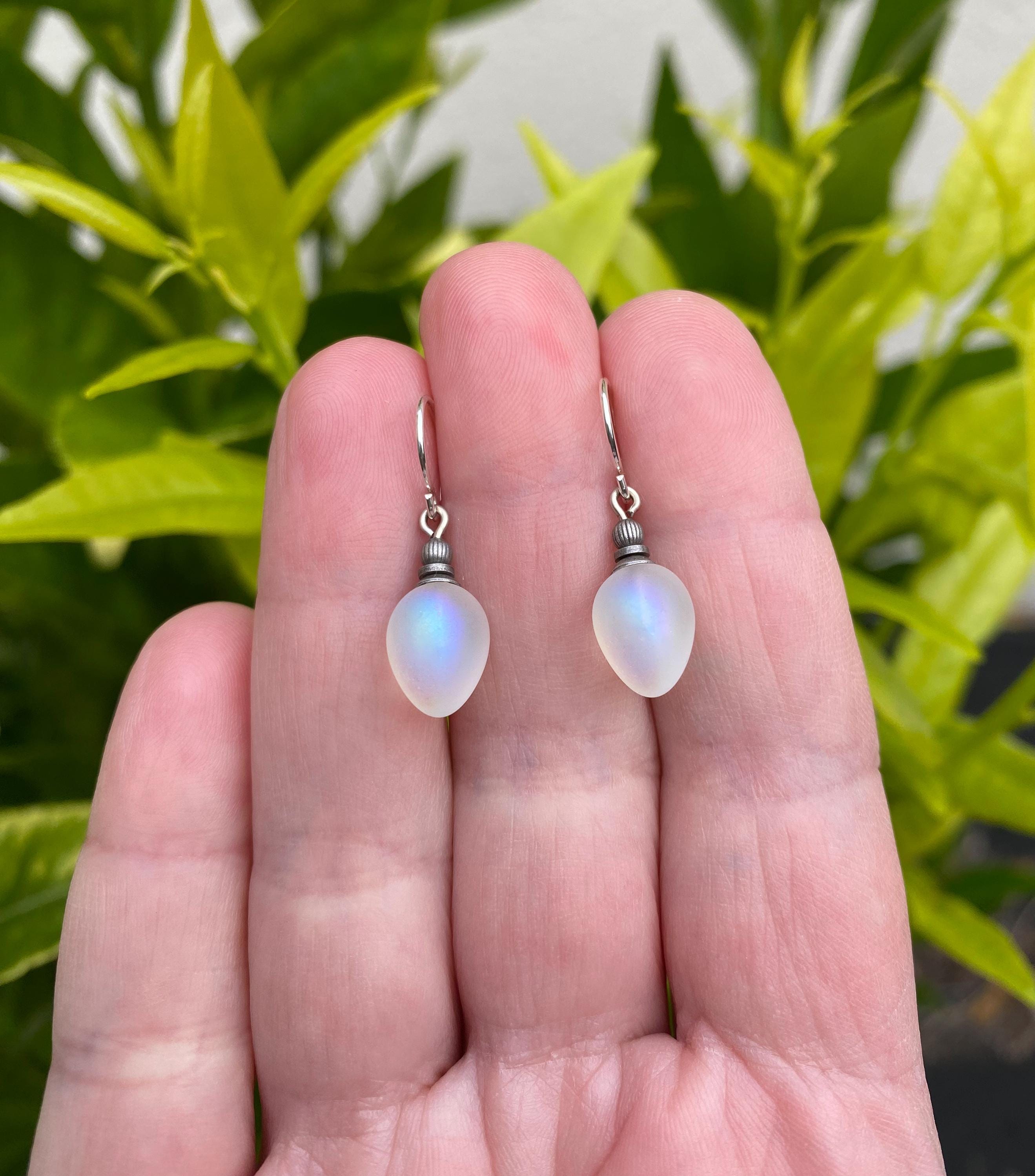 Frosted white glass drop earrings with an iridescent sheen. German glass from our collection, designed by Allen Owen. Mini Berries 2 is 3/4 inches long. Trim is antiqued silver plate with sterling silver ear wires. All handwork done in the USA.