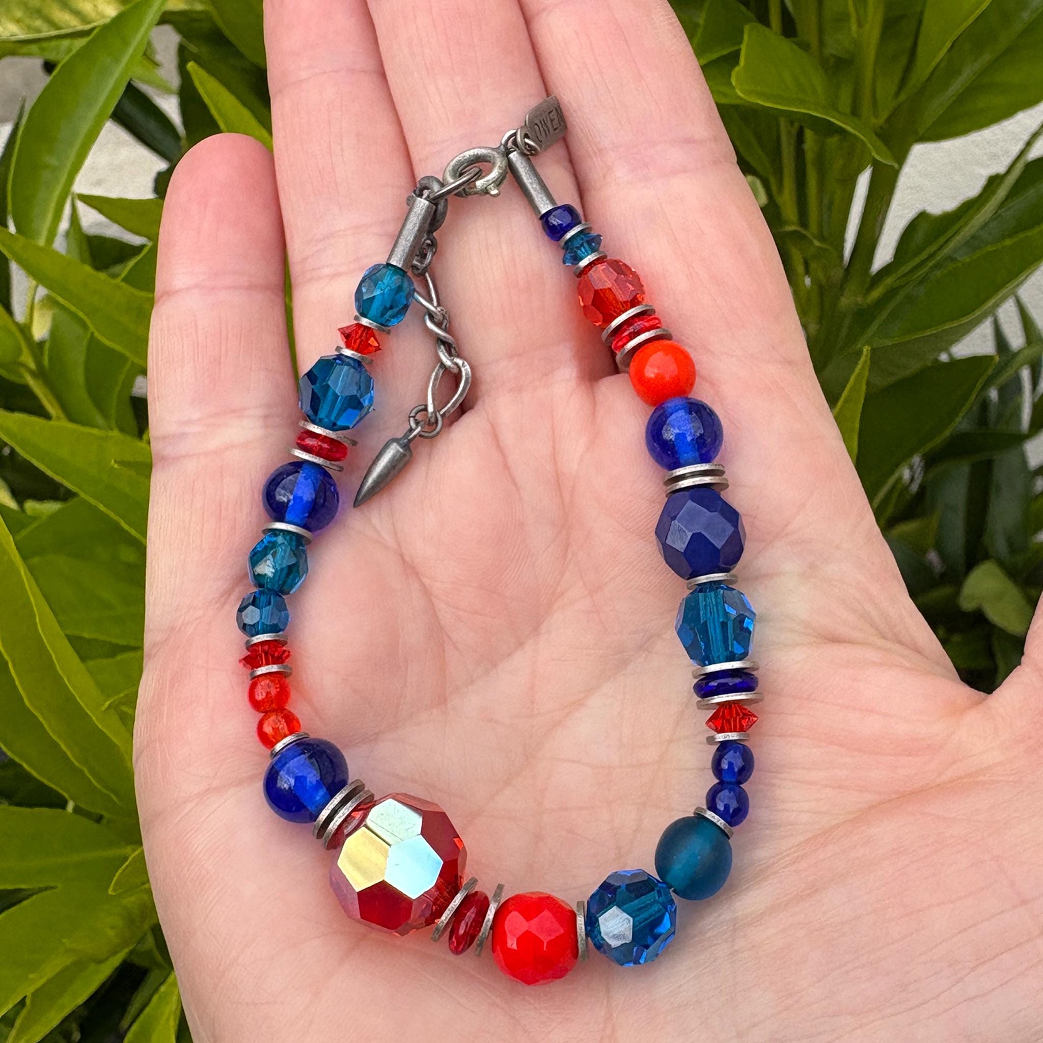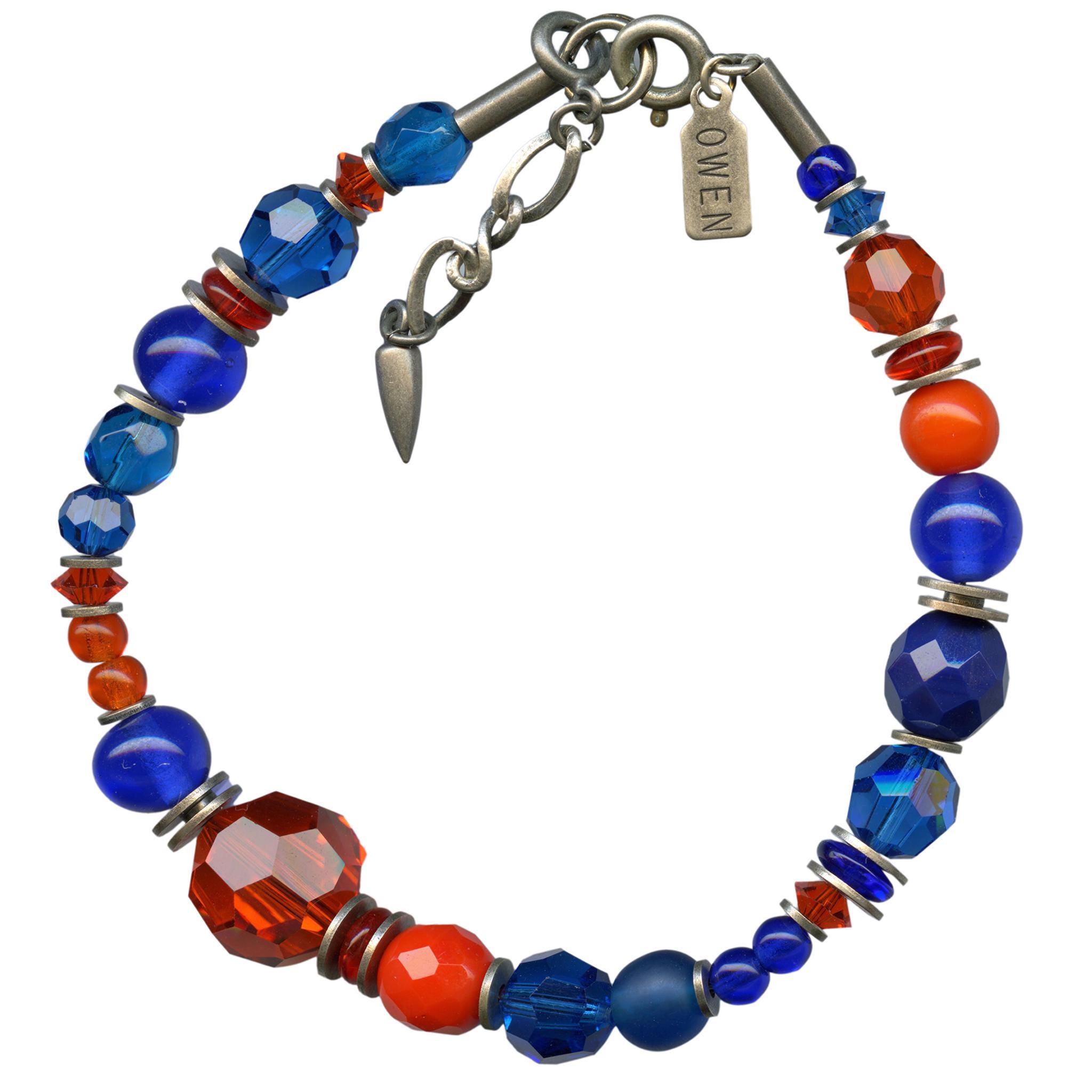 Bright orange, turquoise and cobalt bracelet. Austrian crystal and antique Czechoslovakian glass from our collection in shades of hyacinth orange, cobalt and turquoise . Many of the beads are rare and irreplaceable, circa 1920-1930, originating from Czechoslovakia, Bavaria, Wattens, Kobe and Milano. Antiqued sterling silver plated trim, from our own tooling. "Windows 1" bracelet is 7 inches long with a 1 inch extender included. All handwork done in the USA.