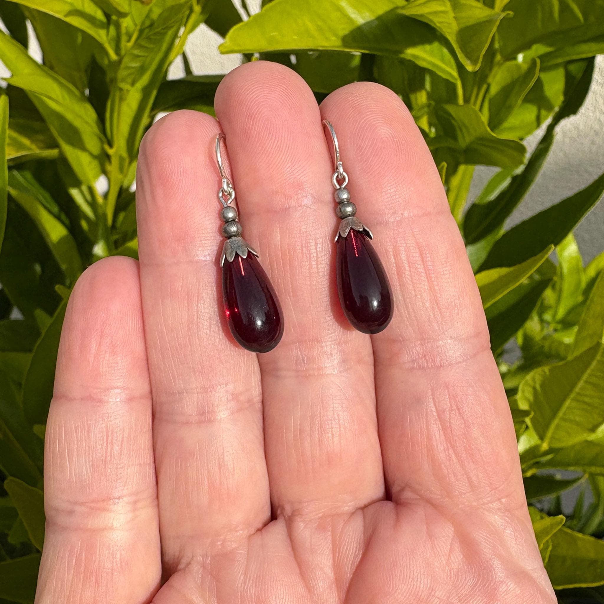 Burgundy earrings. Garnet glass drops, designed by Allen Owen and made for us in Germany. "Silver Brights 1" earrings measure 1 inch in length. Sterling silver ear wires with silver plated trim. Handmade in the USA.