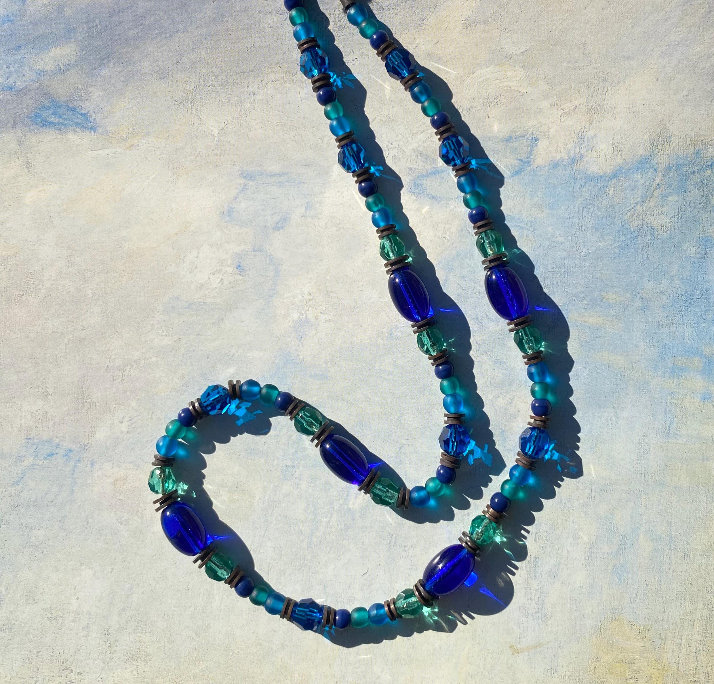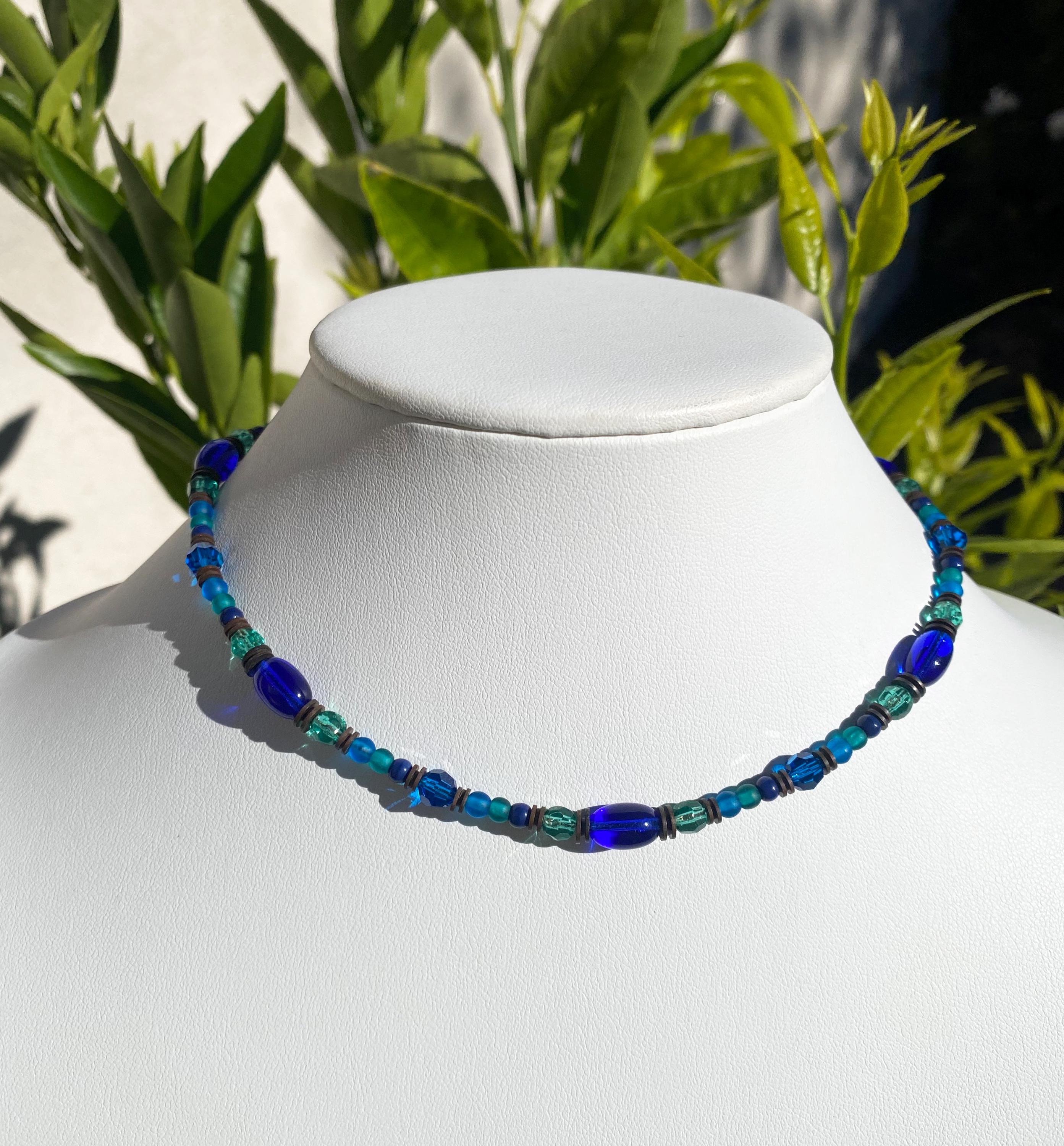 Our "Tahiti" necklace is 15 inches long with a 2 inch extender included. Czechoslovakian glass and Austrian crystal in shades of cobalt, aqua and peridot. Antiqued bronze trim, from our own tooling. Hand made in the USA.