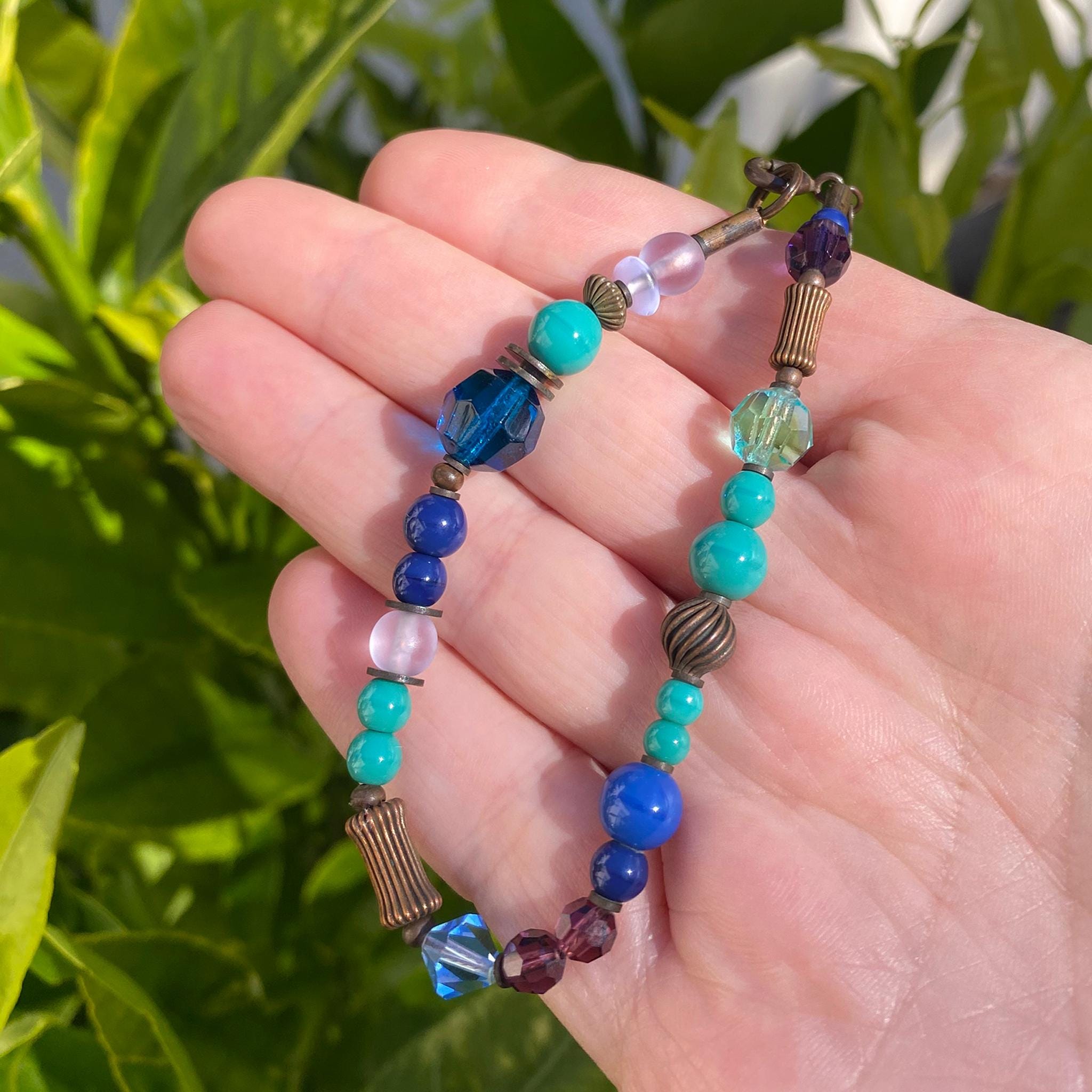 Czechoslovakian glass and Austrian crystal bracelet in shades of zircon green, capri blue and amethyst. Metal parts from our own tooling are antiqued bronze. "Anemone" bracelet measures 7 inches long, hand made in the USA. A 1" extender is included.