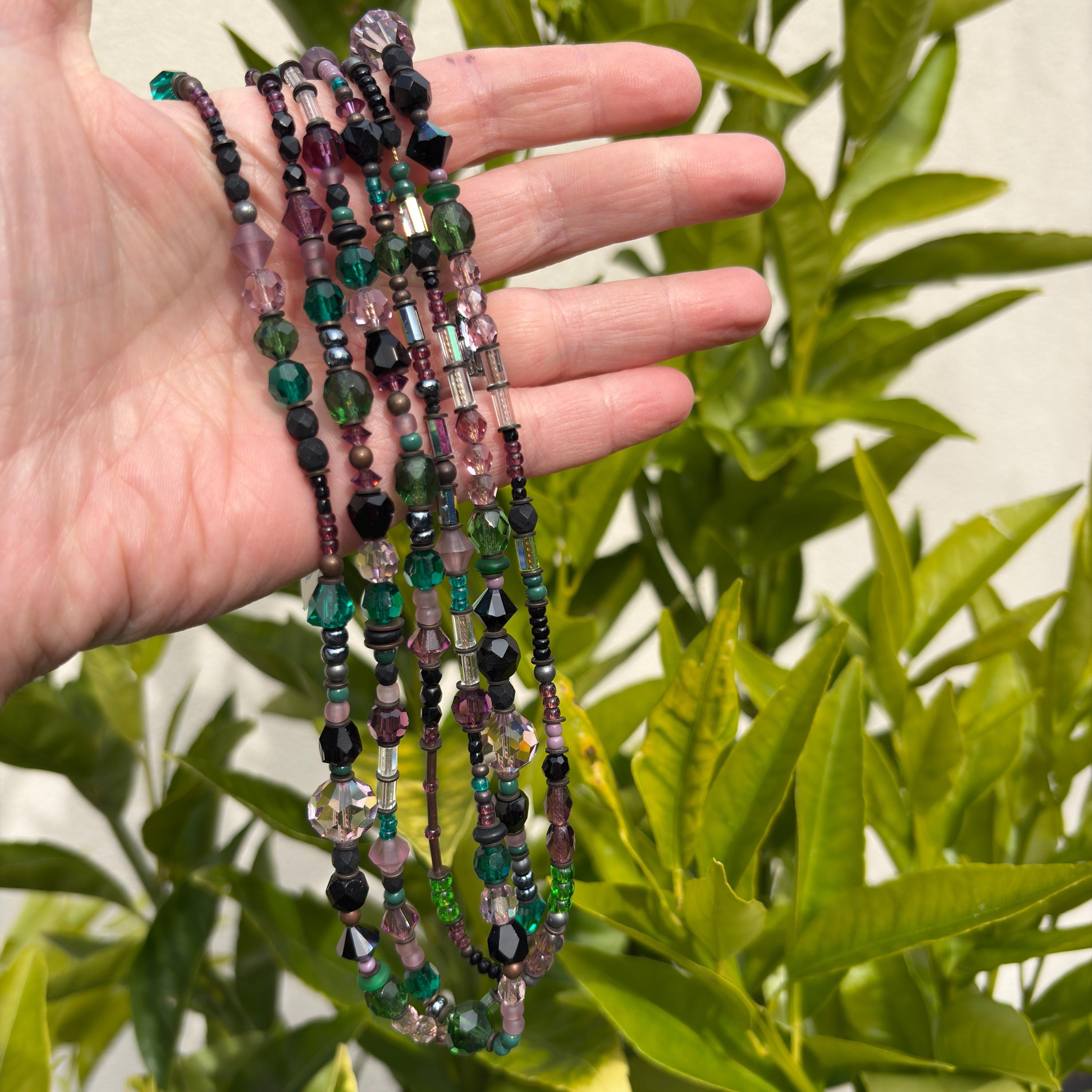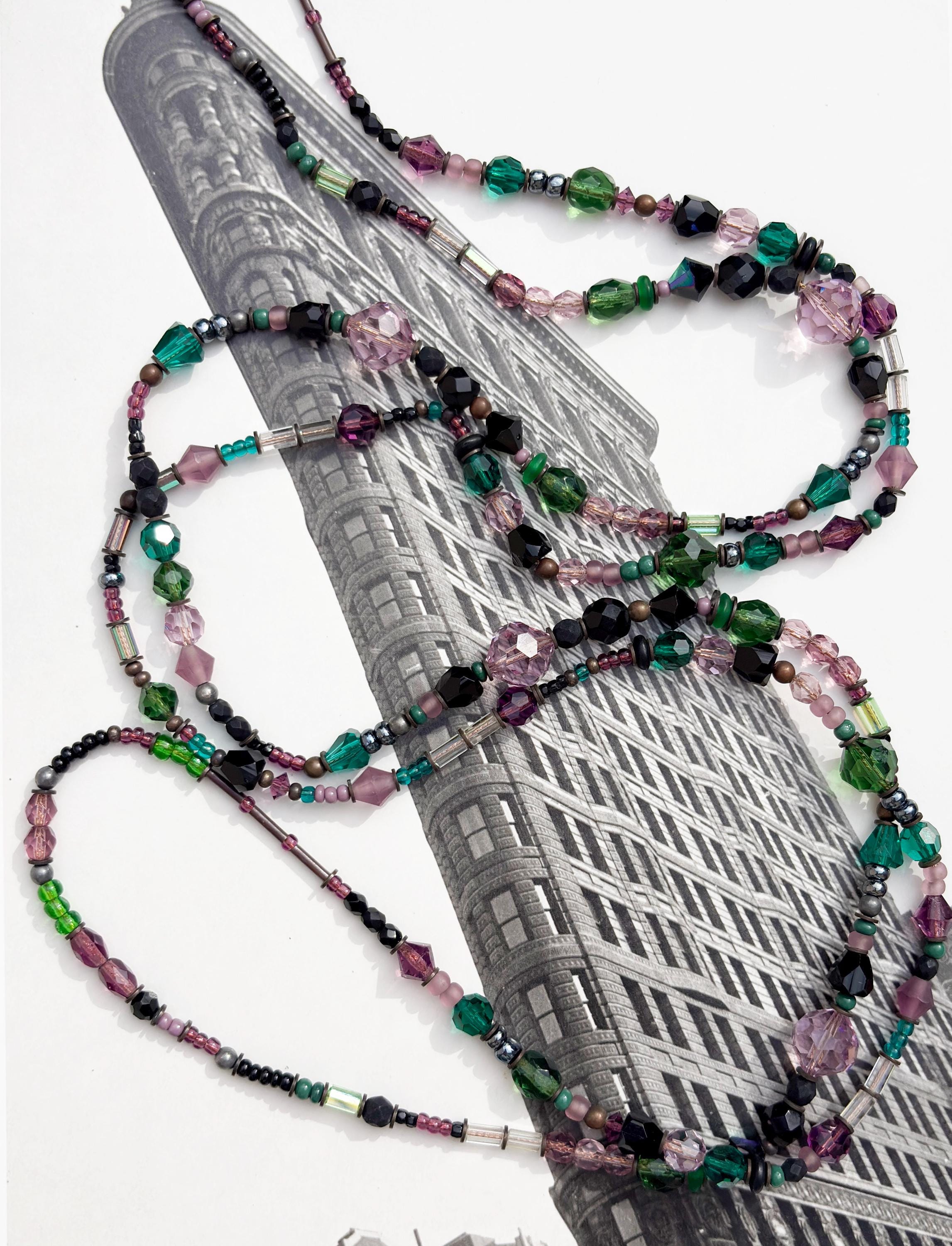 67-inch beaded crystal necklace, "5 O'Clock News." Shades of amethyst, tourmaline, and jet Austrian crystal and Czechoslovakian glass, from our collection. Many of the beads are rare and irreplaceable, circa 1920-1930, originating from Czechoslovakia, Bavaria, Wattens, Kobe and Milano. Metal parts from our own tooling are antiqued bronze. Handmade in the USA.