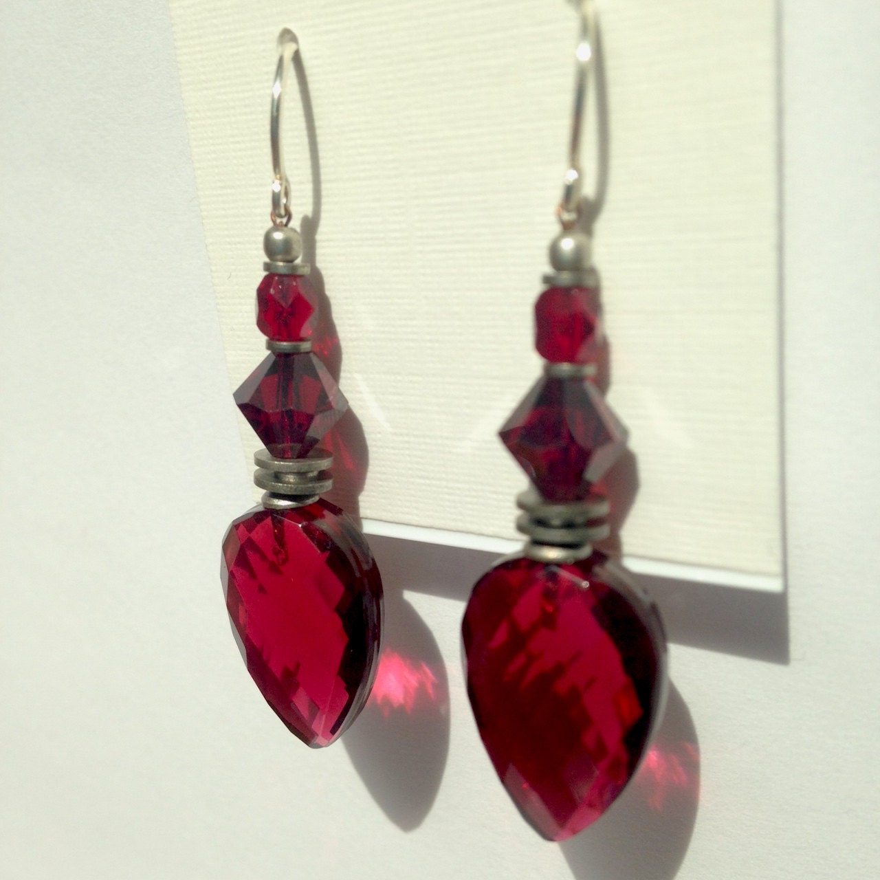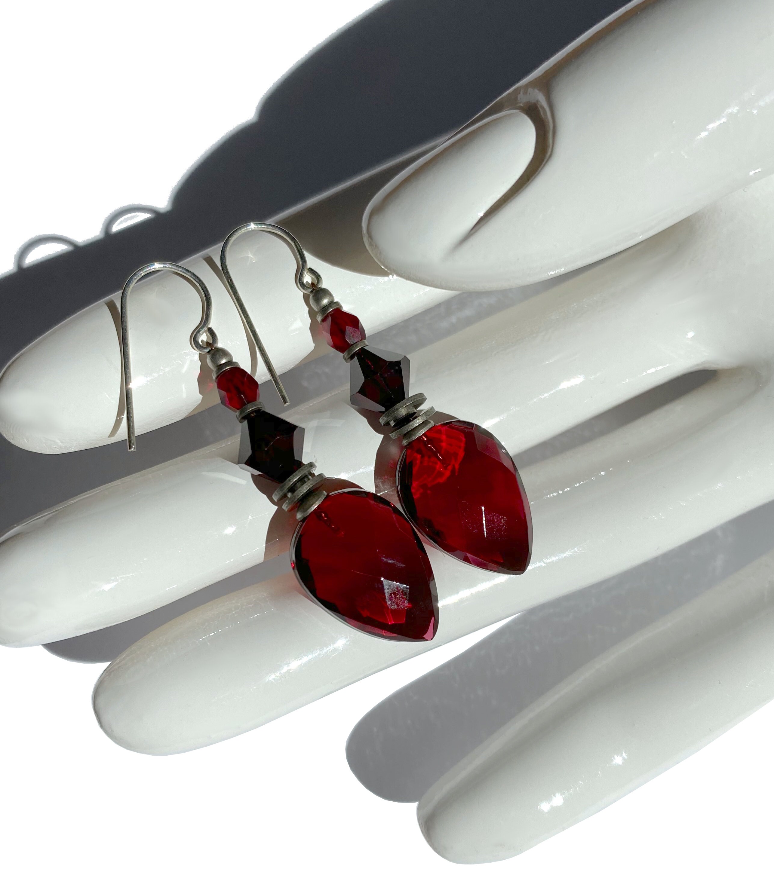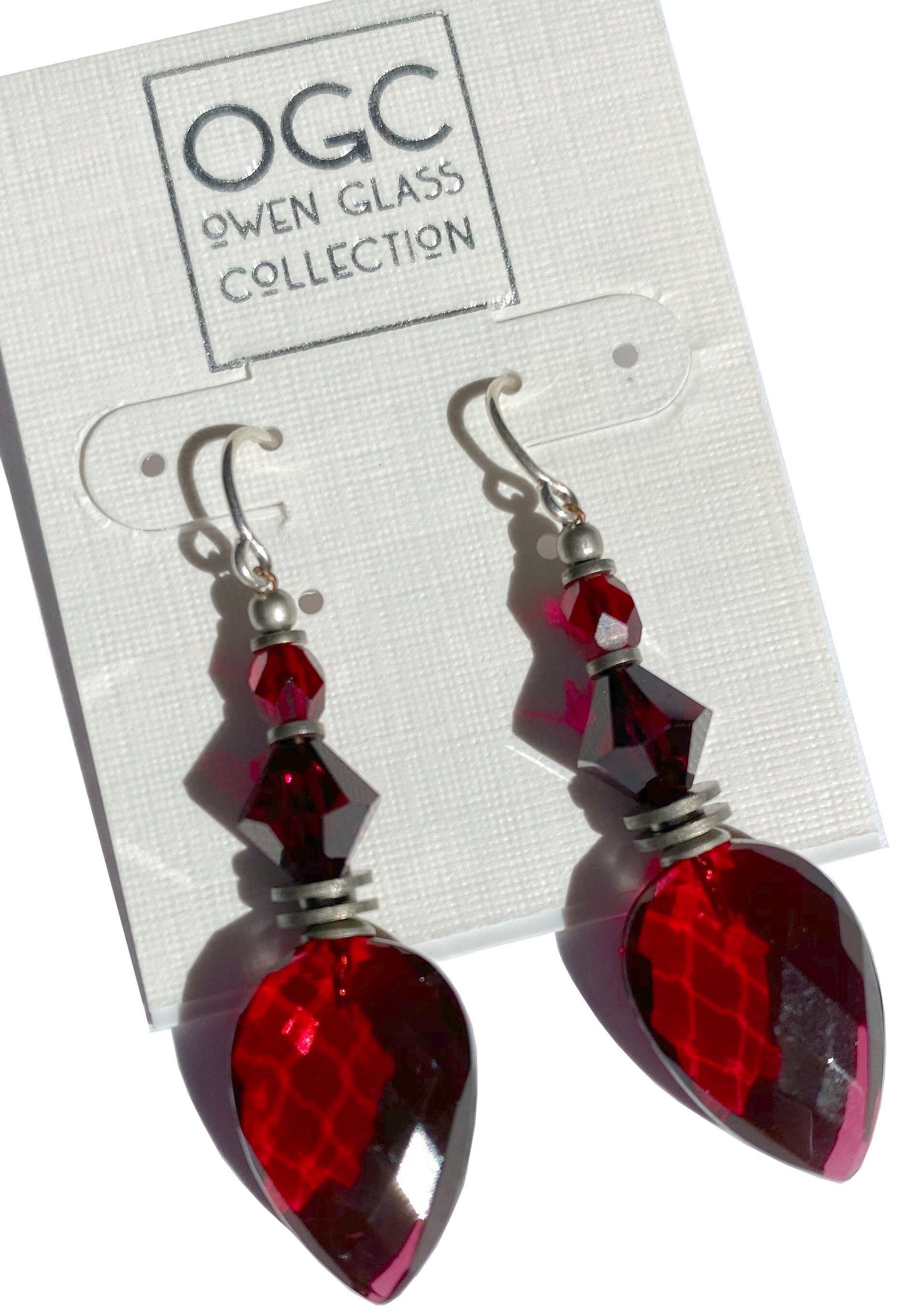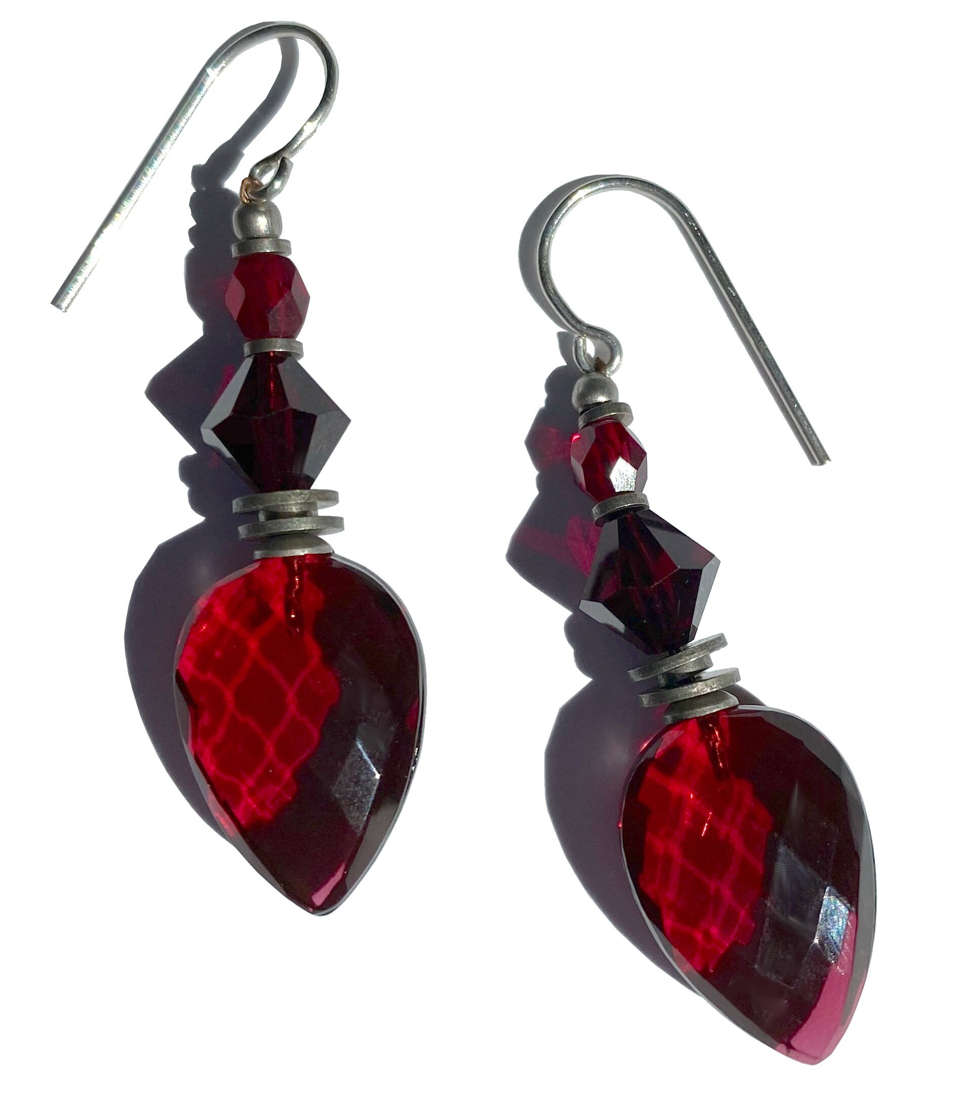 Faceted garnet glass drops, designed by Allen Owen and made for us in Germany. Austrian crystal focal accents with Czechoslovakian glass top beads. Style 504 earrings measure 1 1/2 inches long. Ear wires are sterling silver. Metal trim is antiqued silver overlay on bronze, from our own tooling. All handwork done in the USA.