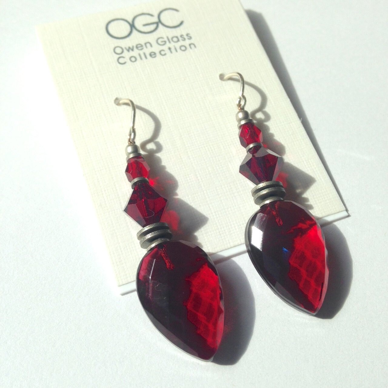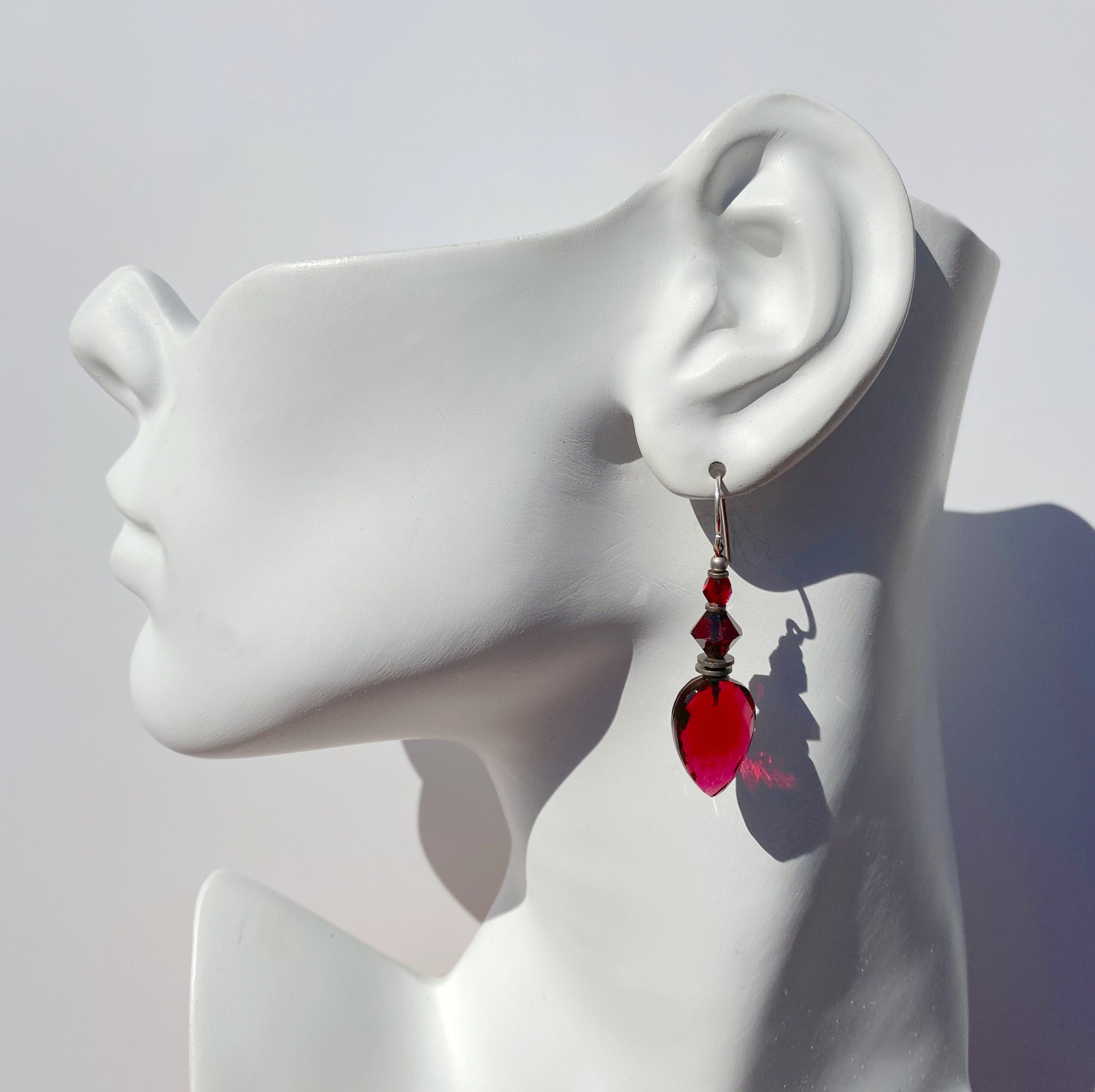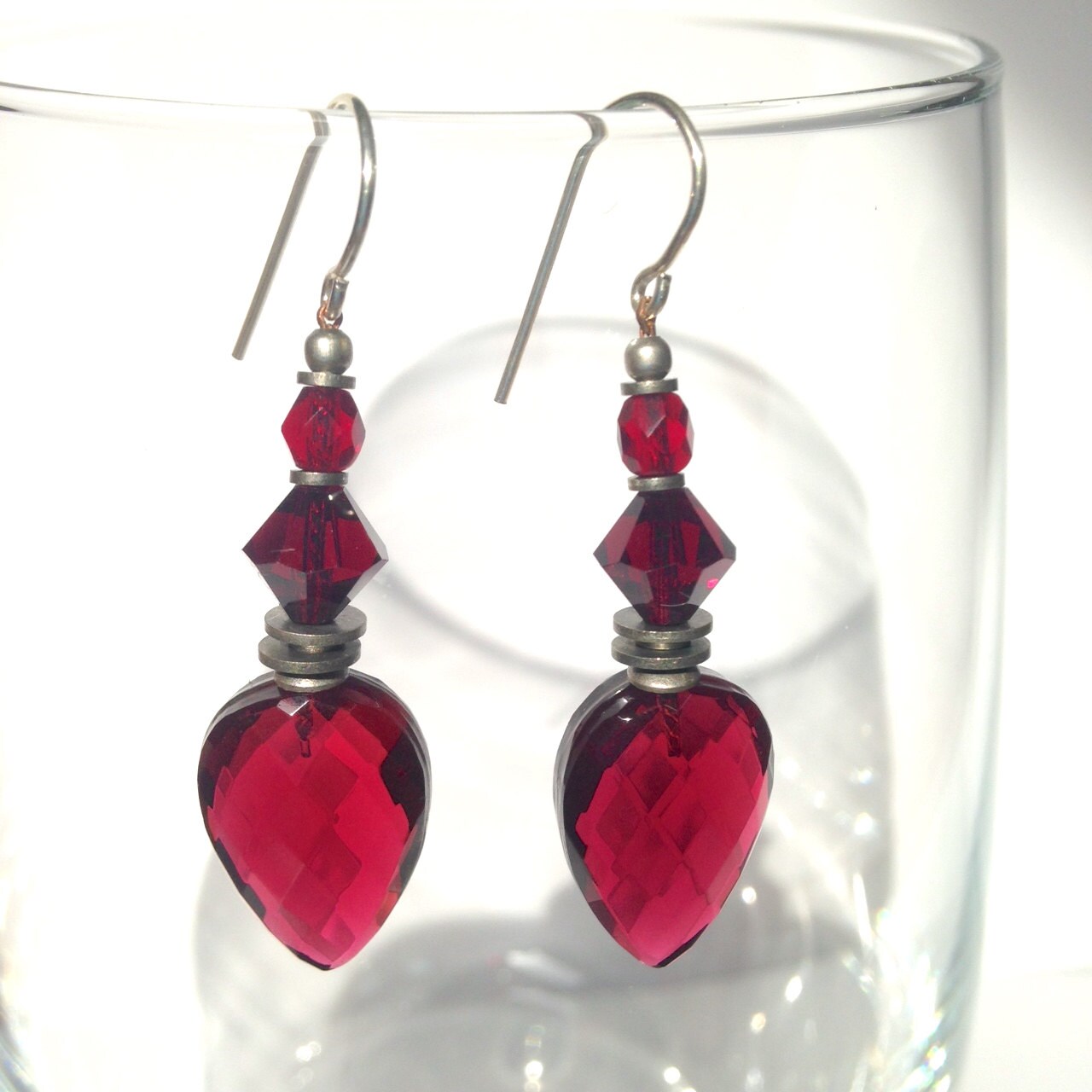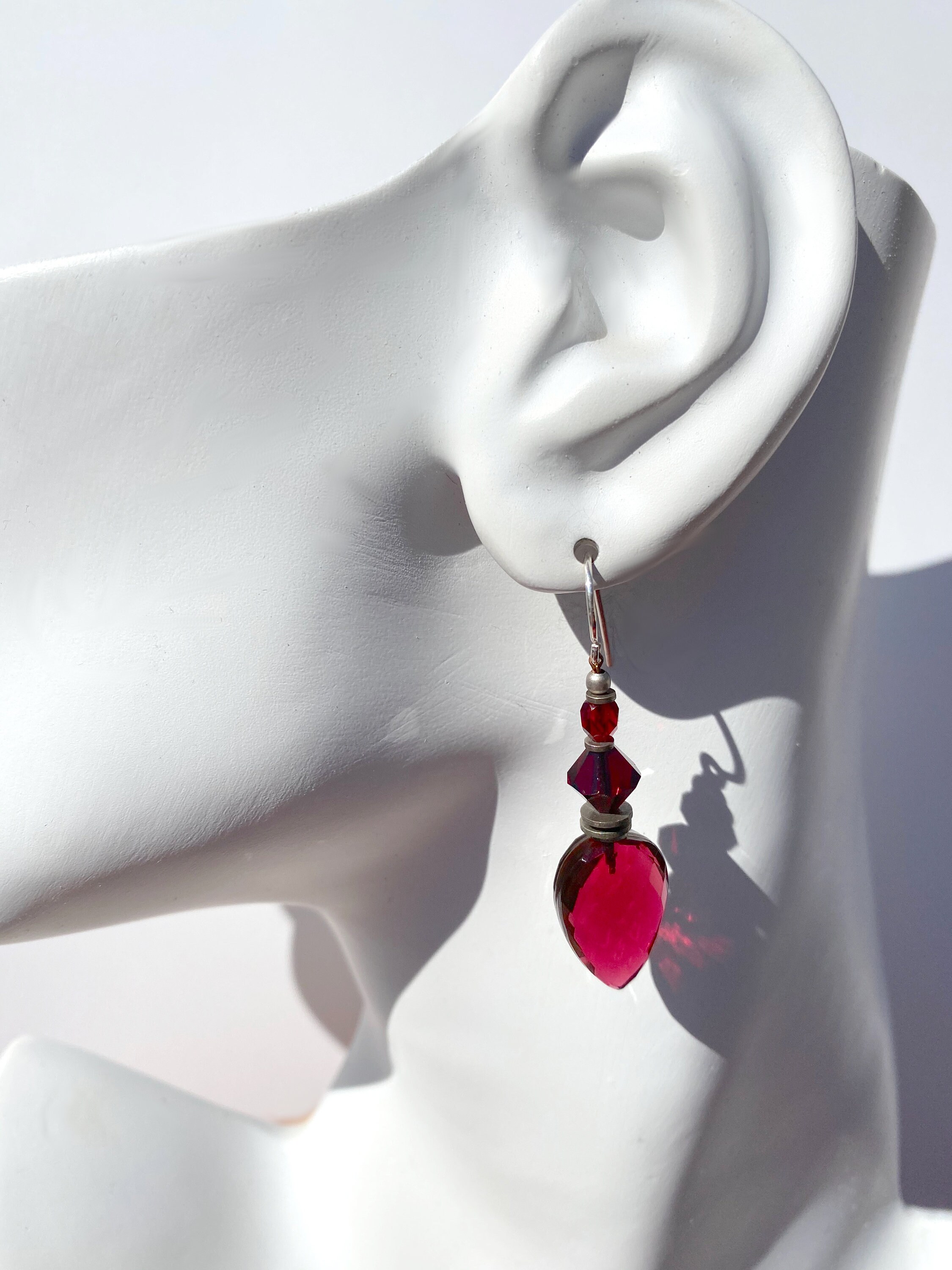 Faceted garnet glass drops, designed by Allen Owen and made for us in Germany. Austrian crystal focal accents with Czechoslovakian glass top beads. Style 504 earrings measure 1 1/2 inches long. Ear wires are sterling silver. Metal trim is antiqued silver overlay on bronze, from our own tooling. All handwork done in the USA.