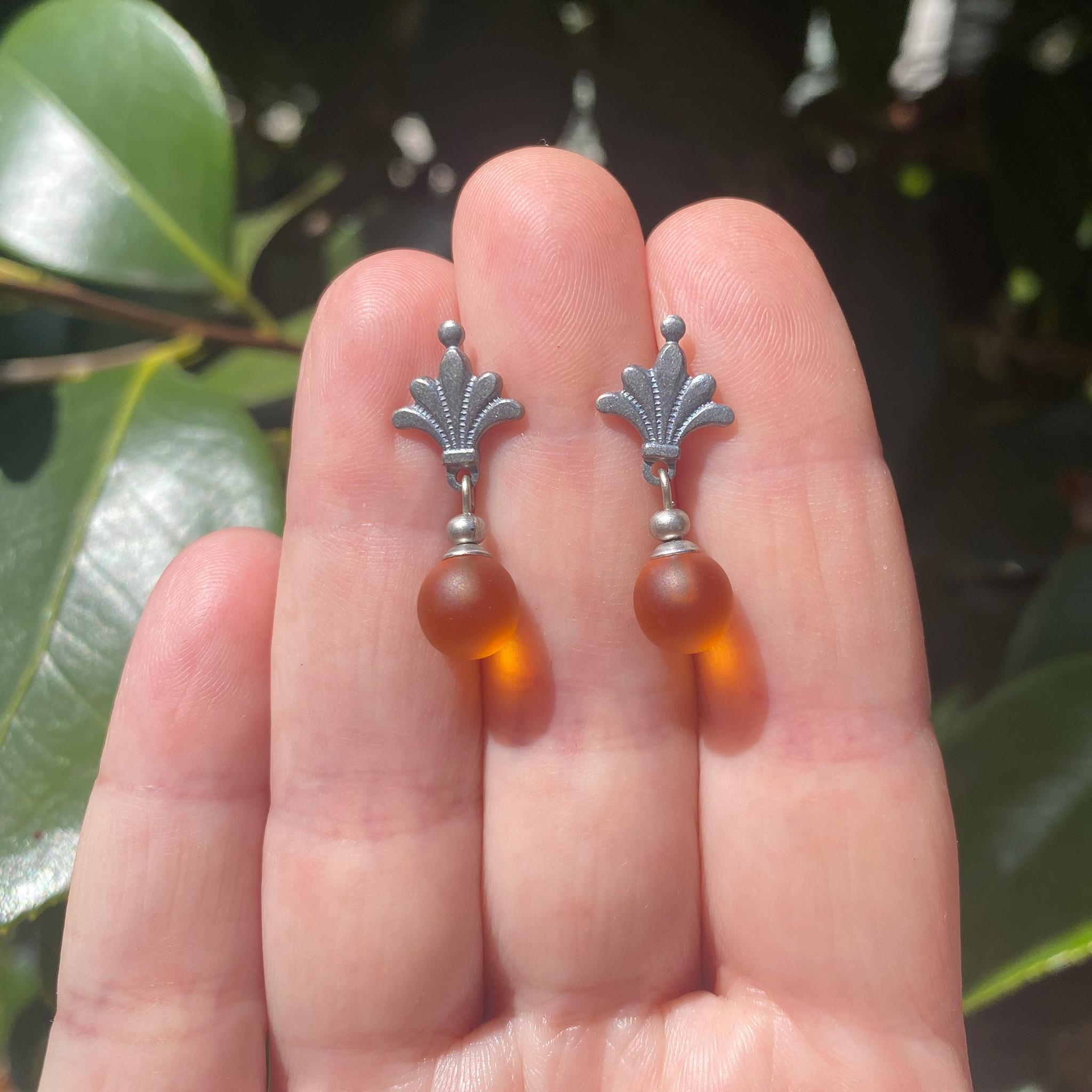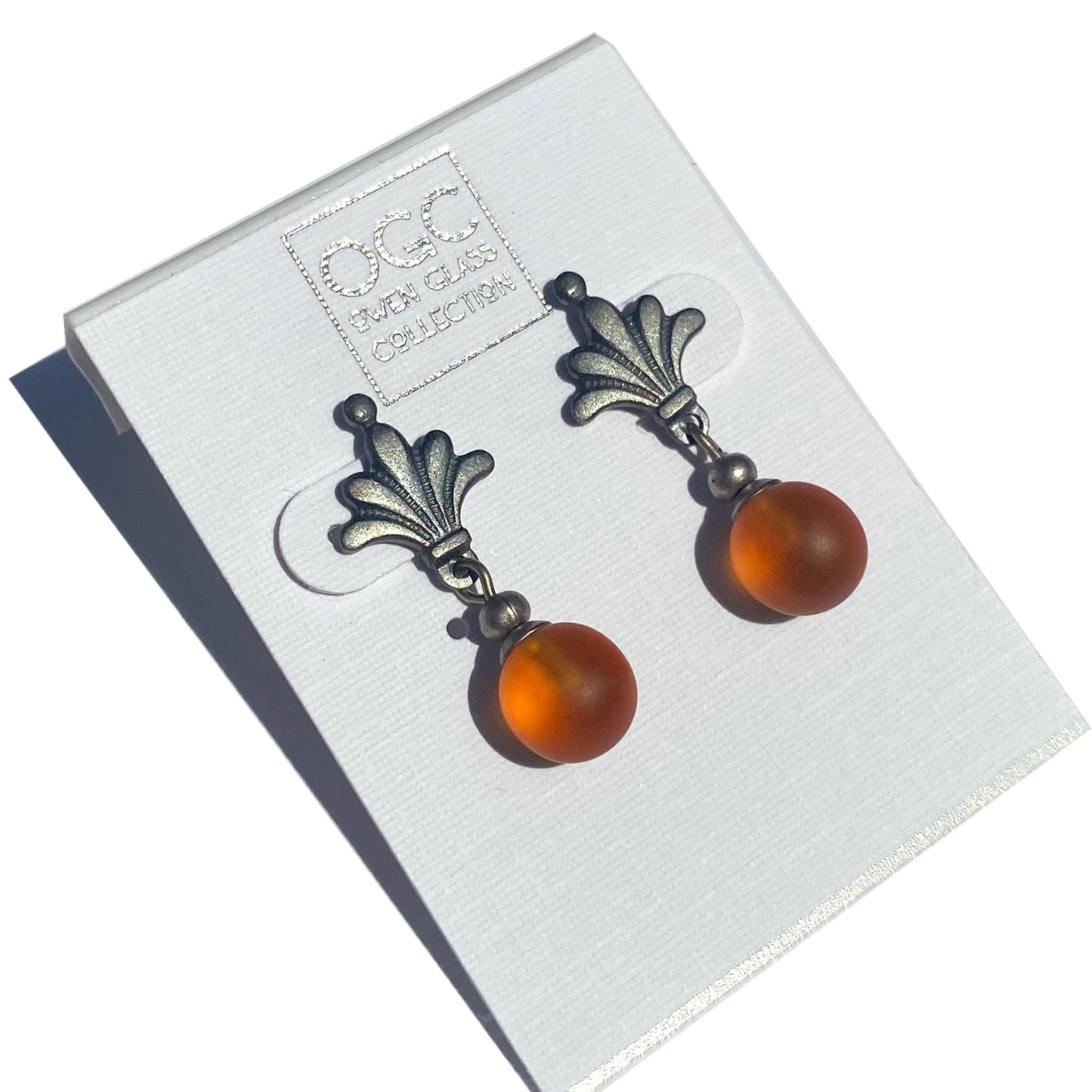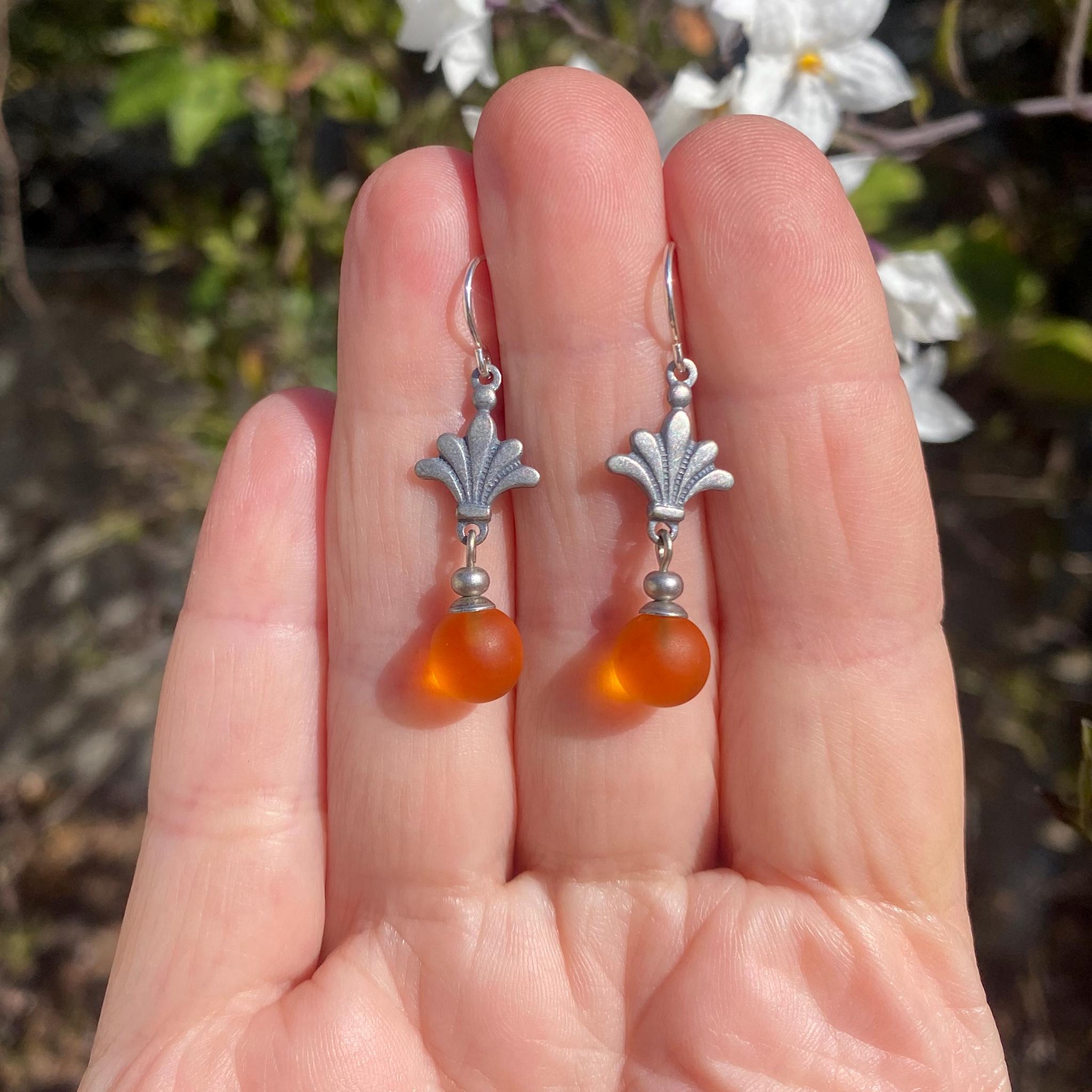 Frosted topaz earrings. German glass frosted orange drops, from our collection, designed by Allen Owen. Antiqued silver dipped filigree with stainless steel posts or sterling silver earwires. "Deco Drops 1" earrings measure 1 inch long. All handwork done in the USA.