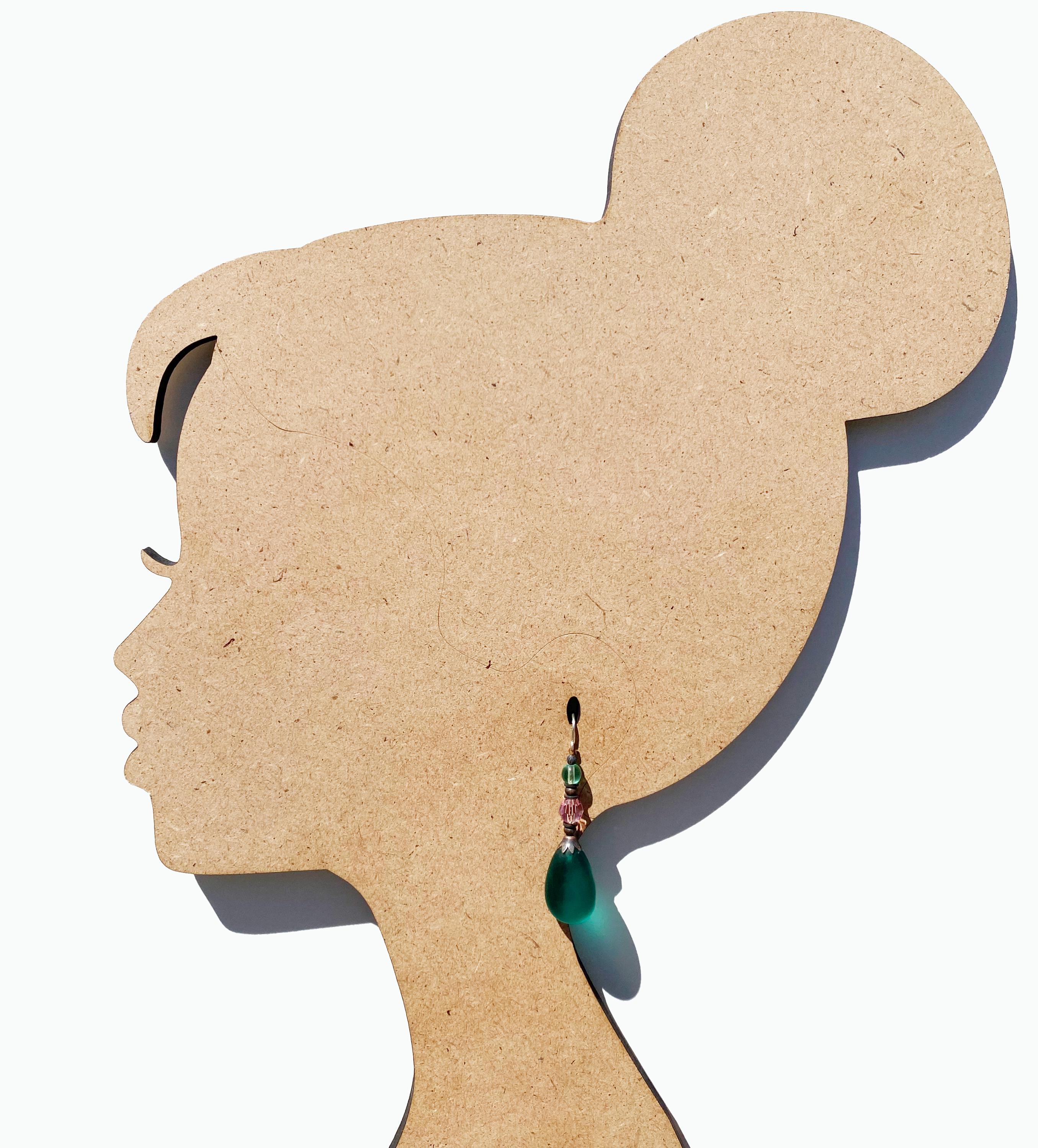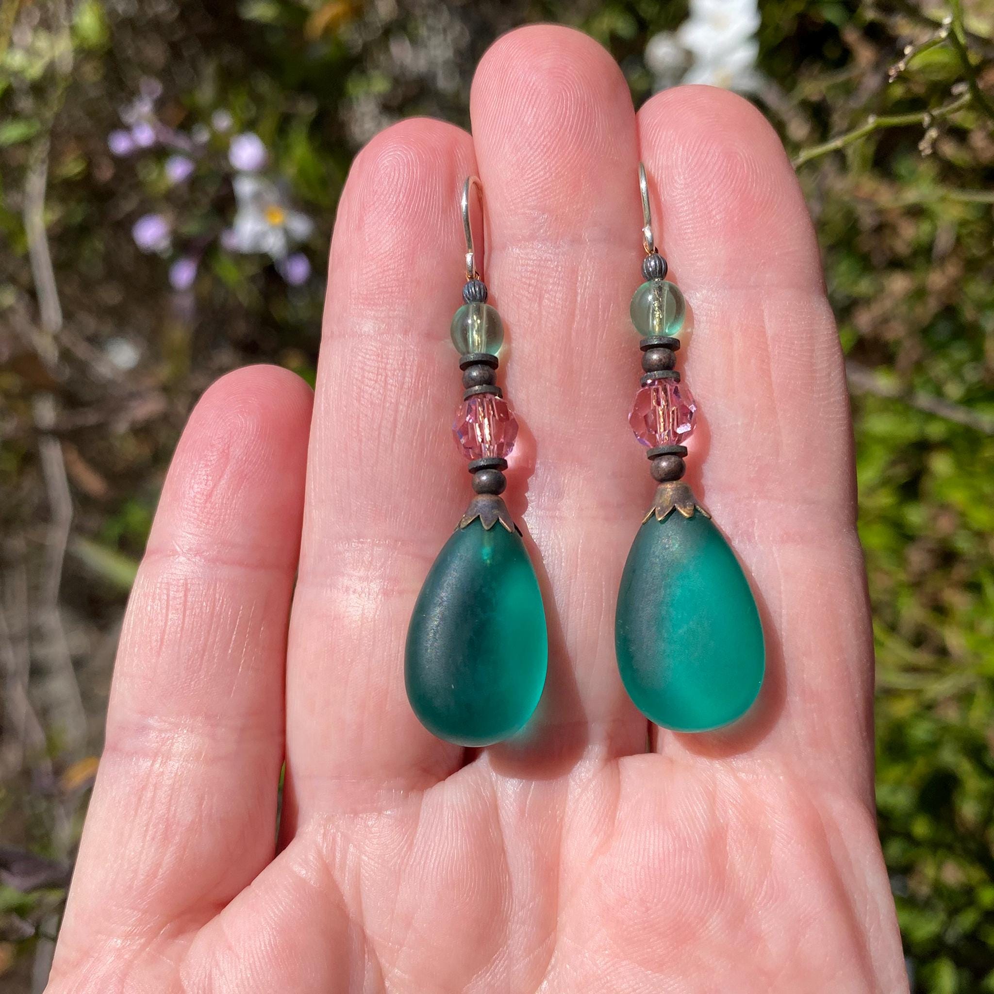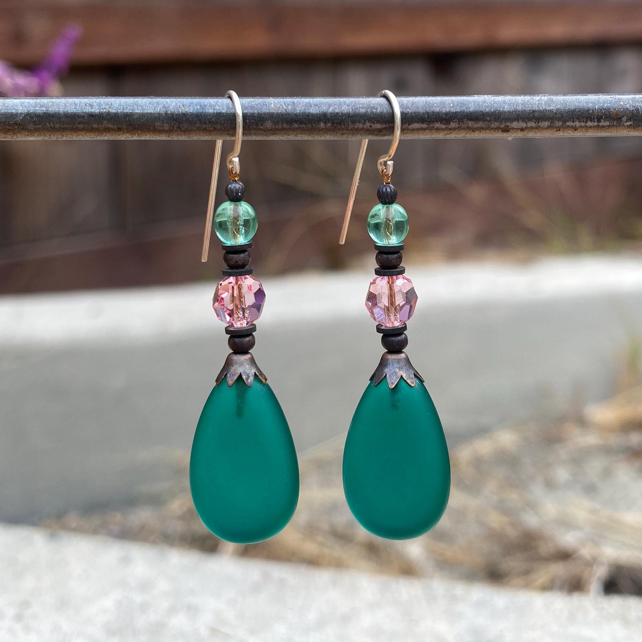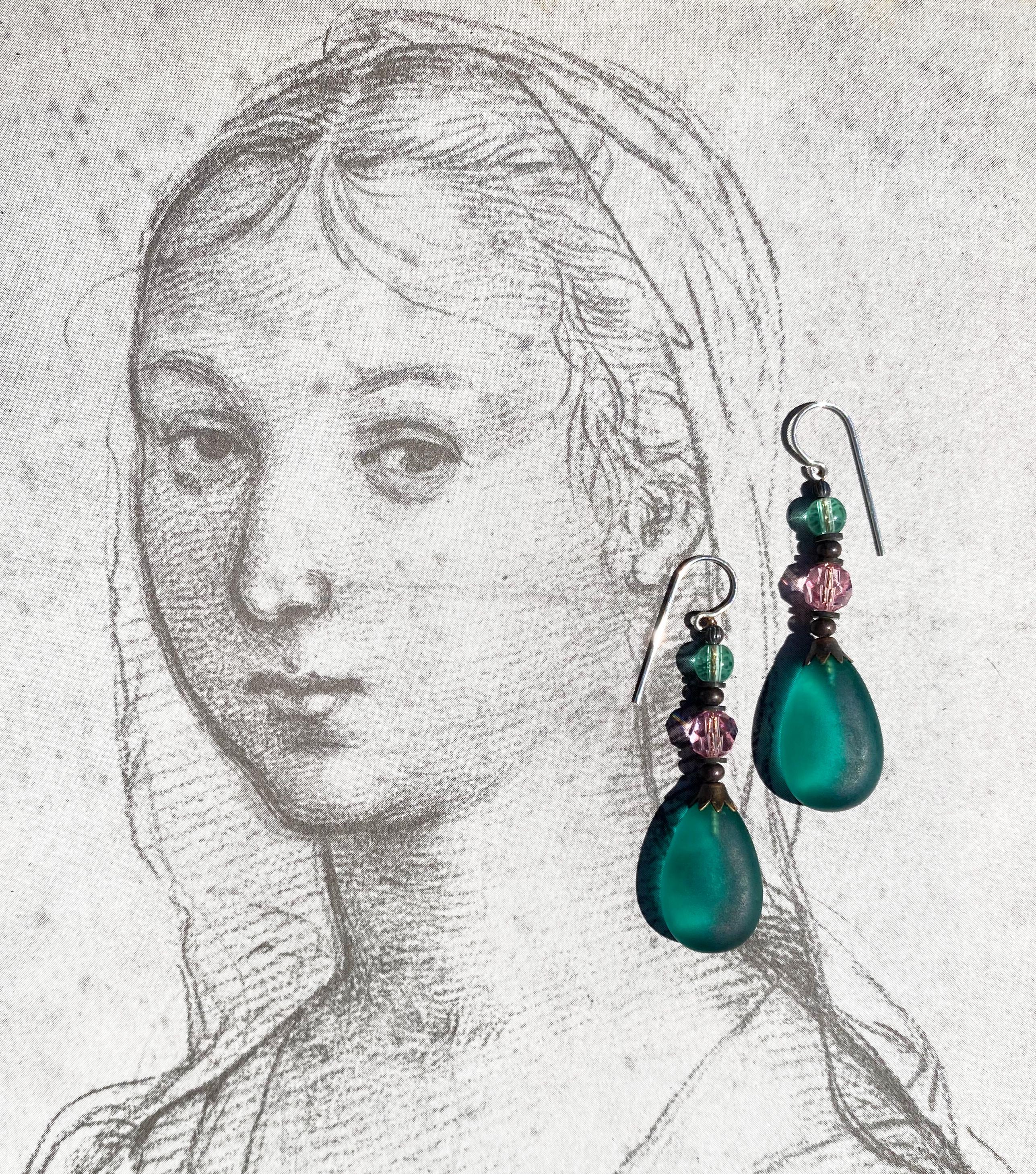 Frosted teal glass earrings. German glass, from our collection, from antique Art Deco era molds. Pink Austrian crystal accents with peridot Czech glass top beads. Metal trim is antiqued bronze, from our own tooling. Style 451 earrings measure 1 3/4 inches in length. Sterling silver ear wires. All handwork done in the USA.