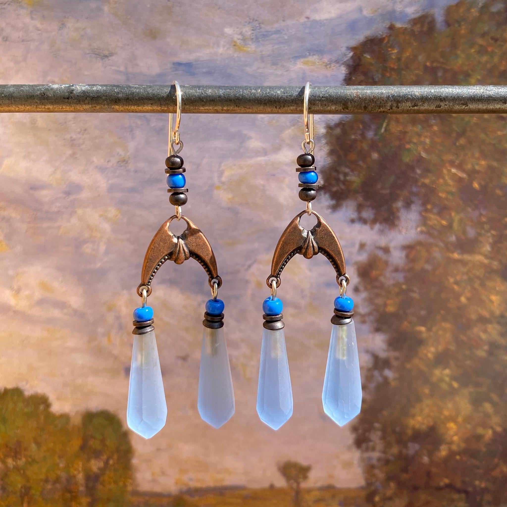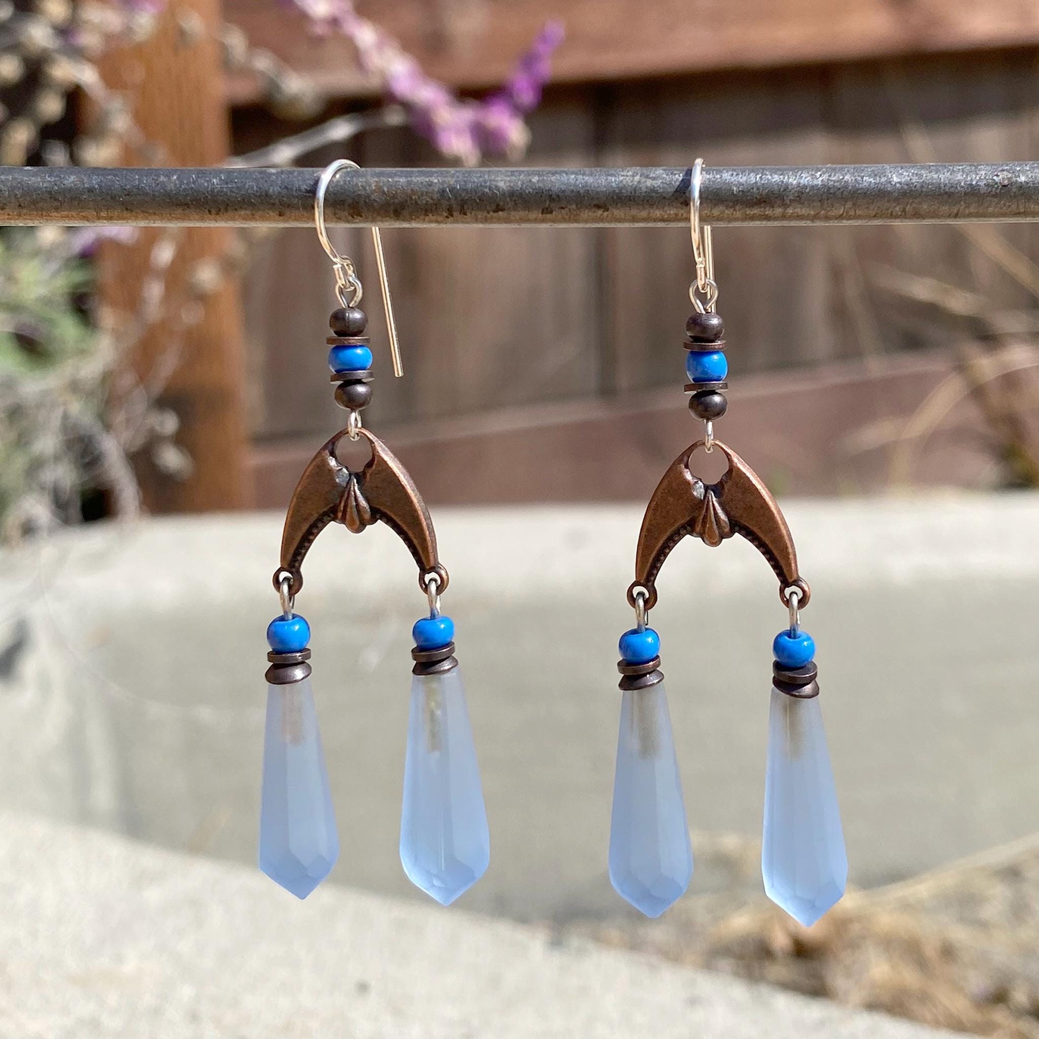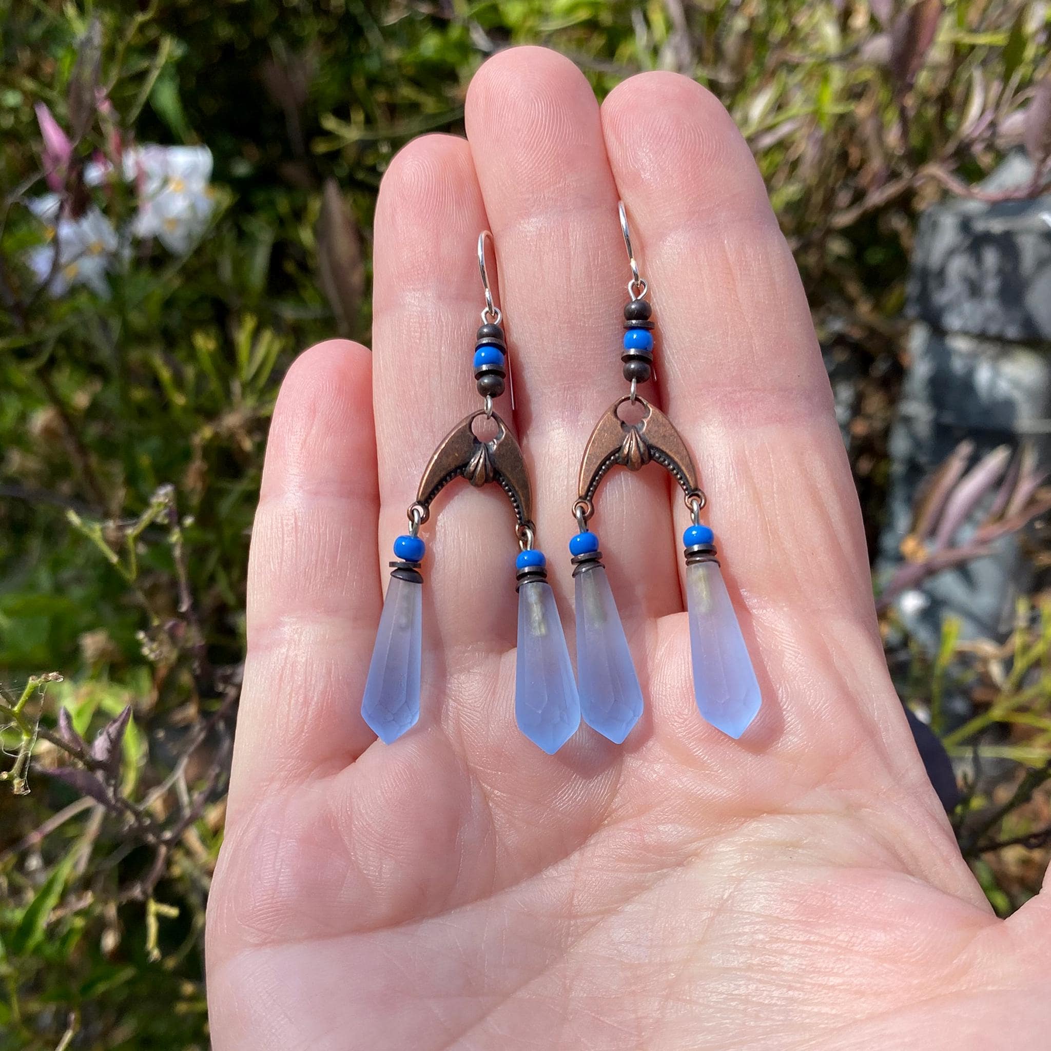 Frosted blue chandelier earrings. Frosted light sapphire Czech glass prisms, circa 1920-1930s, from our collection. Opaque sapphire accents are Czech glass. Metal trim is antiqued bronze with sterling silver ear wires. Style 733b earrings measure 2 inches in length. All handwork done in the USA. One of a kind.