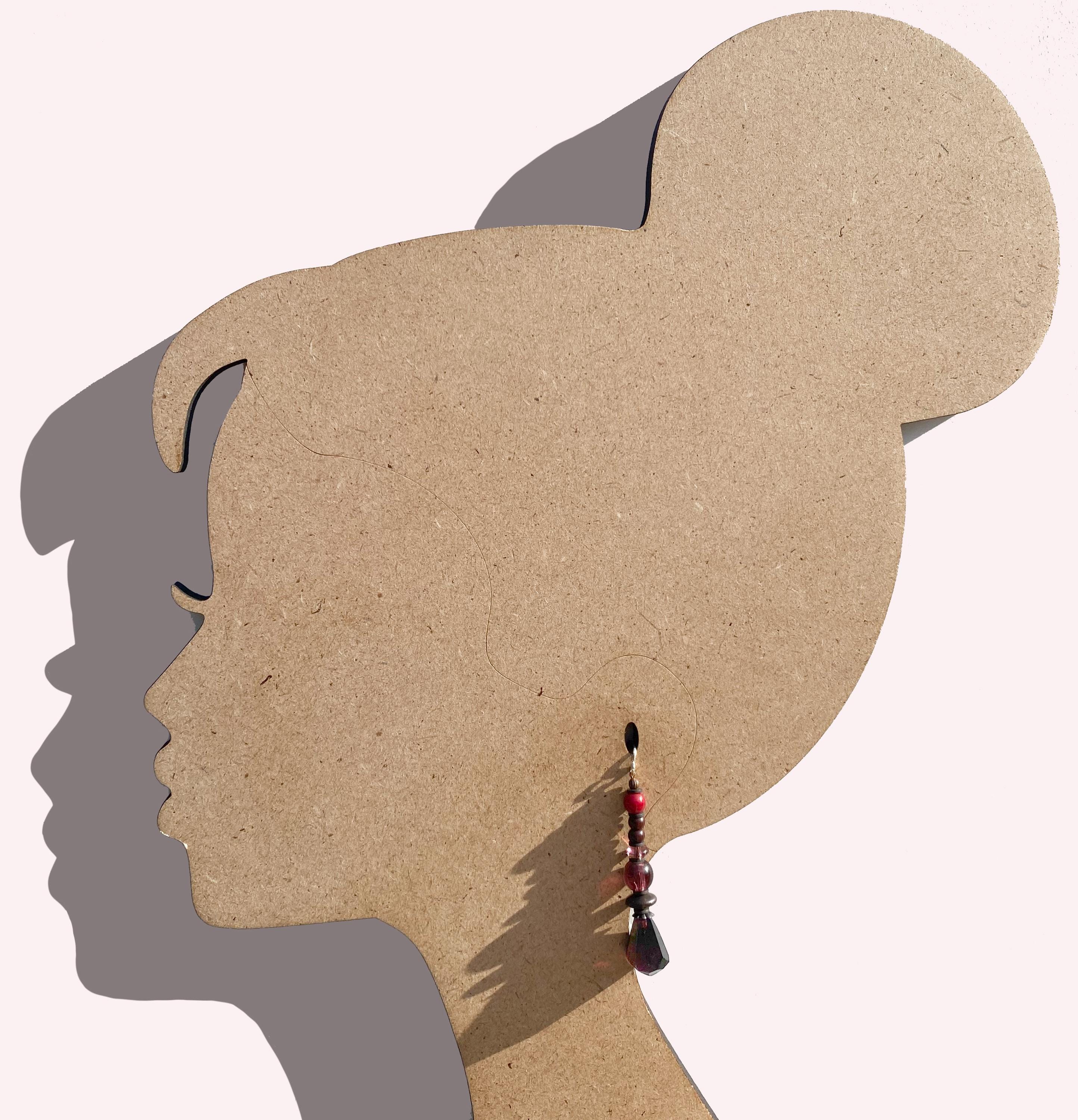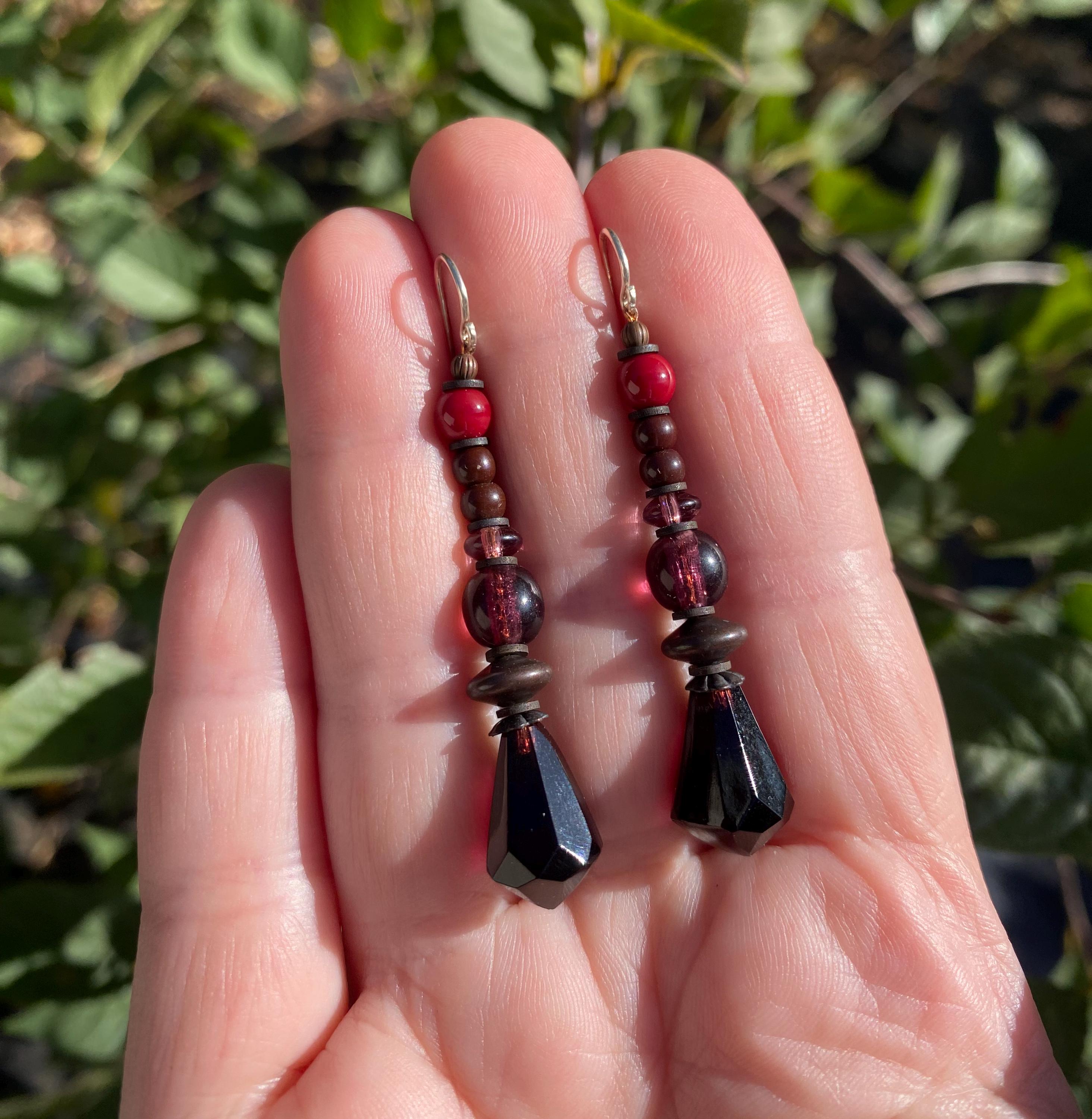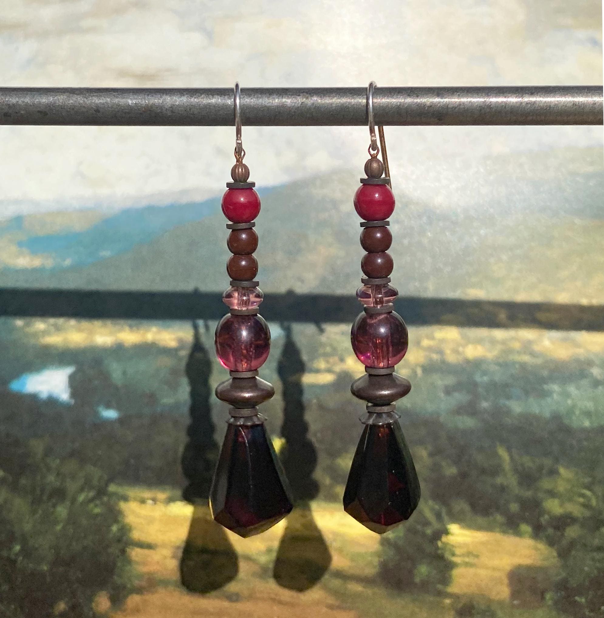 Amethyst glass earrings. Deep purple glass drops, designed by Allen Owen and made for us in Germany. Top beads are Czech glass in shades of amethyst and garnet. Style 425 earrings measure 2 inches long. Metal trim is antiqued bronze with sterling silver ear wires. All handwork done in the USA.
