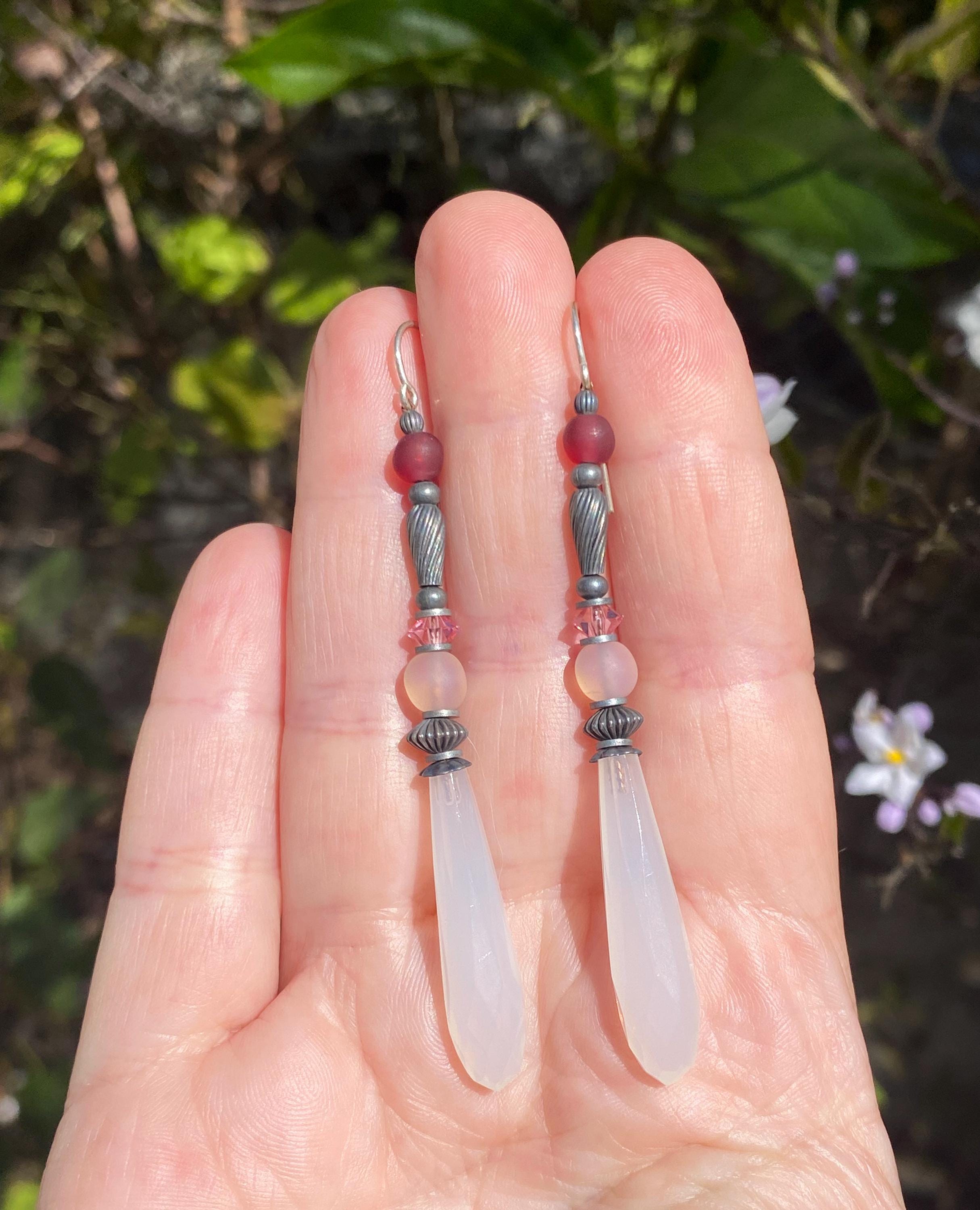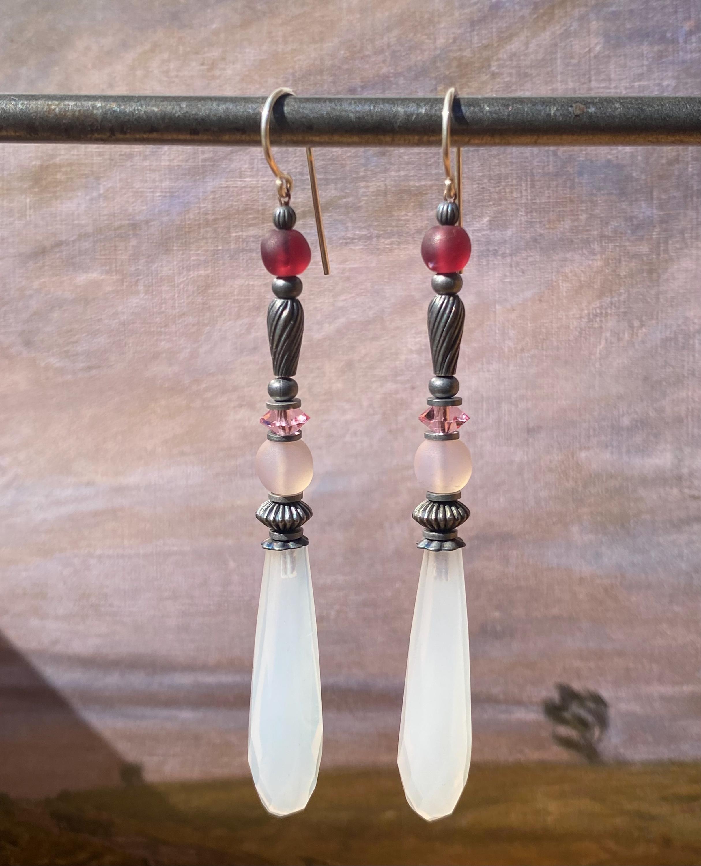 White chandelier earrings. Opaque white prisms, designed by Allen Owen and made for us in Germany. Pink Austrian crystal and frosted rose Czech glass. Antique silver dipped trim with sterling silver ear wires. Style 170 earrings measure 2 3/4 inches long. All handwork done in the USA.