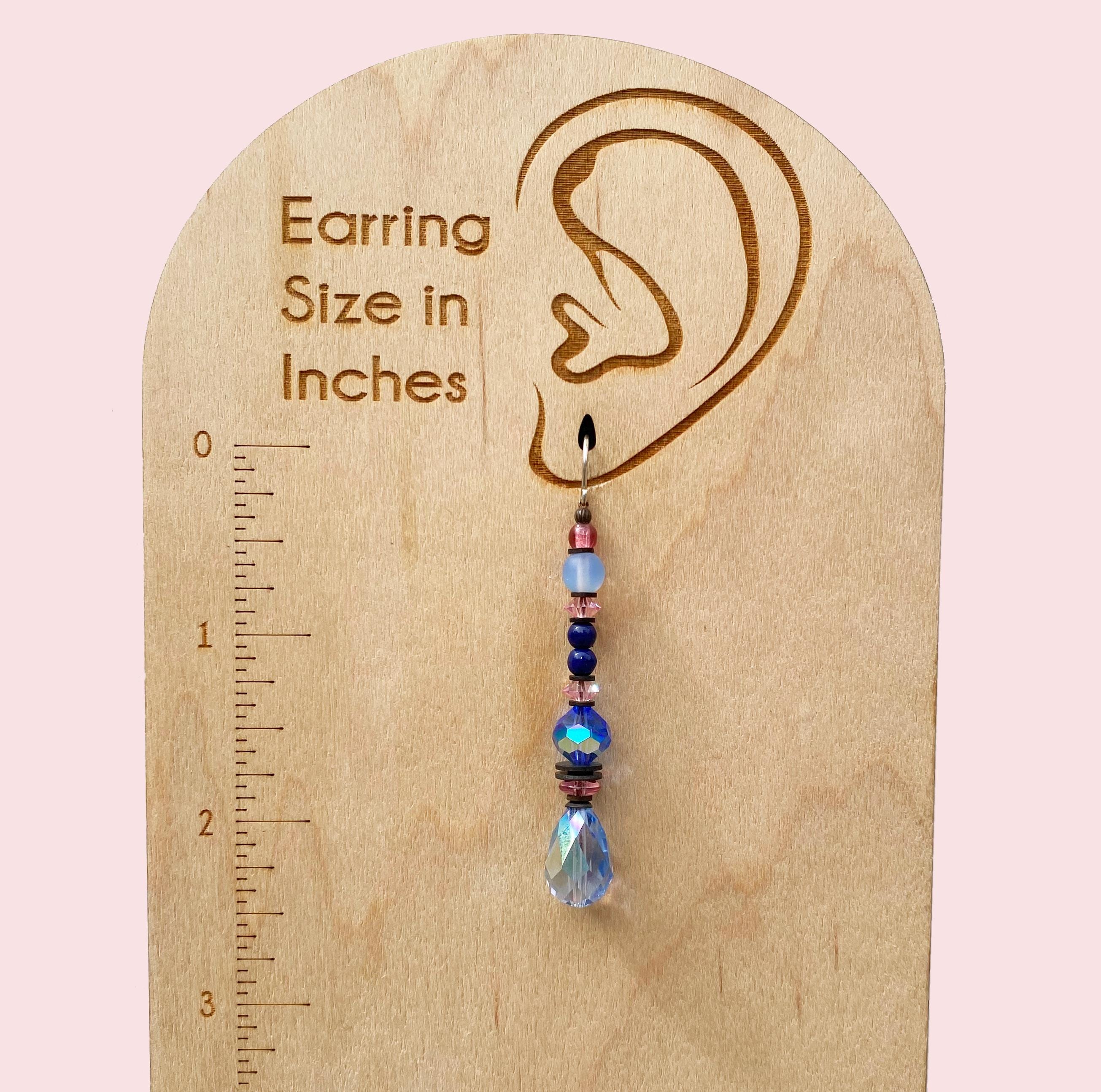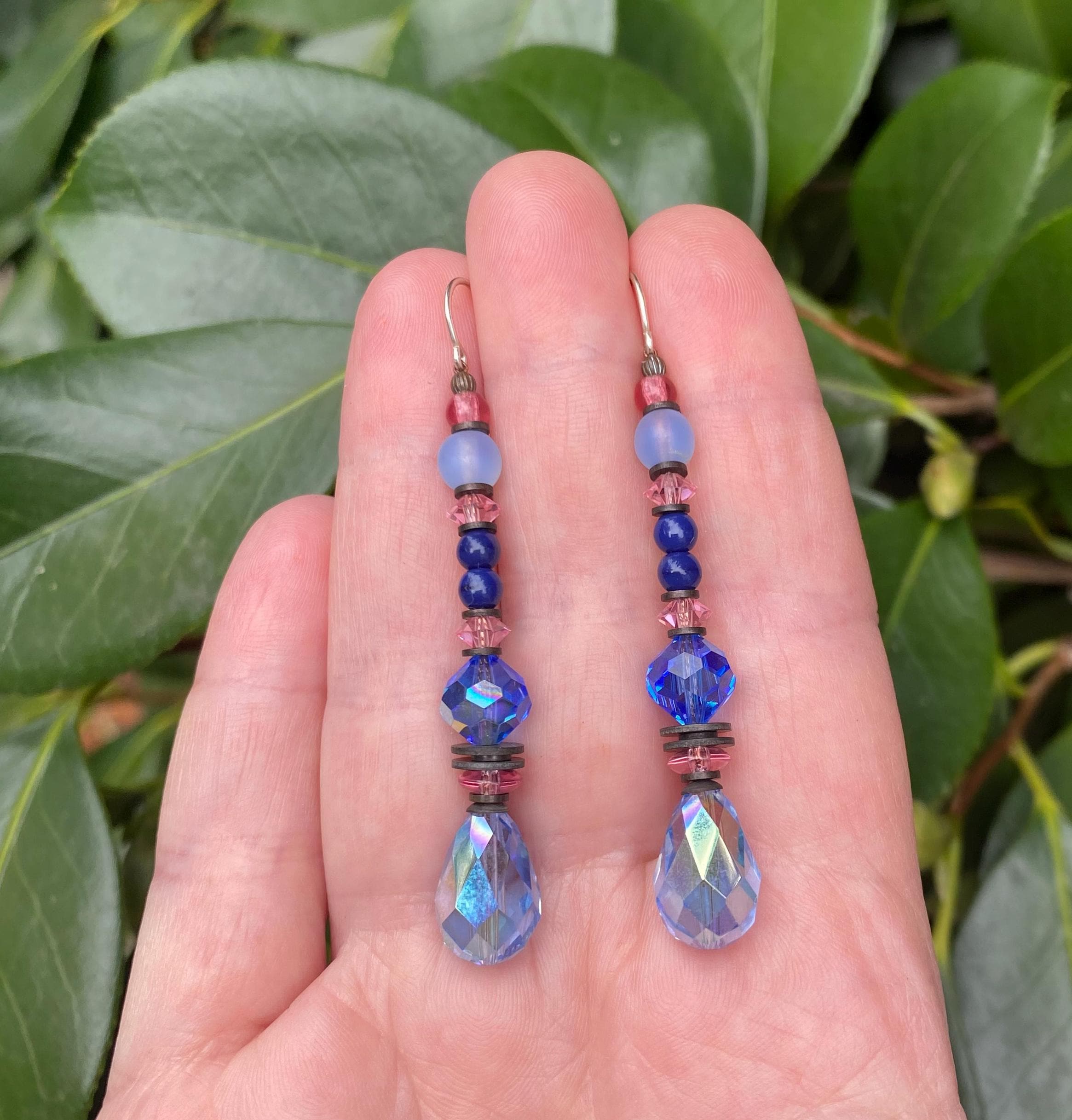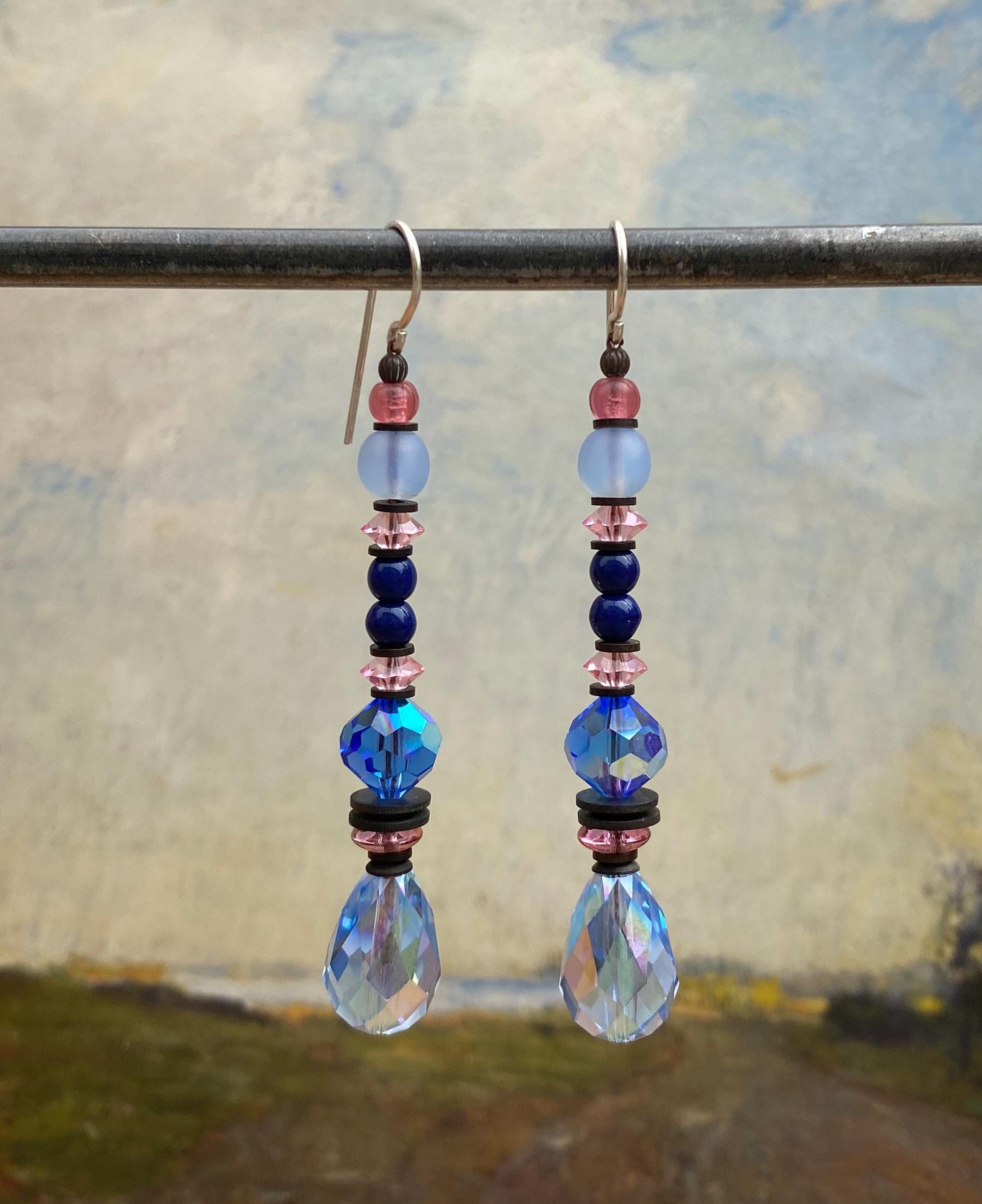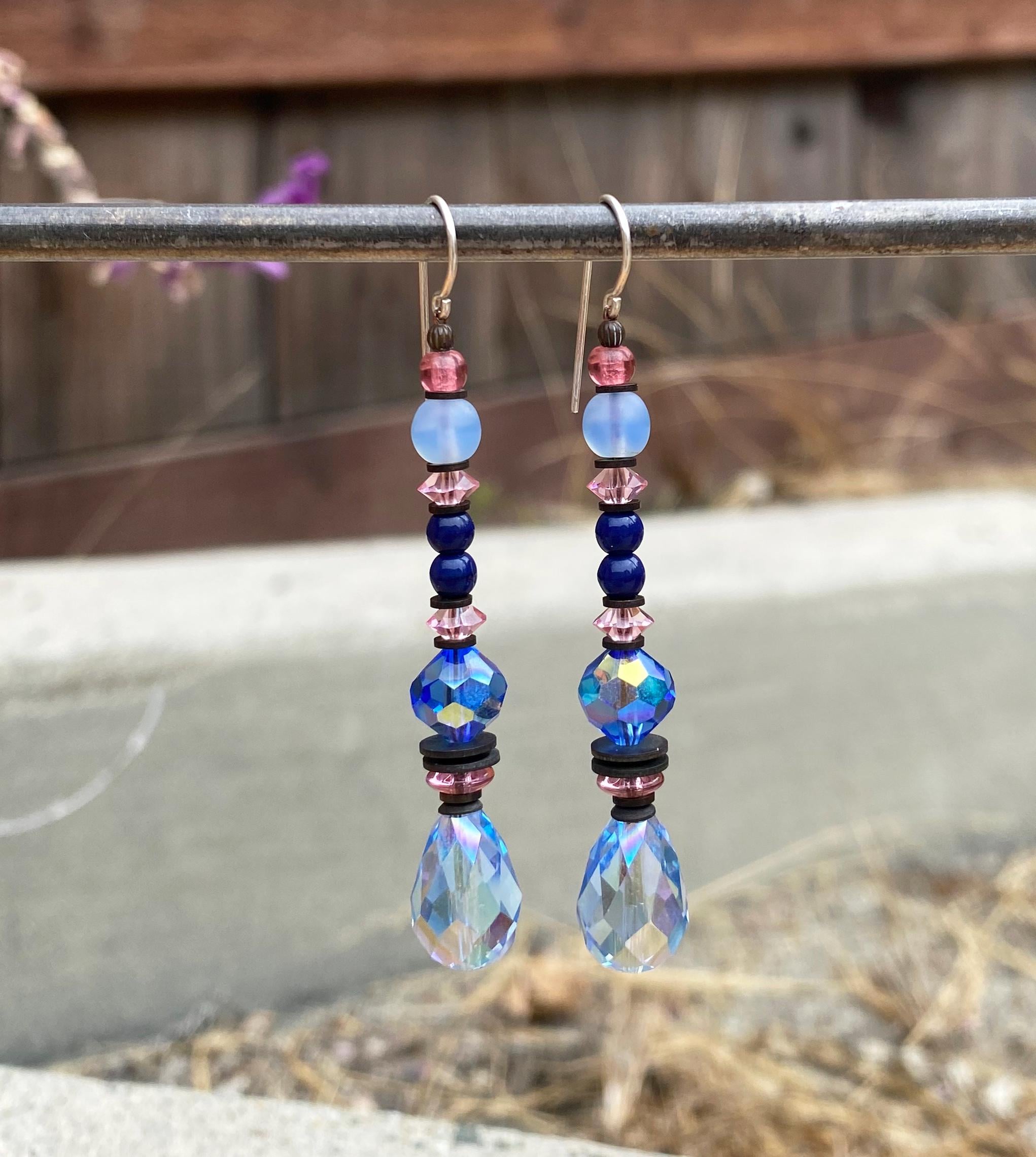 Light sapphire iridescent Austrian crystal earrings. Accents in light sapphire, cobalt and rose pink are Austrian crystal and Czechoslovakian glass. Trim is antiqued bronze, from our own tooling. Sterling silver ear wires. "Sky Patrol" earrings measure 2 1/4 inches in length. All handwork done in the USA.