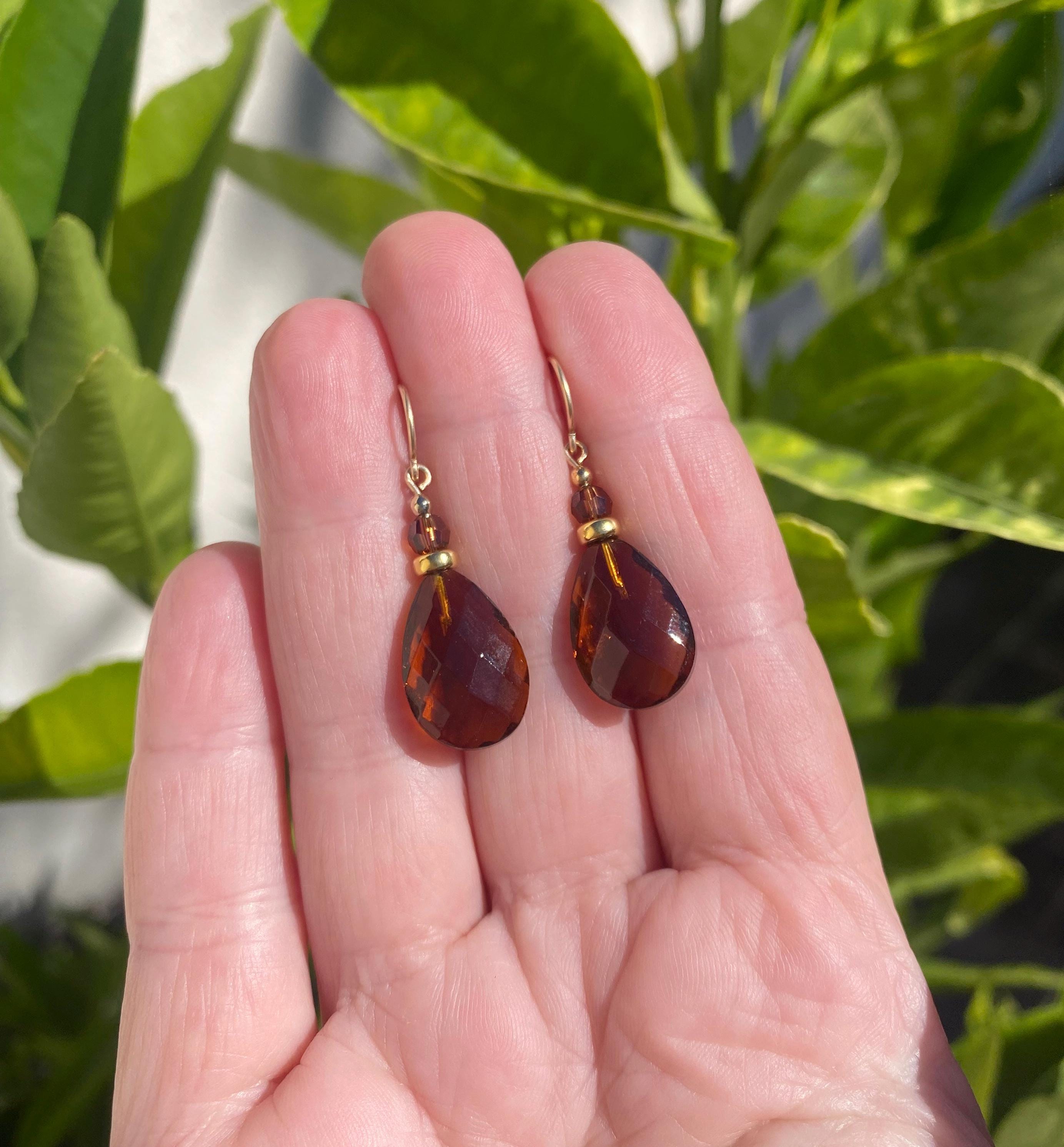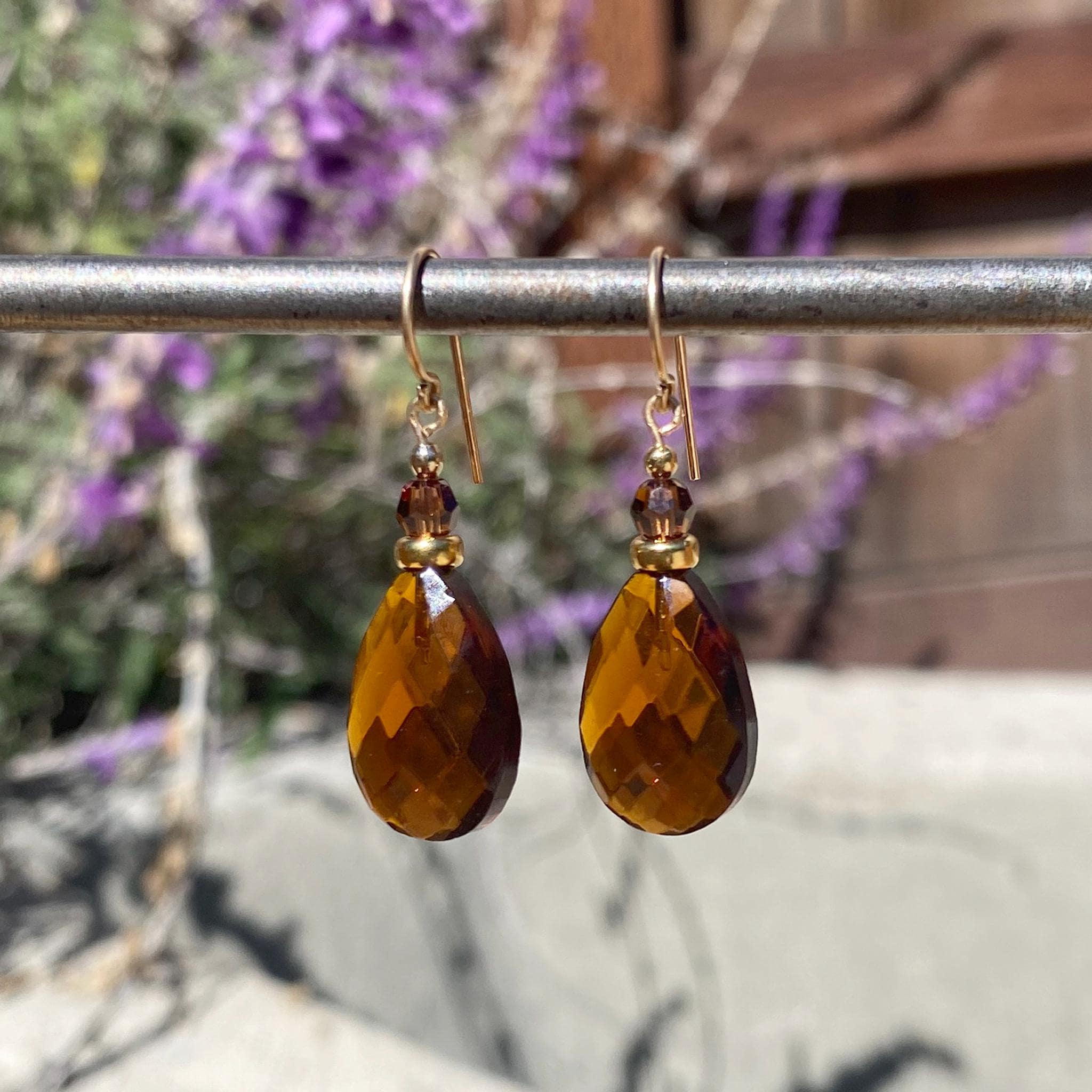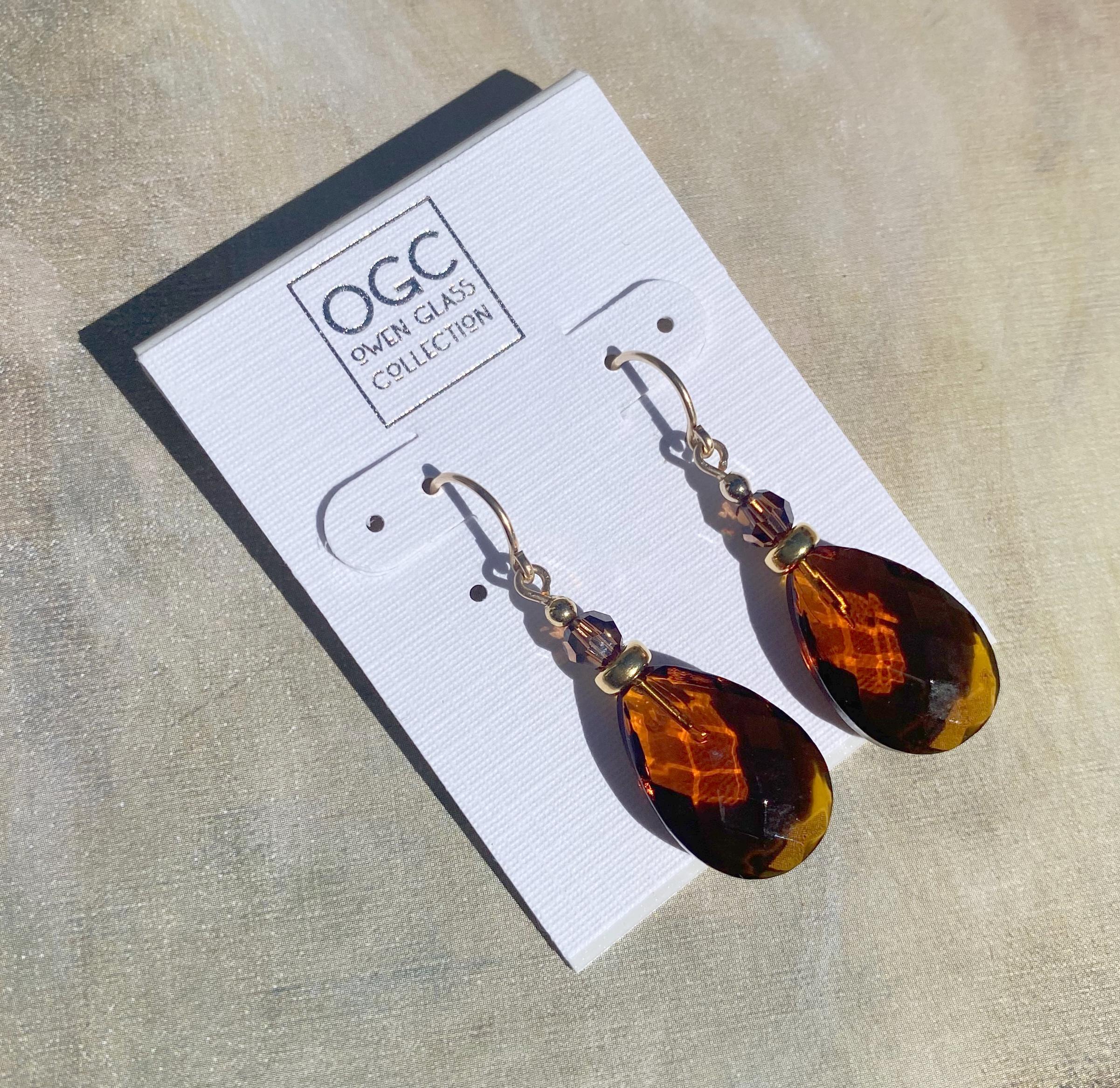 Dark topaz earrings. German glass drops in dark topaz with Austrian crystal top beads. These drops were designed by Allen Owen and made for us in Germany. Earwires are 14-karat gold-filled. "High Street 39" earrings measure 1 1/8 inches long. All handwork done in the USA.