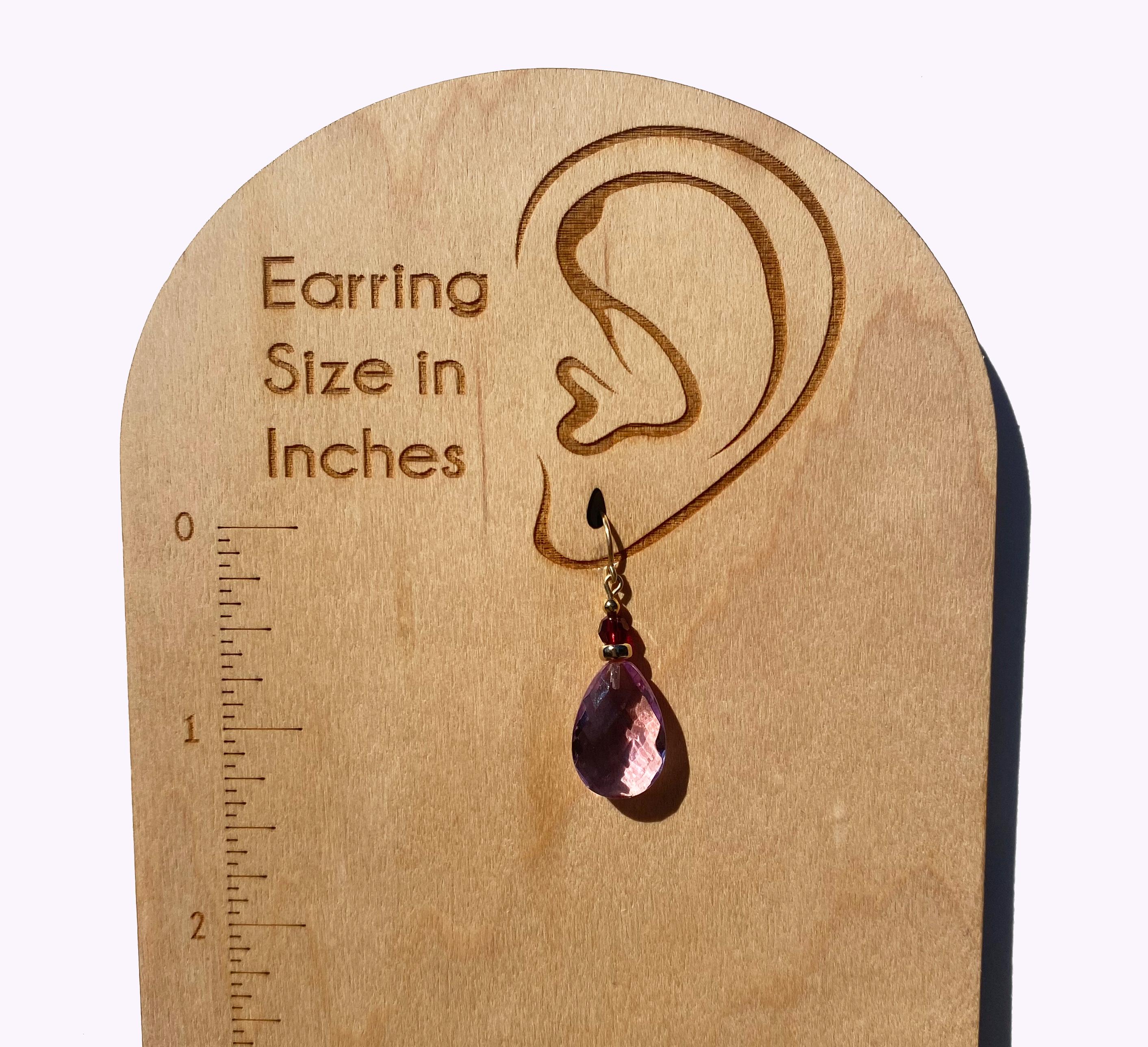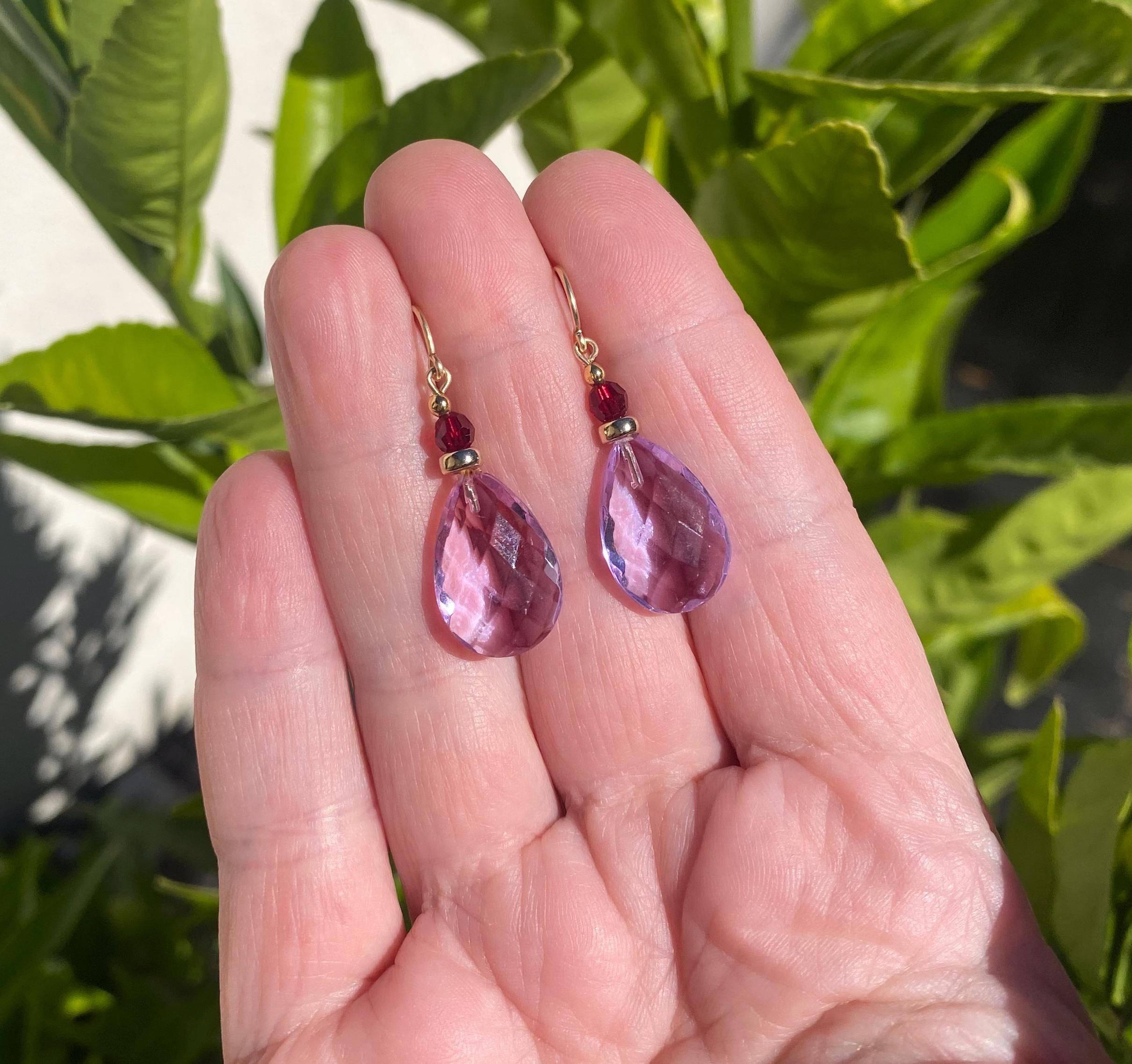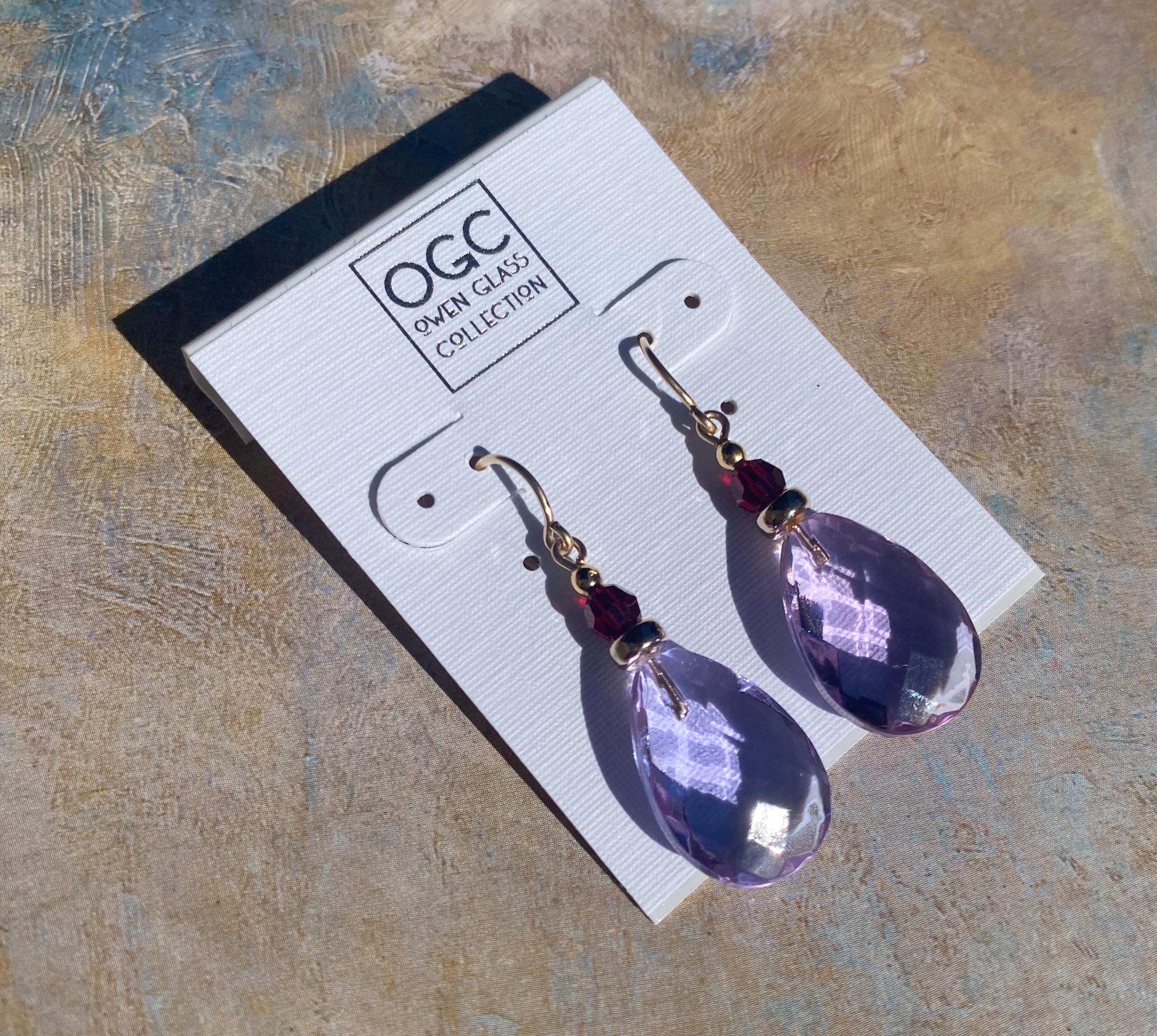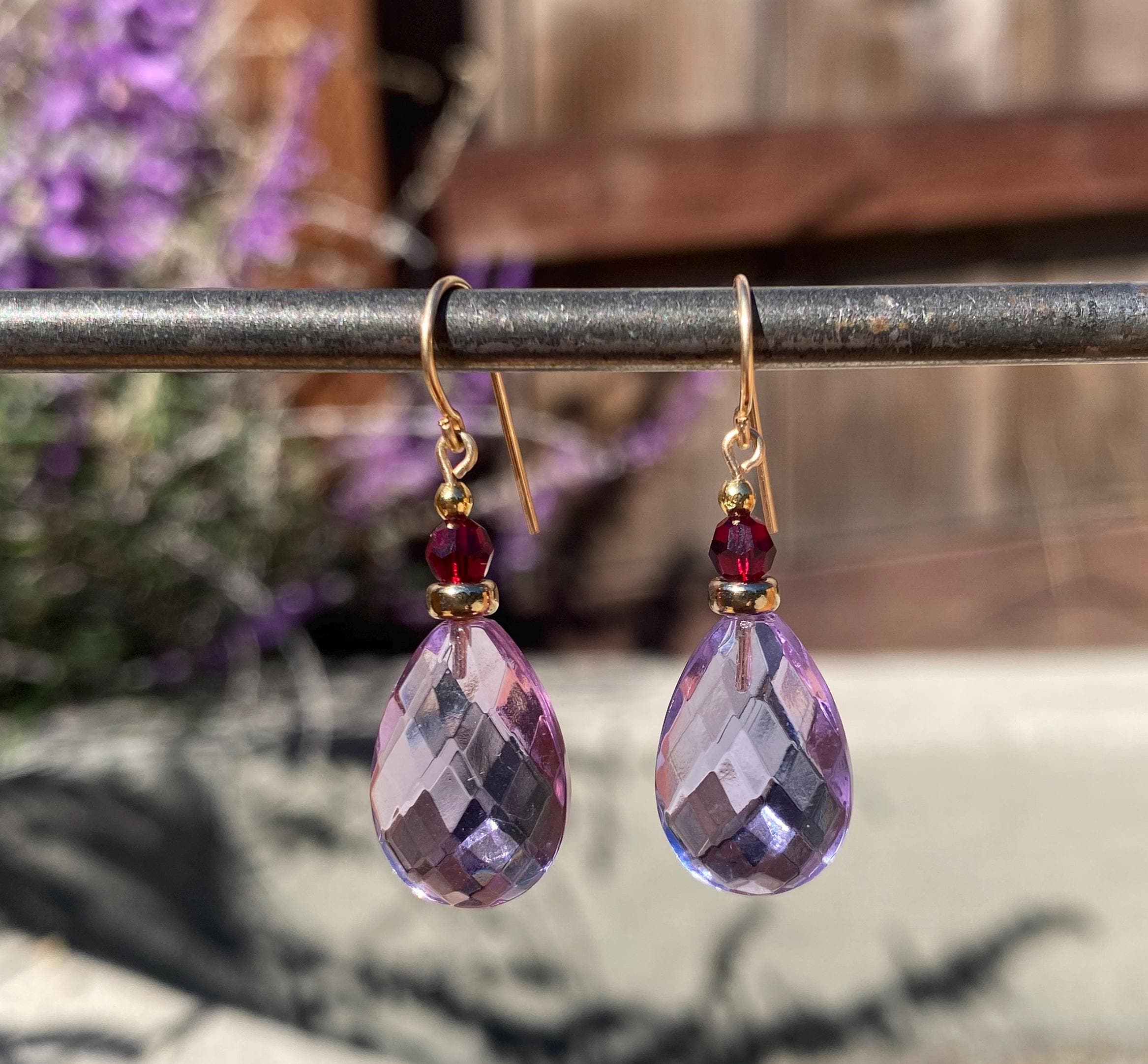 Light amethyst earrings. German glass drops in periwinkle purple with garnet Austrian crystal top beads. These drops were designed by Allen Owen and made for us in Germany. Earwires are 14-karat gold-filled. "High Street 21" earrings measure 1 1/8 inches long. All handwork done in the USA.