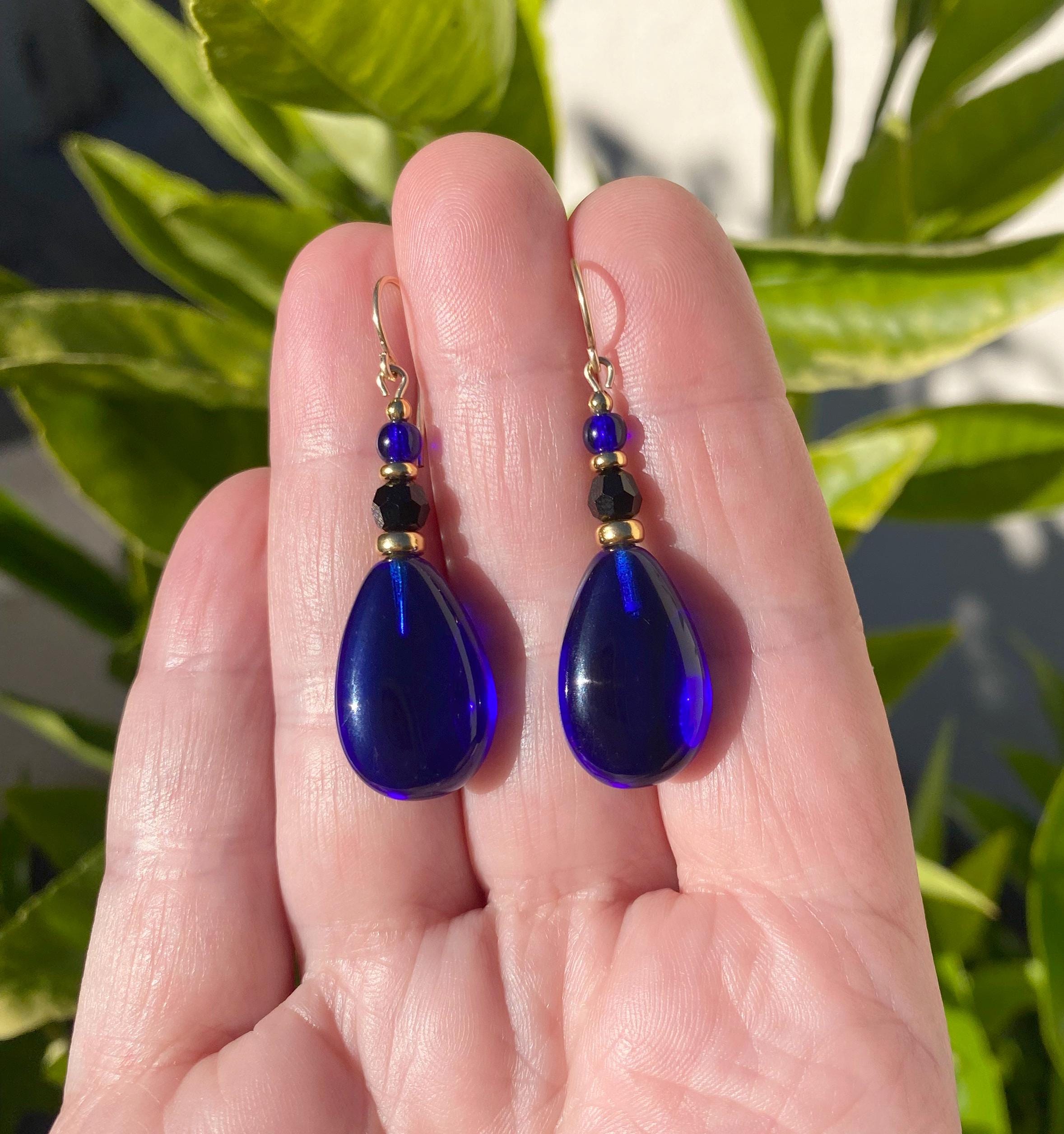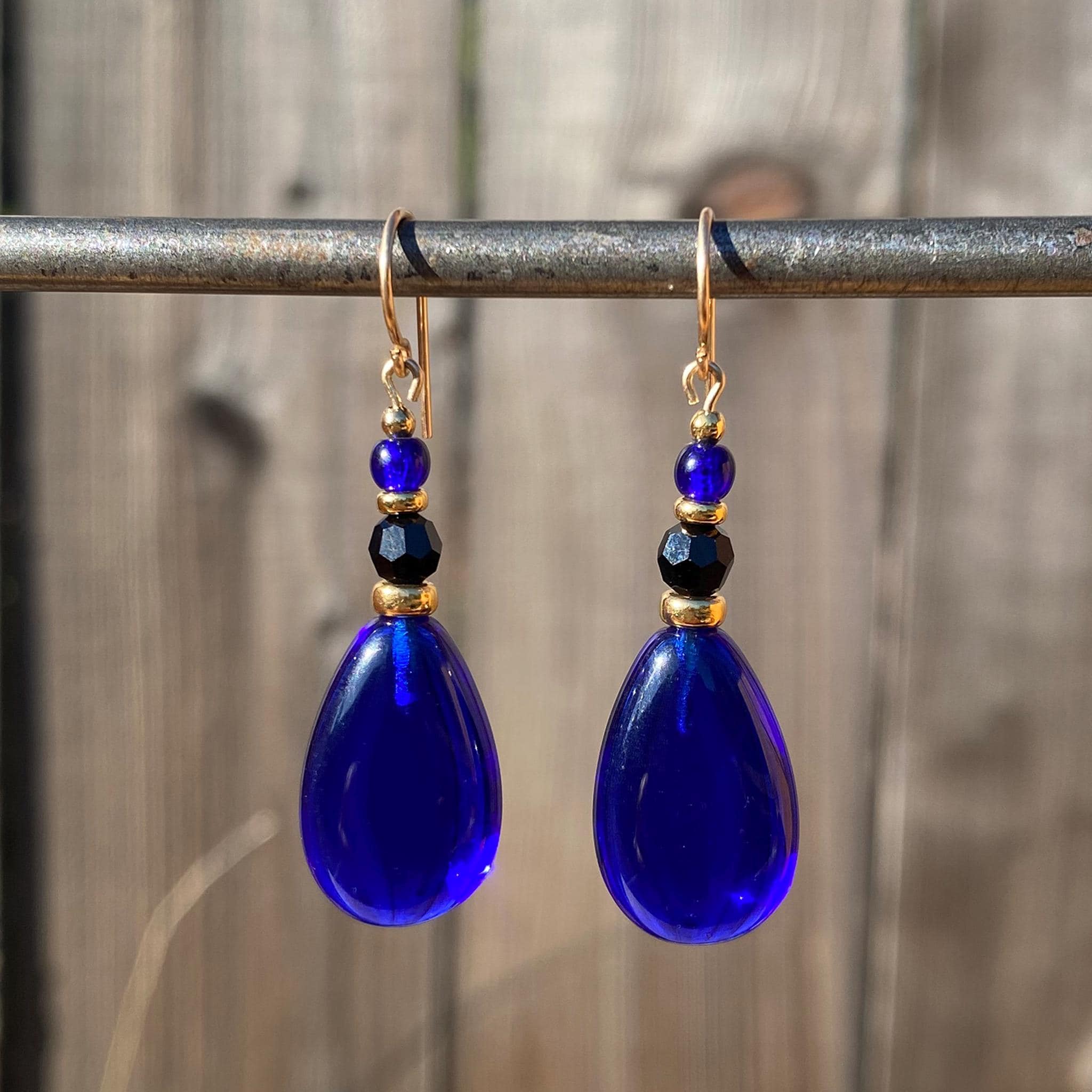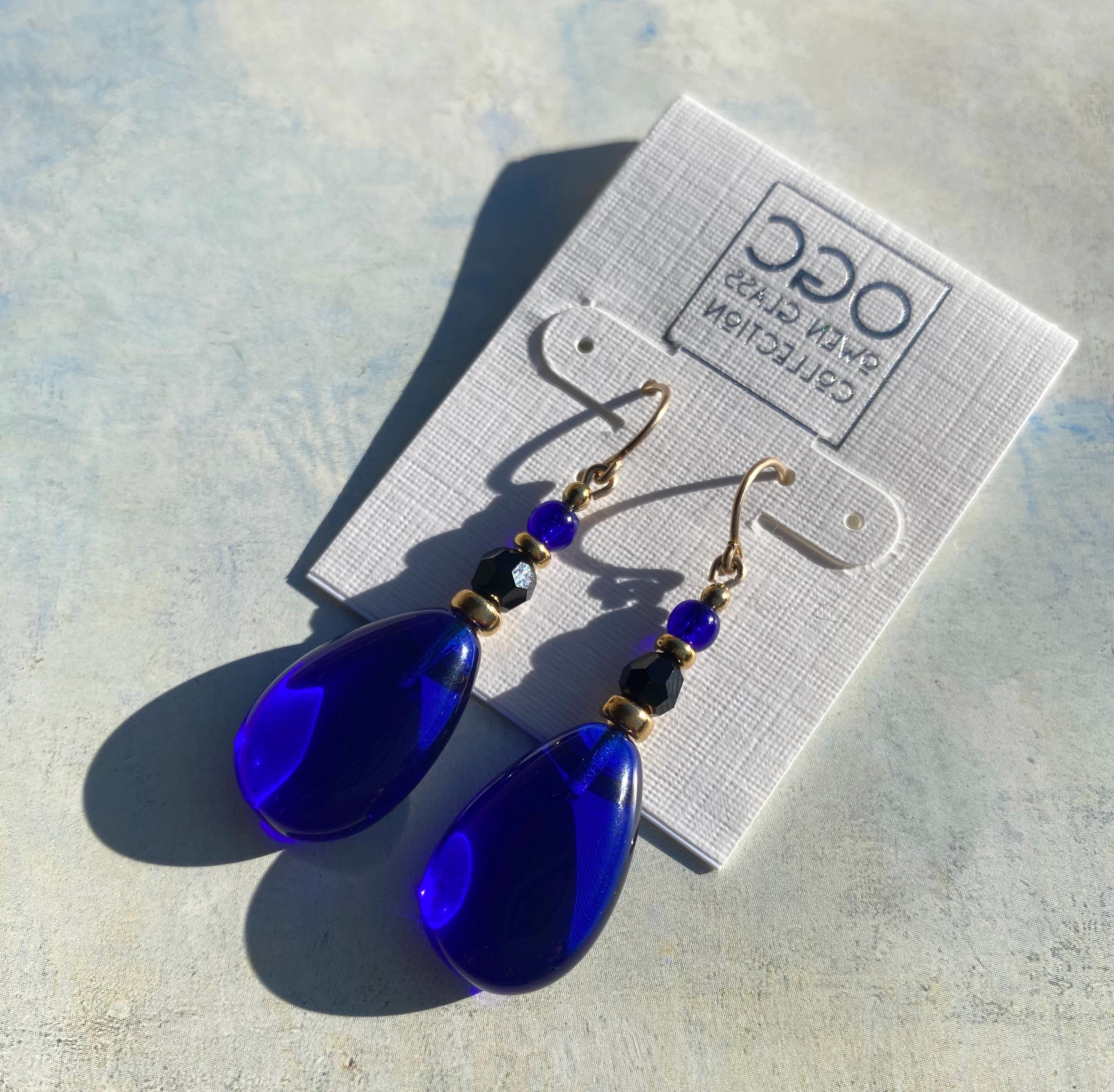 Cobalt, jet and gold earrings. German glass drops in dark blue with jet Austrian crystal focal beads and cobalt blue Czech glass top beads. Metal trim is gold plate with 14 karat gold-filled ear wires. Style 832 earrings measure 1 1/2 inches in length. All handwork done in the USA.