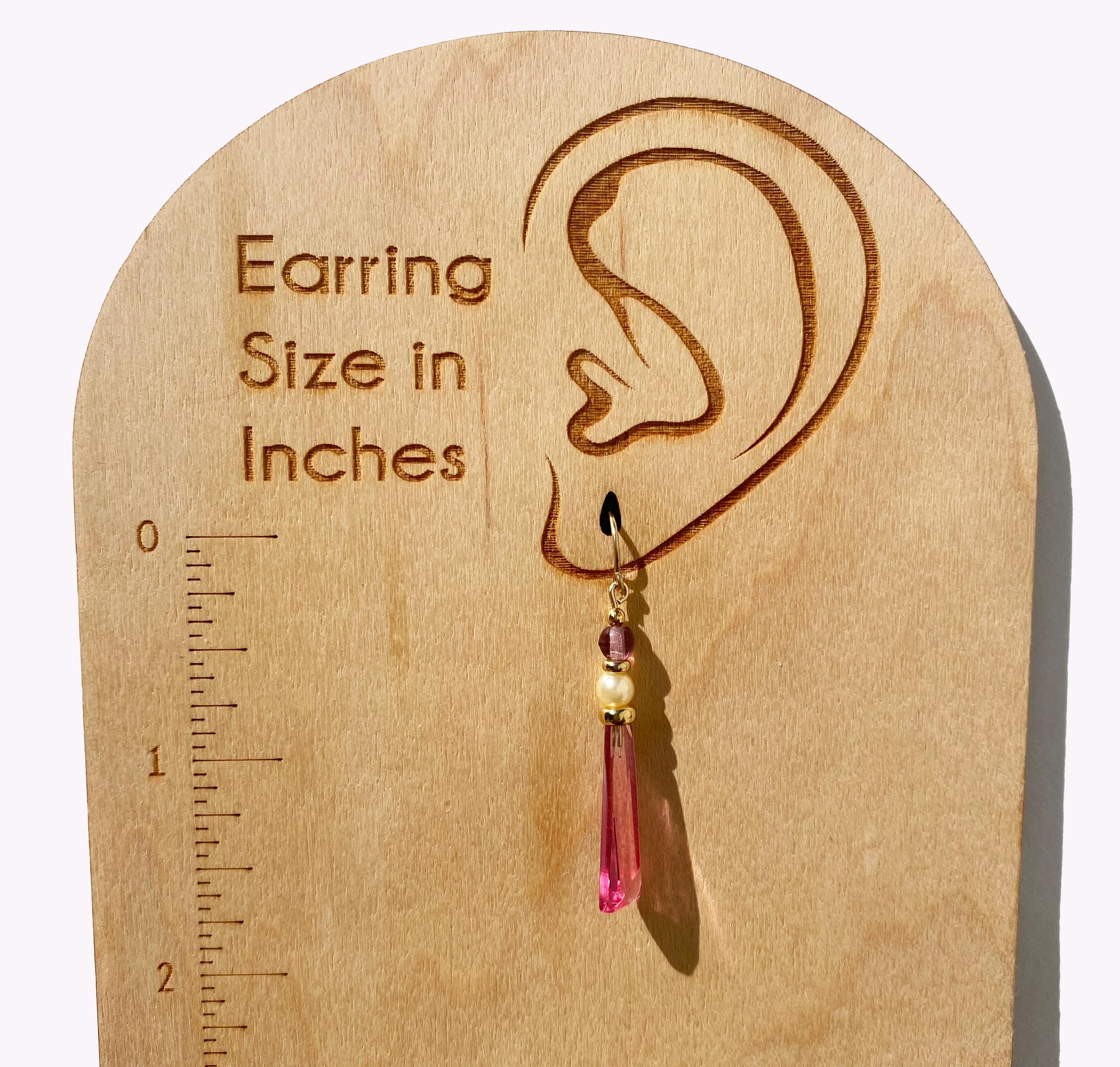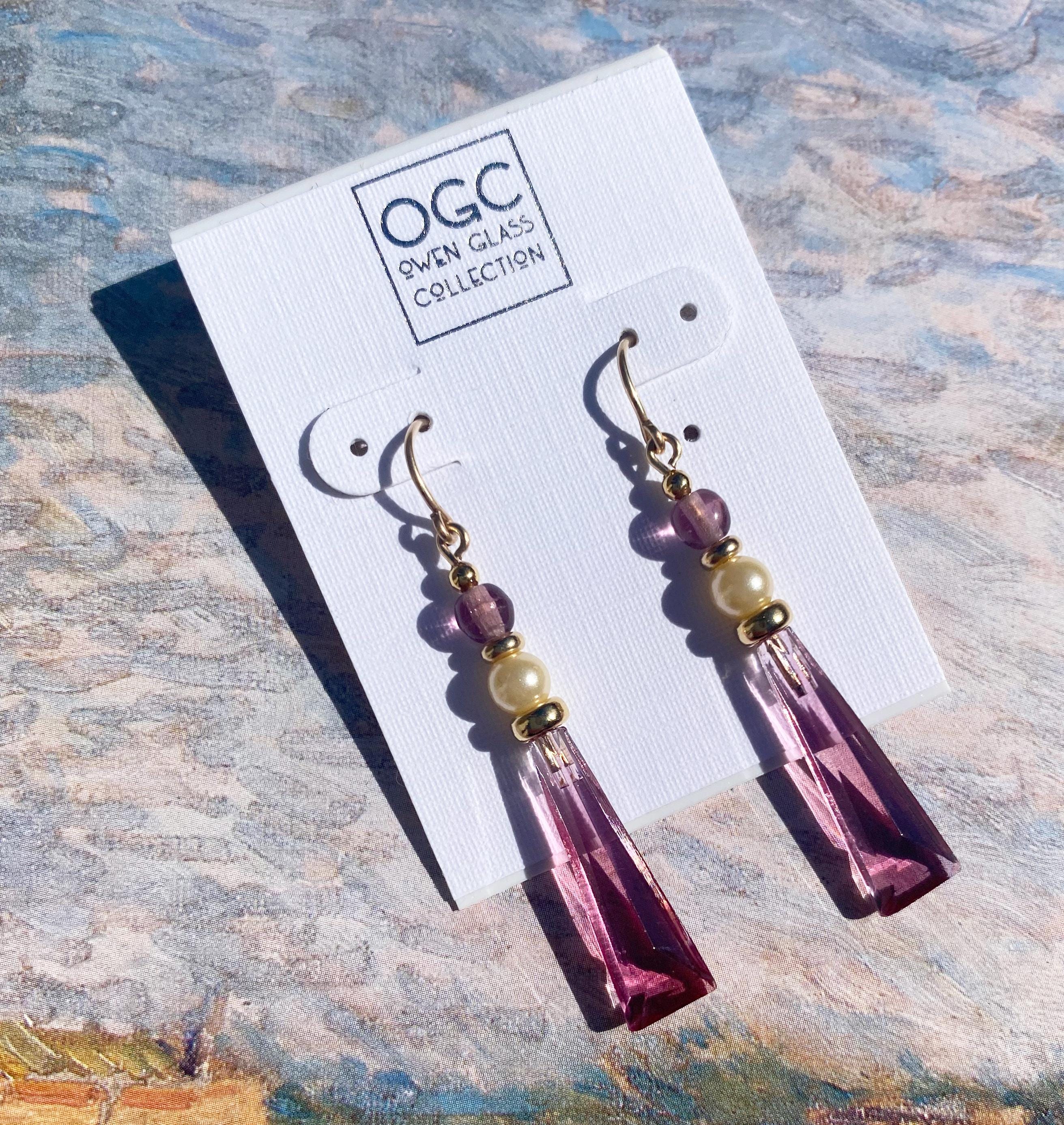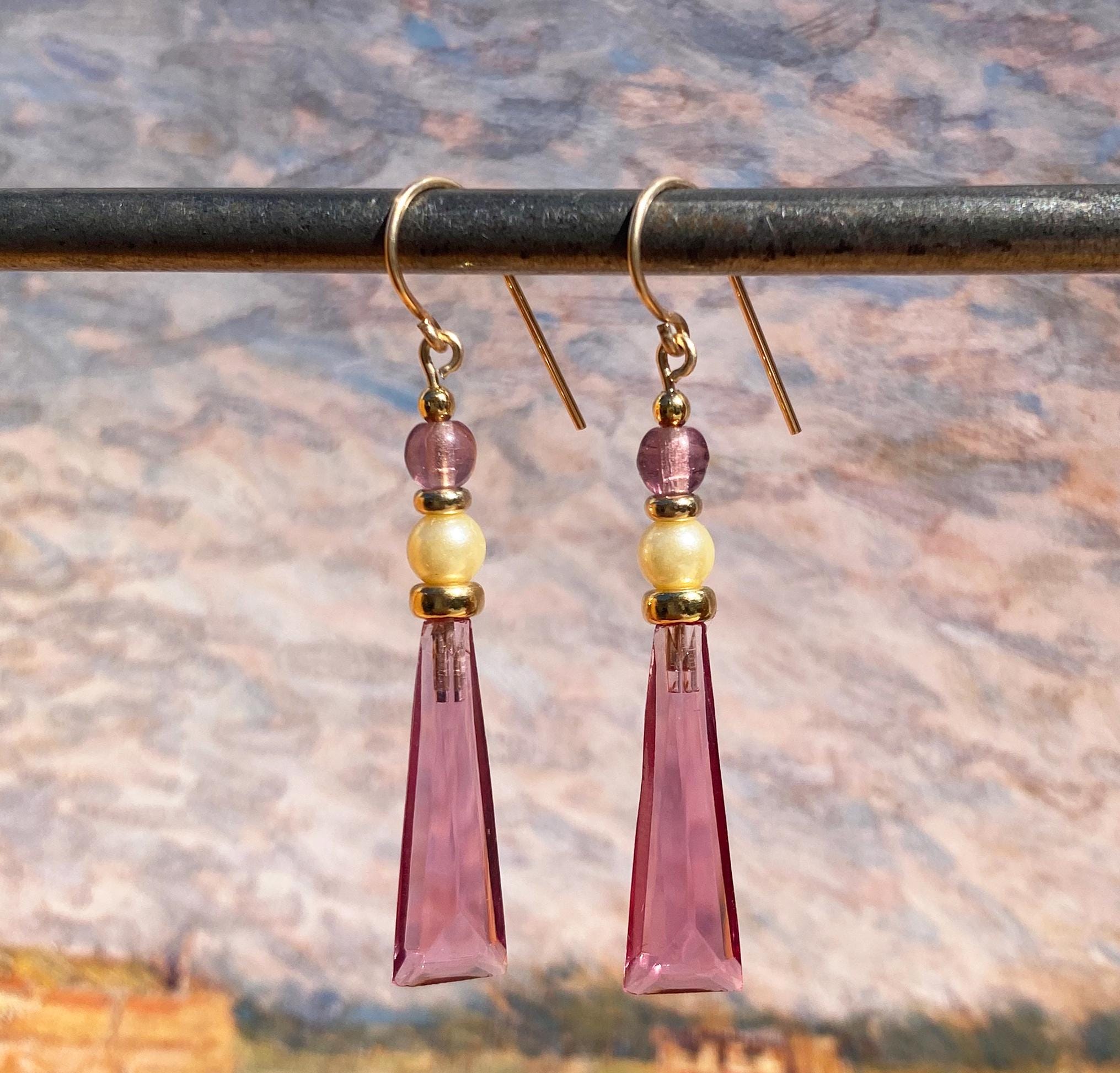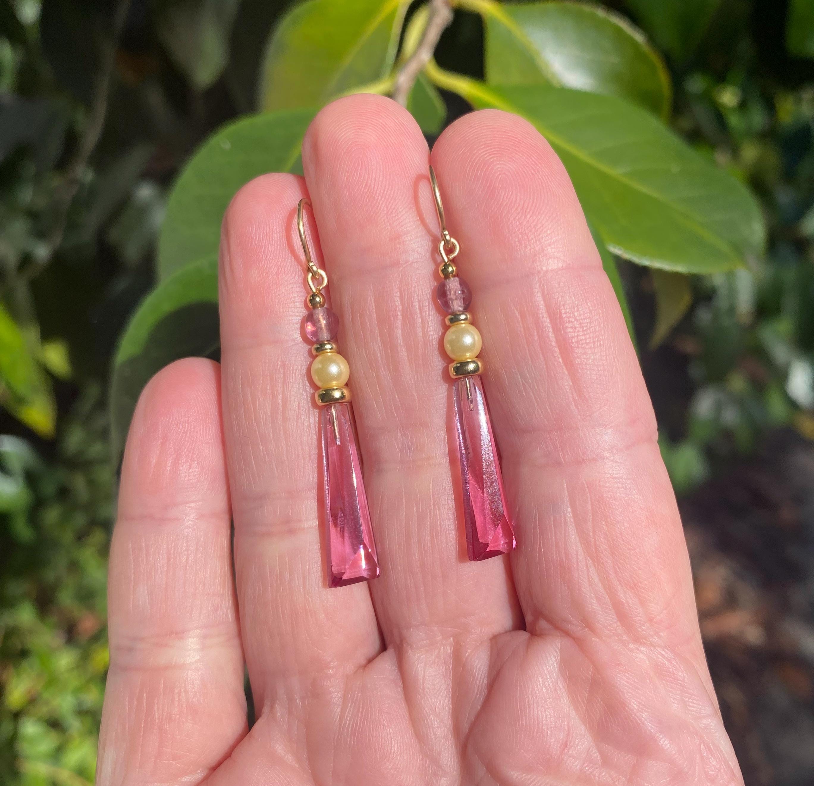 Pink glass and gold earrings. Rare pink German glass drops, from our collection. Top beads are glass pearls and light amethyst Czech glass top beads. Metal trim is gold dipped with 14-karat gold-filled ear wires. Style 839 earrings measure 1 1/2 inches in length. All handwork done in the USA.