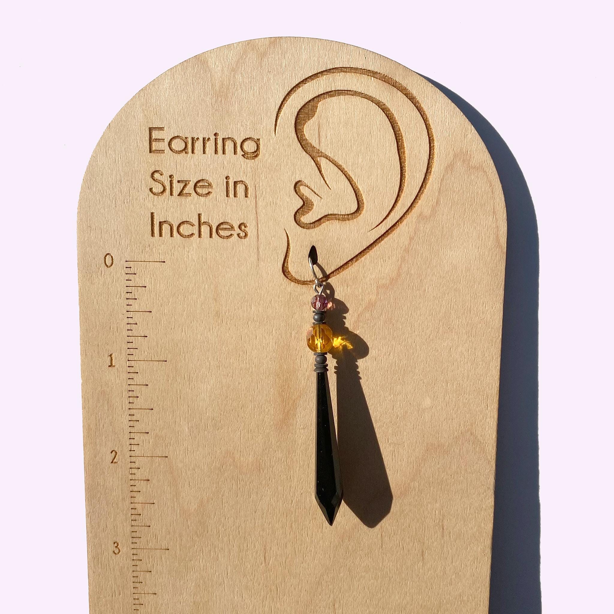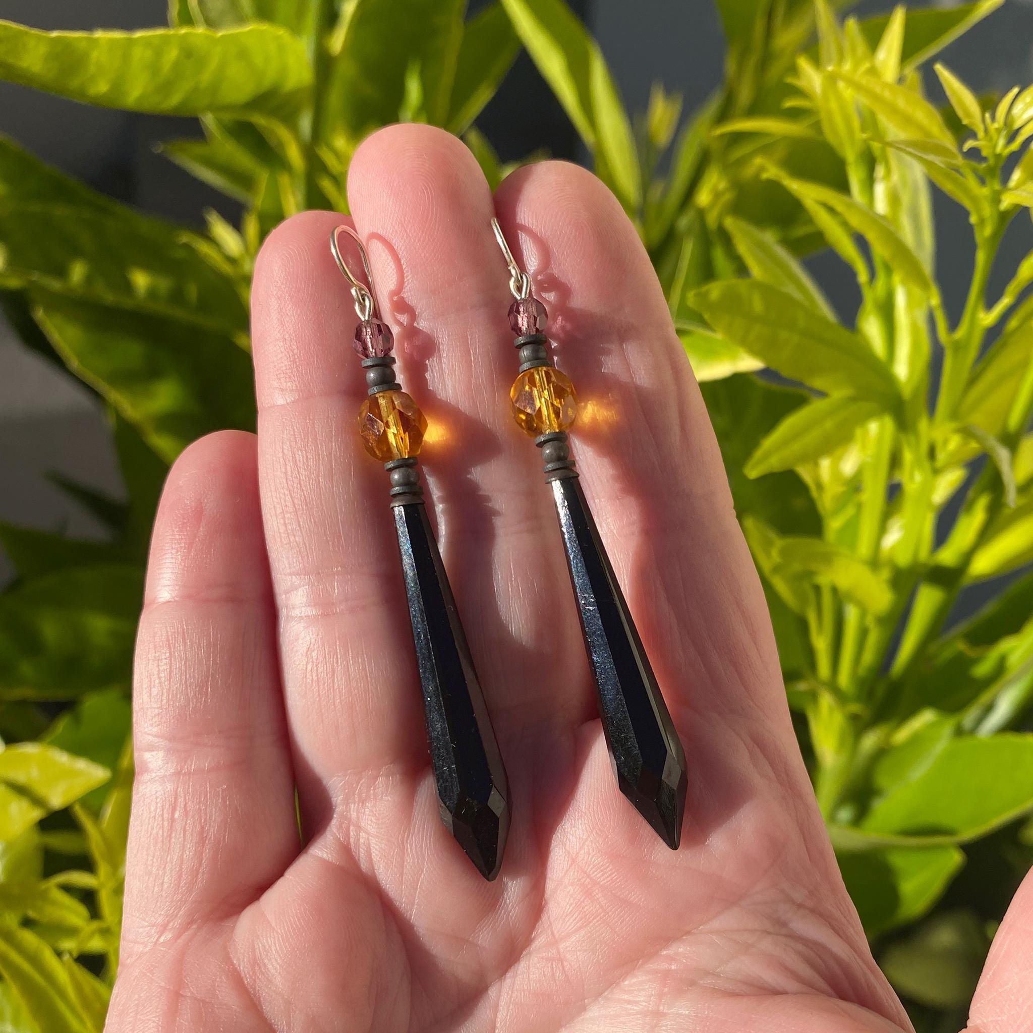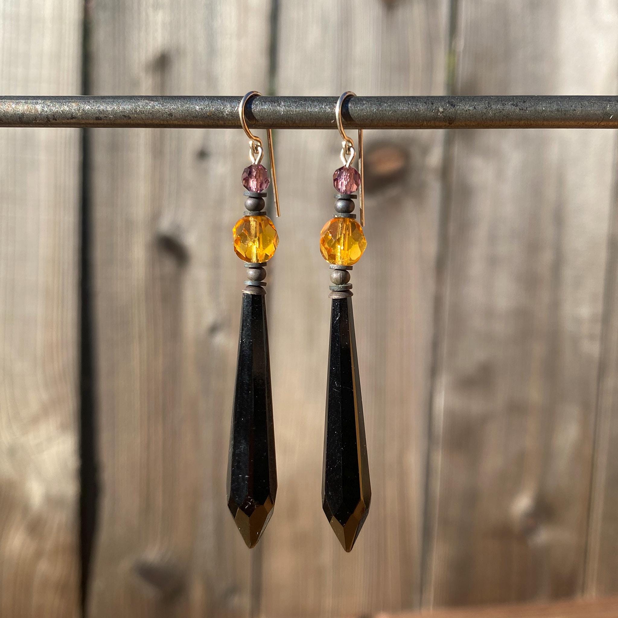 Antique jet glass earrings. Jet prisms, circa 1920-1930, made in Czechoslovakia. Topaz focal beads are Czech glass with amethyst Austrian crystal top beads. Metal trim is antiqued bronze with sterling silver ear wires. Style 53 earrings measure 2 1/2 inches long. All handwork done in the USA.