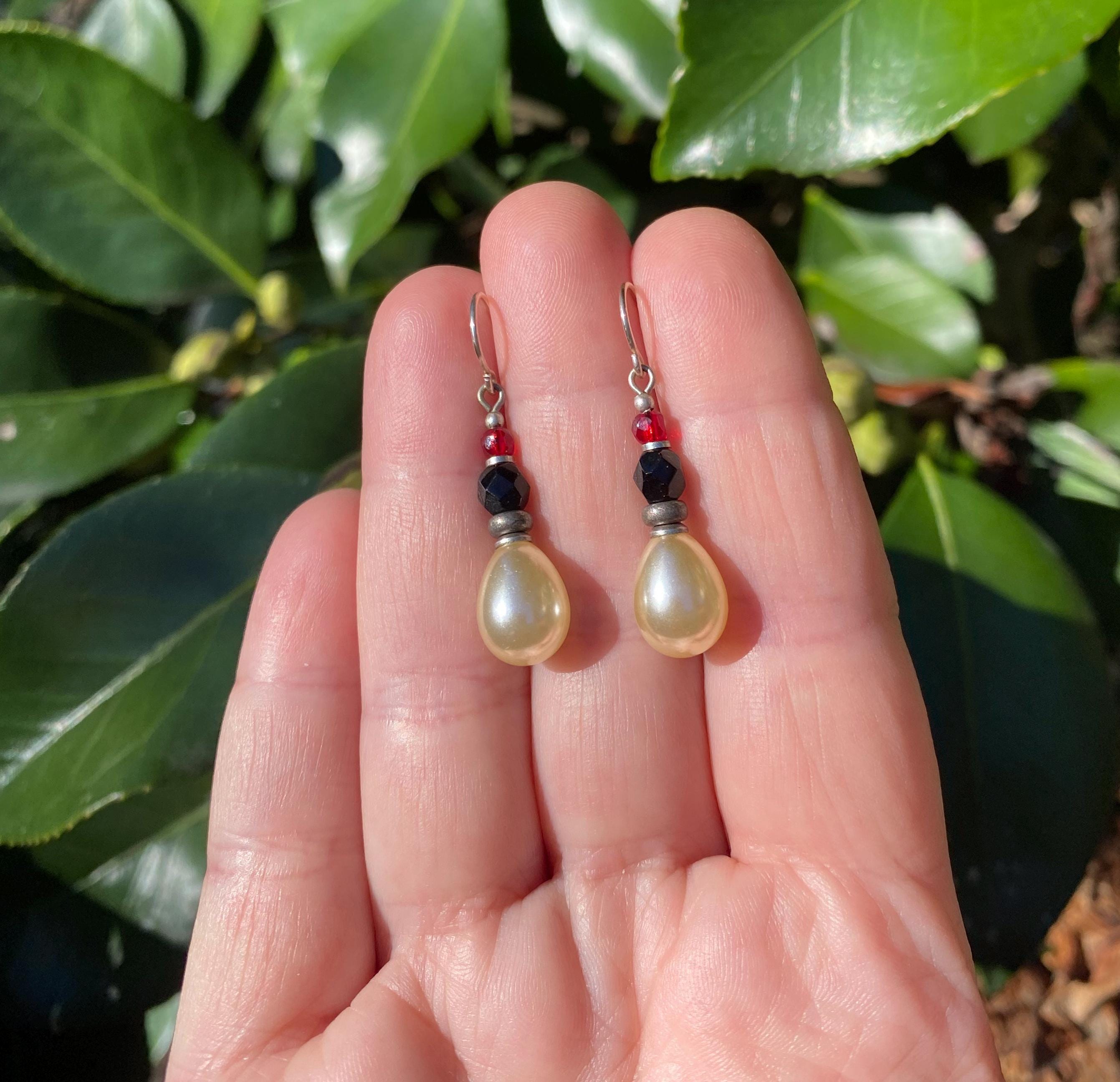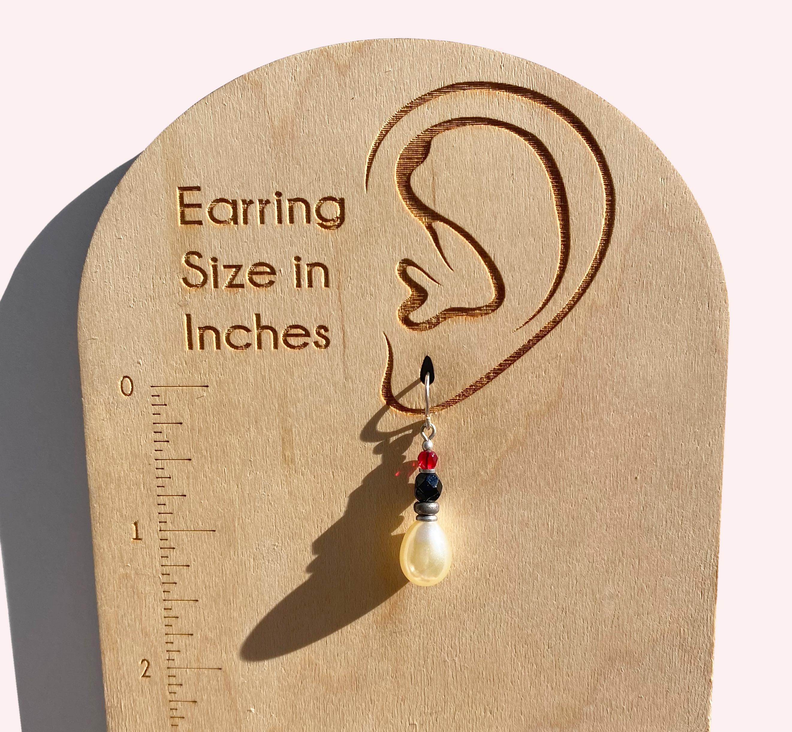 Pearl coated crystal earrings. Crystal pearl drops with jet and red Czech glass accents. Antiqued silver dipped trim with sterling silver ear wires. "Clouds 25" earrings measure 1 inch in length. All handwork done in the USA.