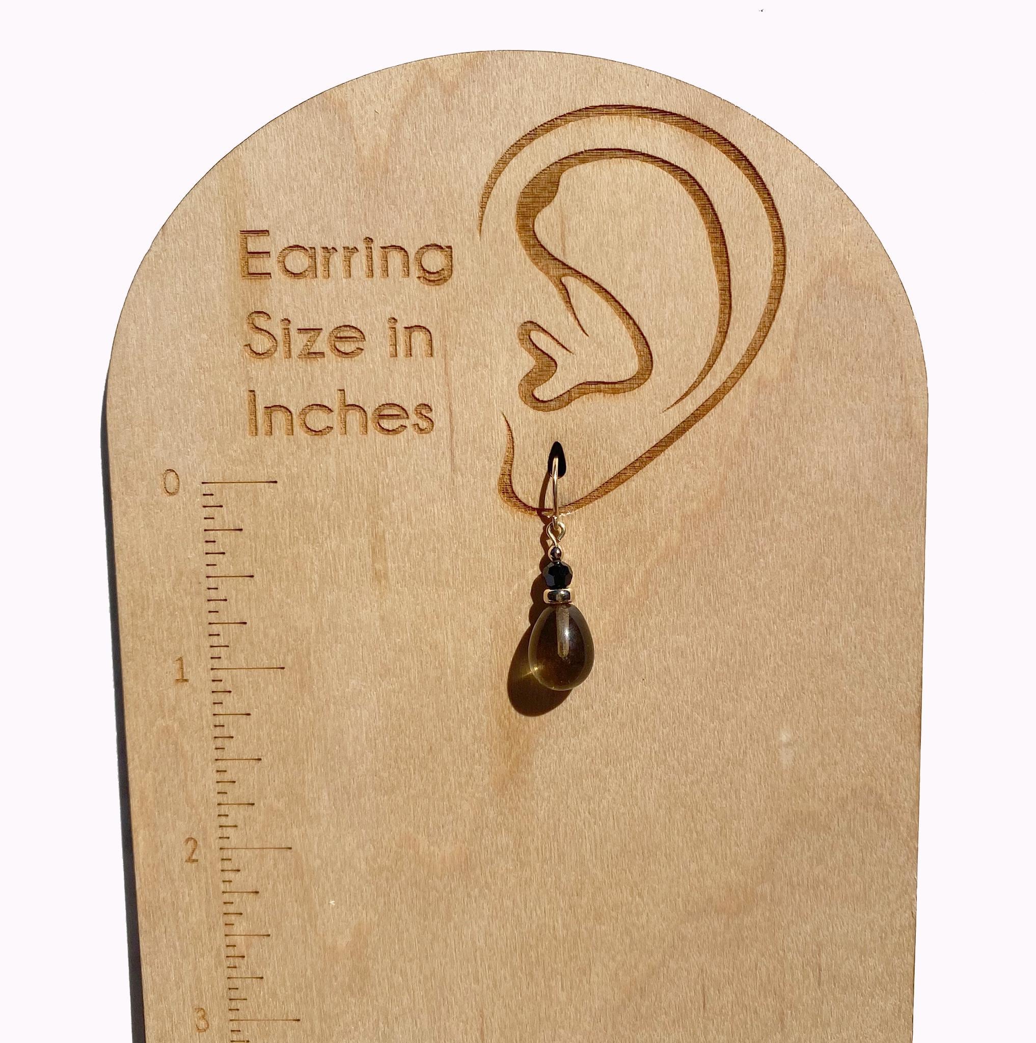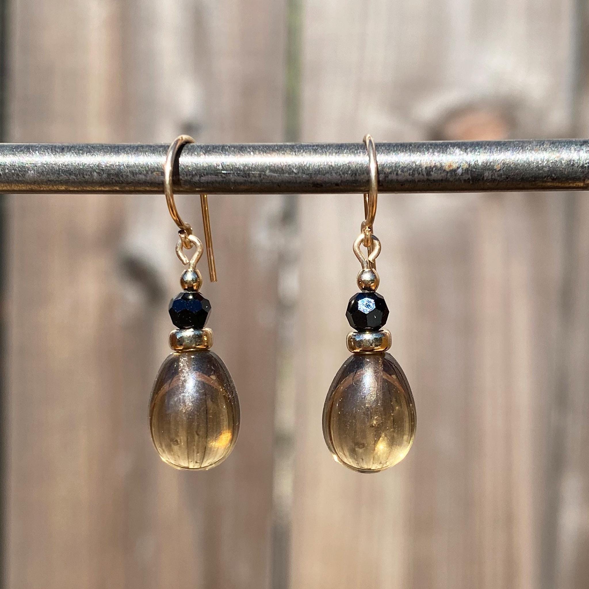 Light brown and black earrings. Light smoke topaz glass drops, designed by Allen Owen and made for us in Germany. Jet Austrian crystal top beads. Ear wires are 14k. gold-filled. "Banners 29" measure 7/8 inches in length. All handwork done in the USA.