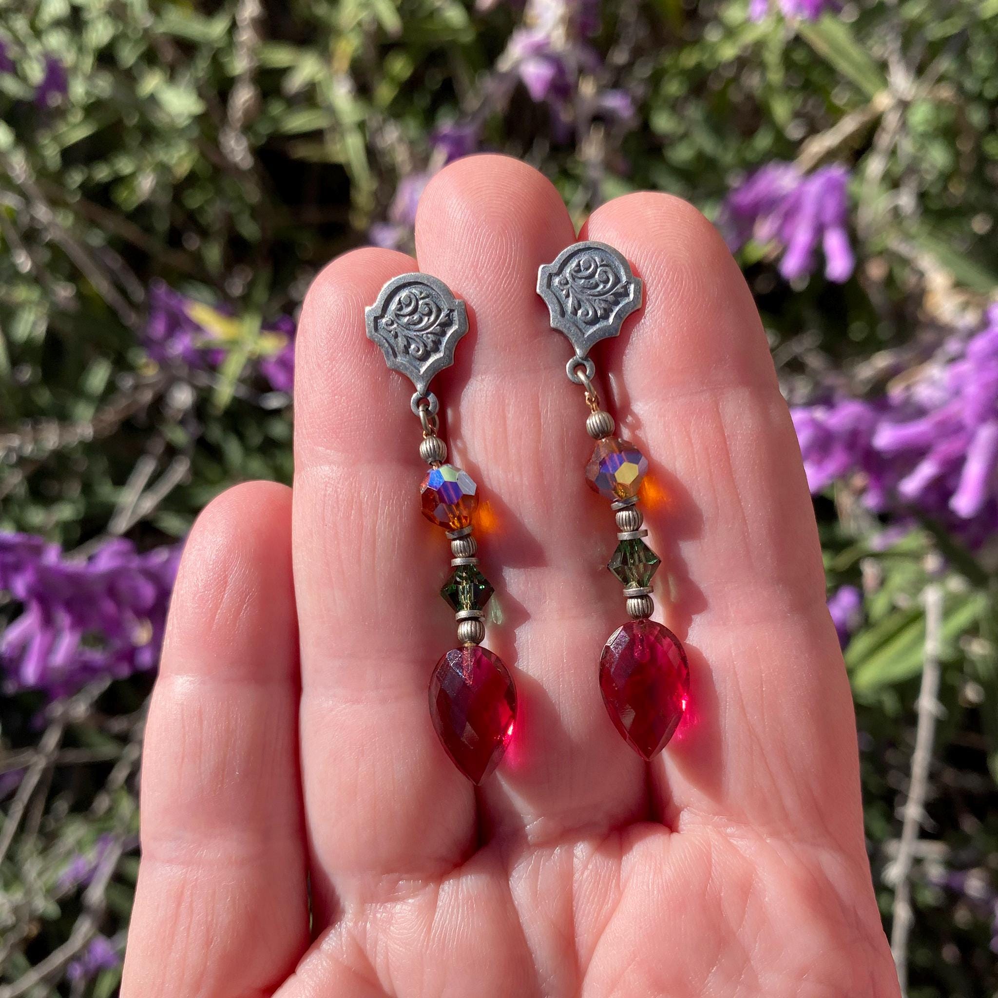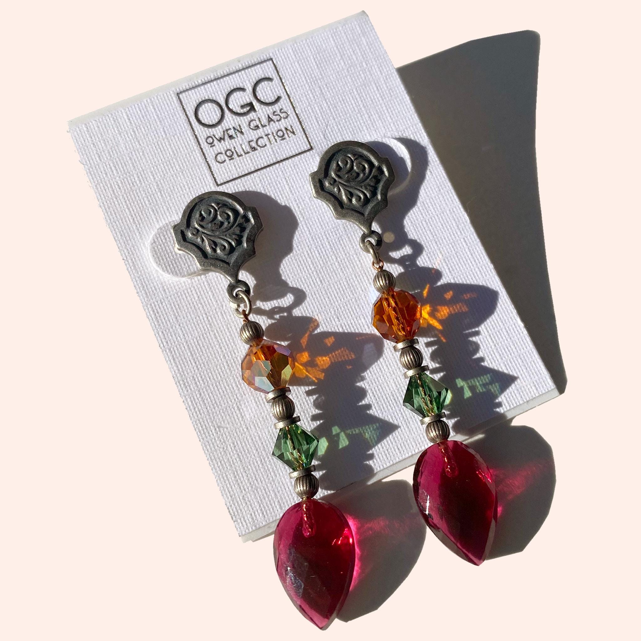 Dark pink post earrings. German glass drops in dark rose with Austrian crystal top beads in tourmaline green and iridescent topaz. Silver dipped metal trim and filigree with stainless steel posts. Style 297 earrings measure 2 inches long. All handwork done in the USA.