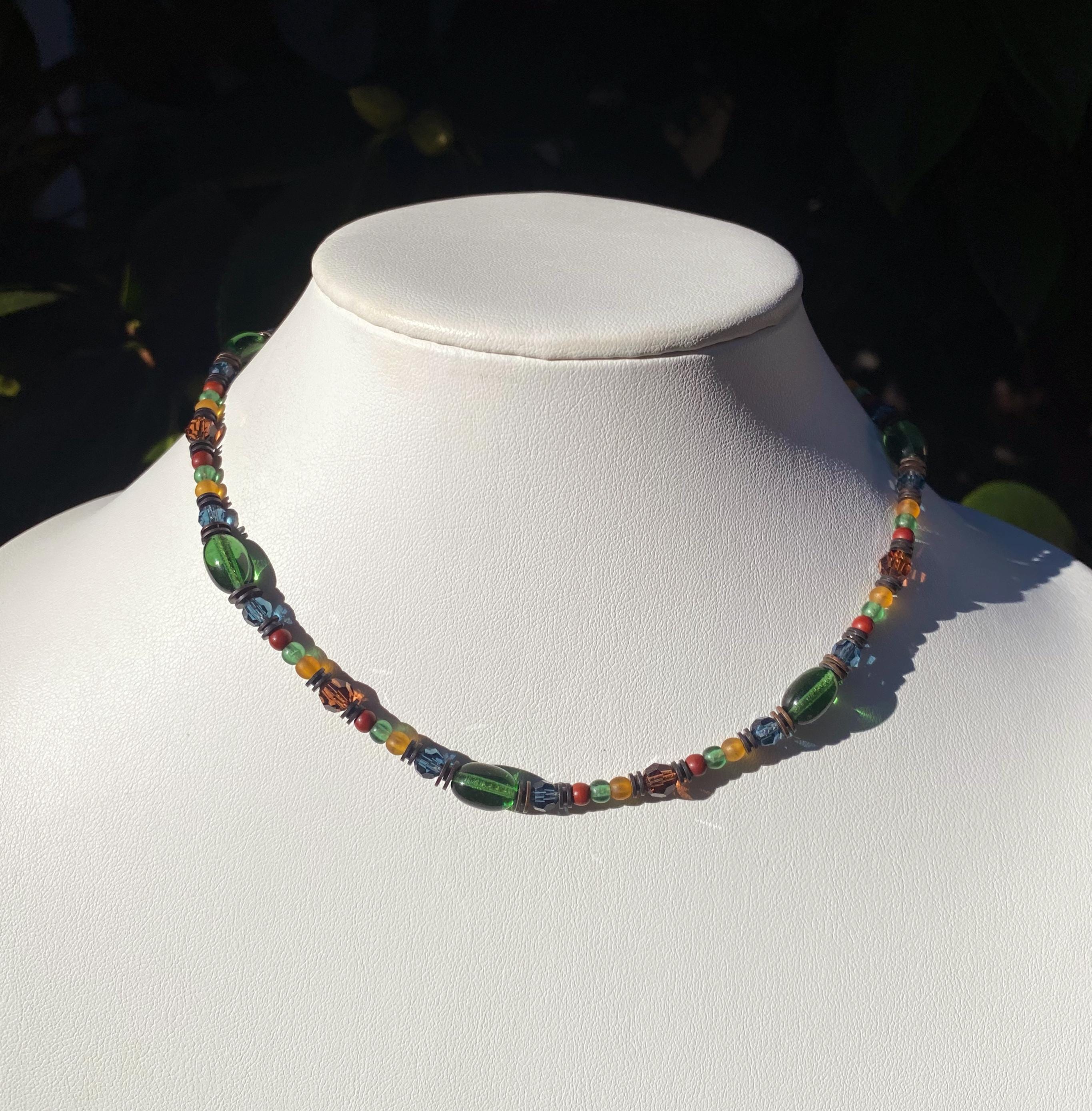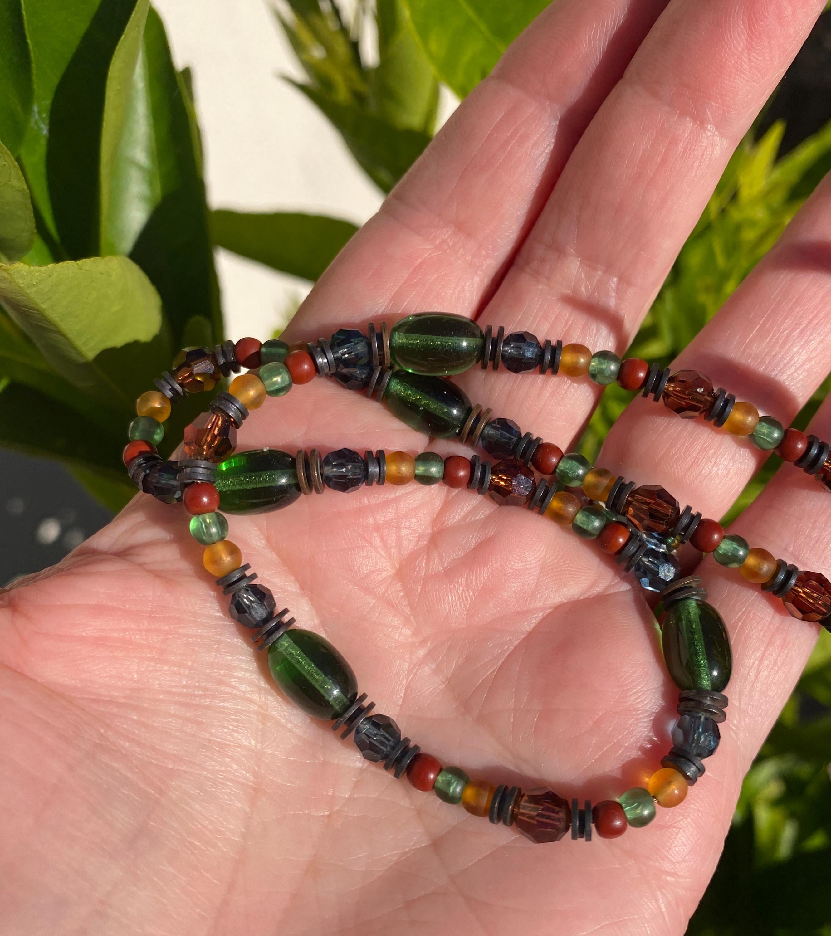 Our "Heather" necklace is 16 inches long with a 2-inch extender included. Czechoslovakian and German glass and Austrian crystal in shades of tourmaline, indigo, smoke topaz, peridot and topaz. Antiqued bronze trim, from our own tooling. Hand made in the USA.