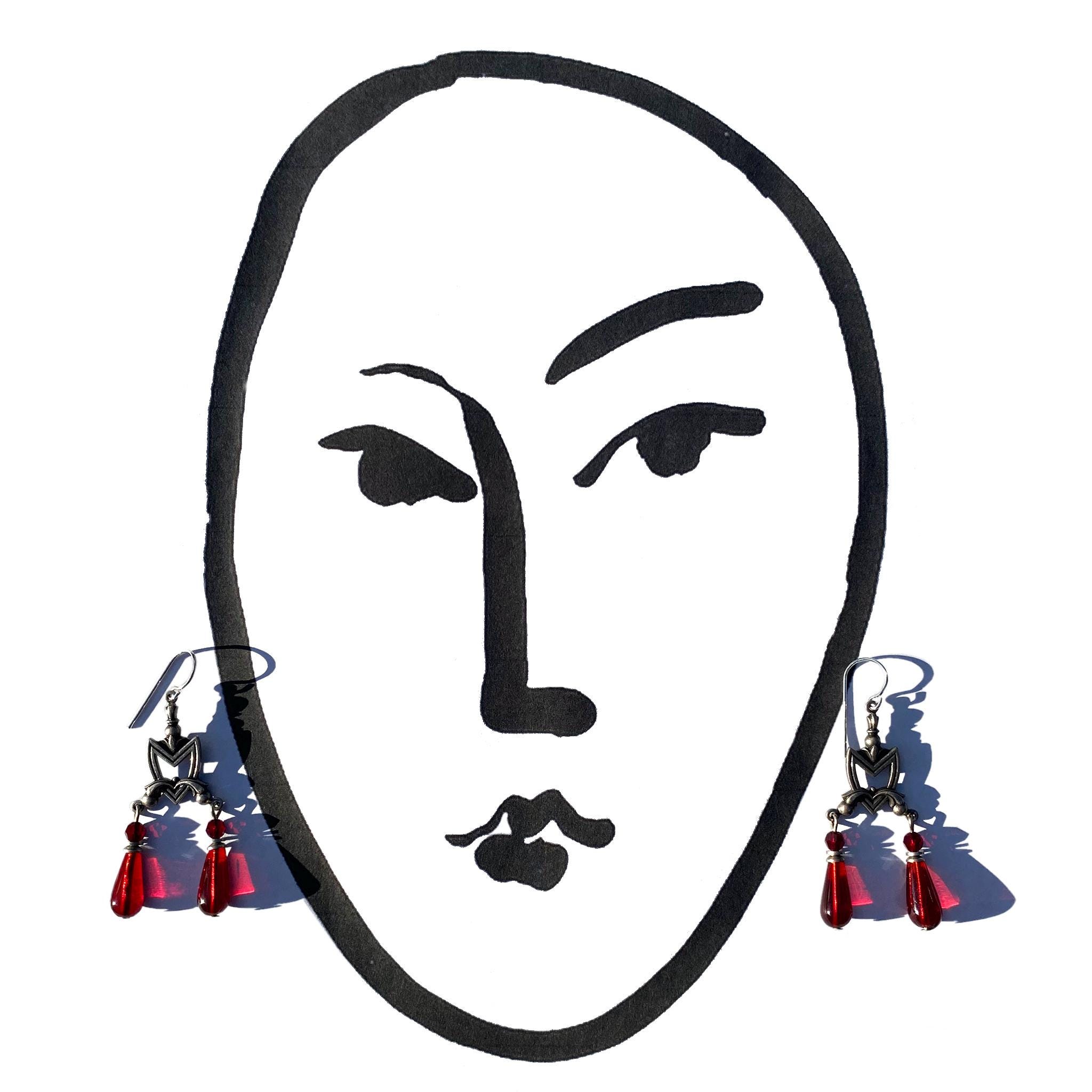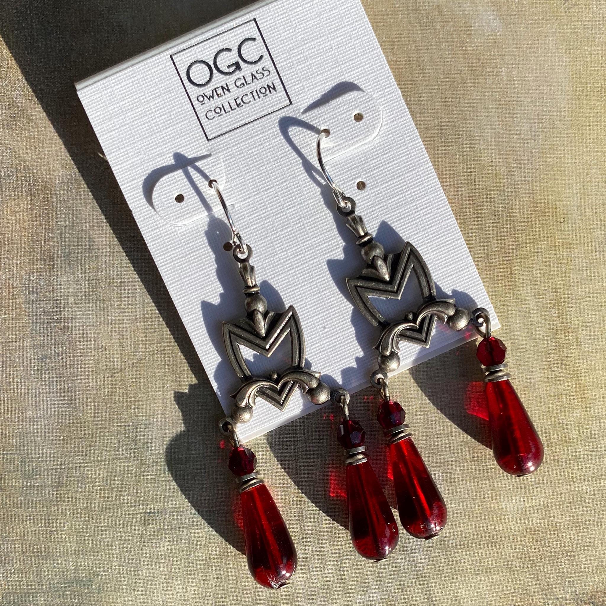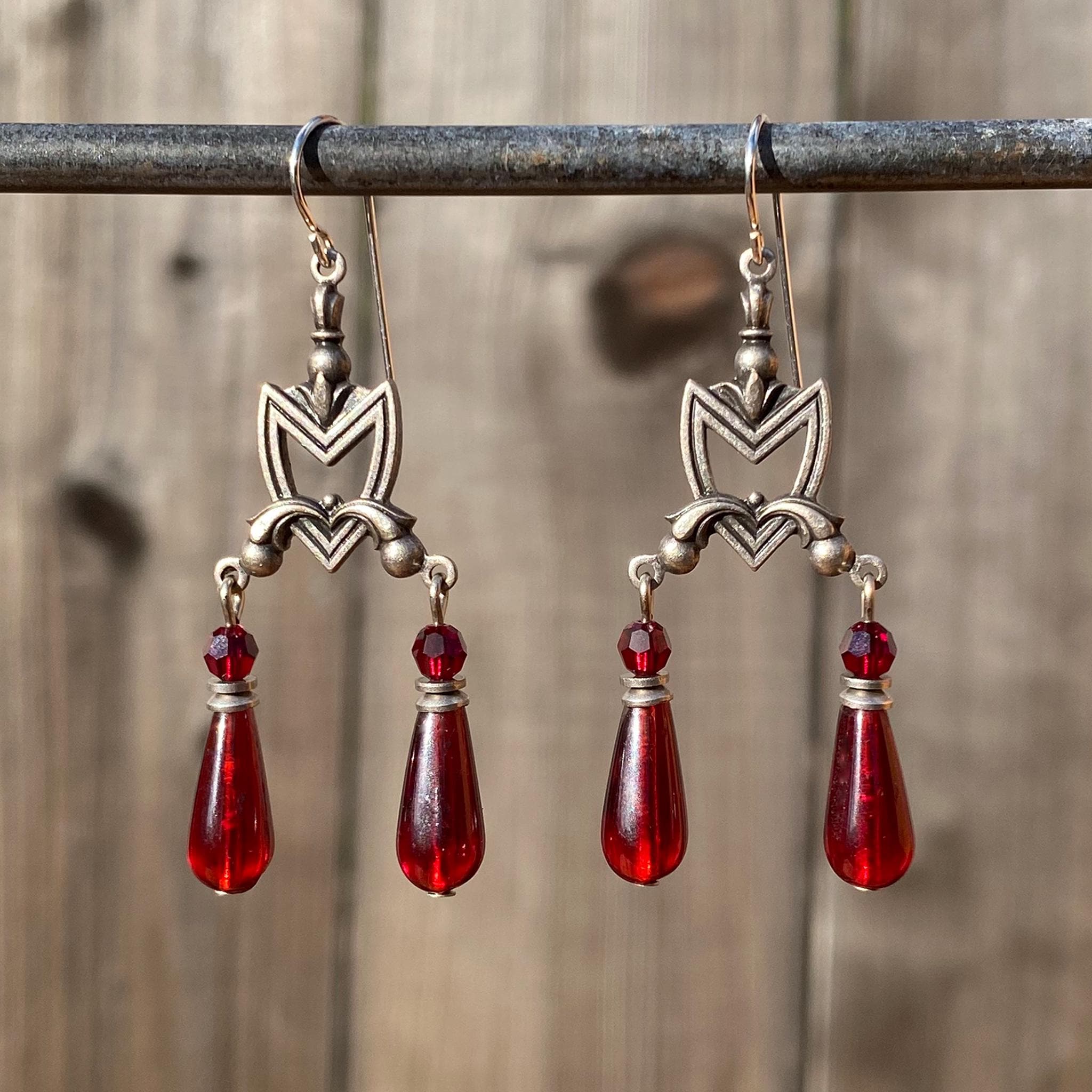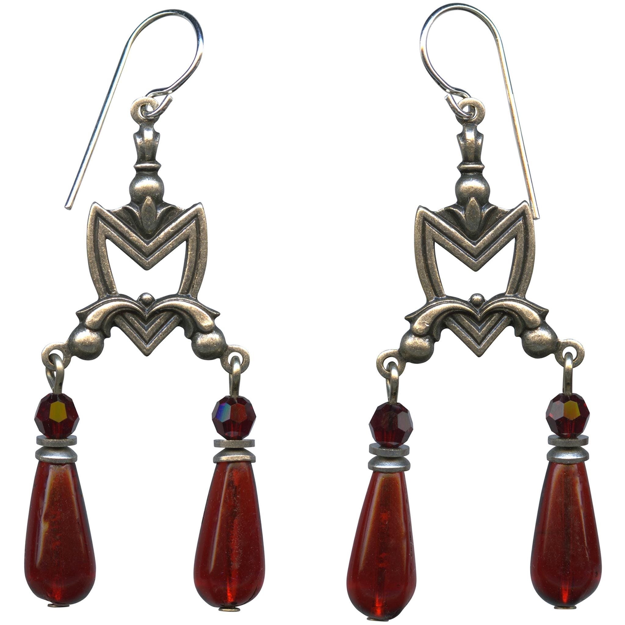 Garnet glass earrings. Antique Czech burgundy red glass beads, circa 1920-1930, with Austrian crystal top beads. Antique silver-dipped filigree with sterling silver ear wires. Arcadia 15 earrings measure 1 3/4 inches long. All handwork done in the USA.