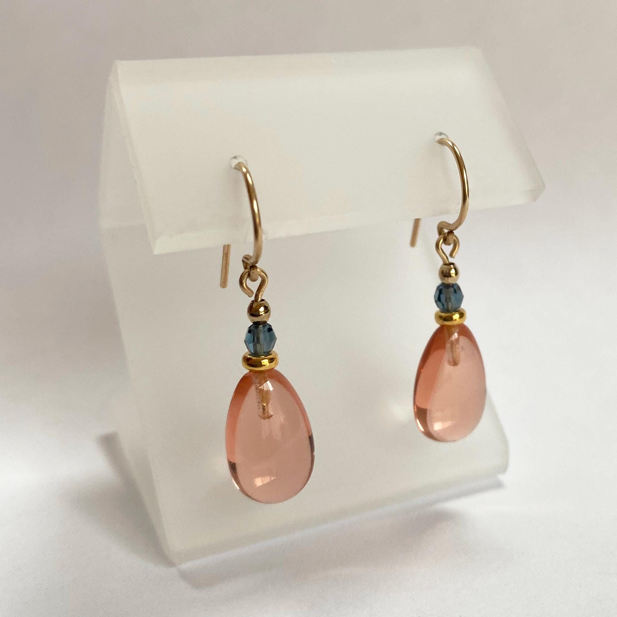Pale peach glass drop earrings with indigo blue Austrian crystal accents. Ear wires are 14 karat gold filled. Raindrops 130 measure 7/8 inches long. All handwork done in the USA.