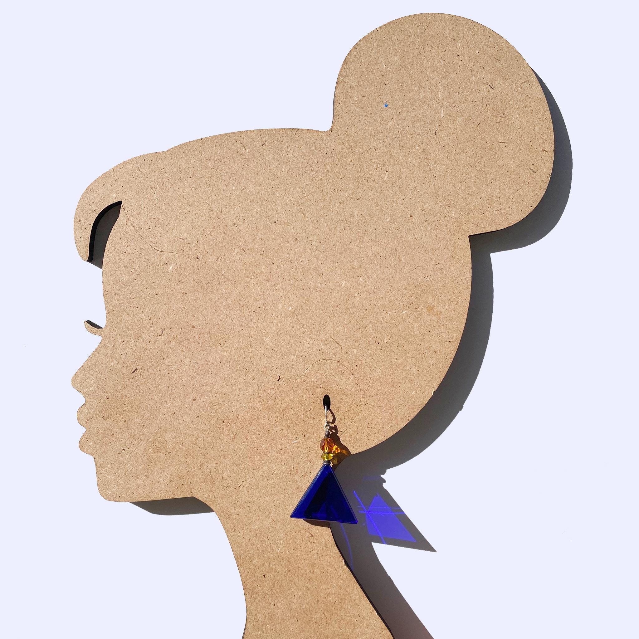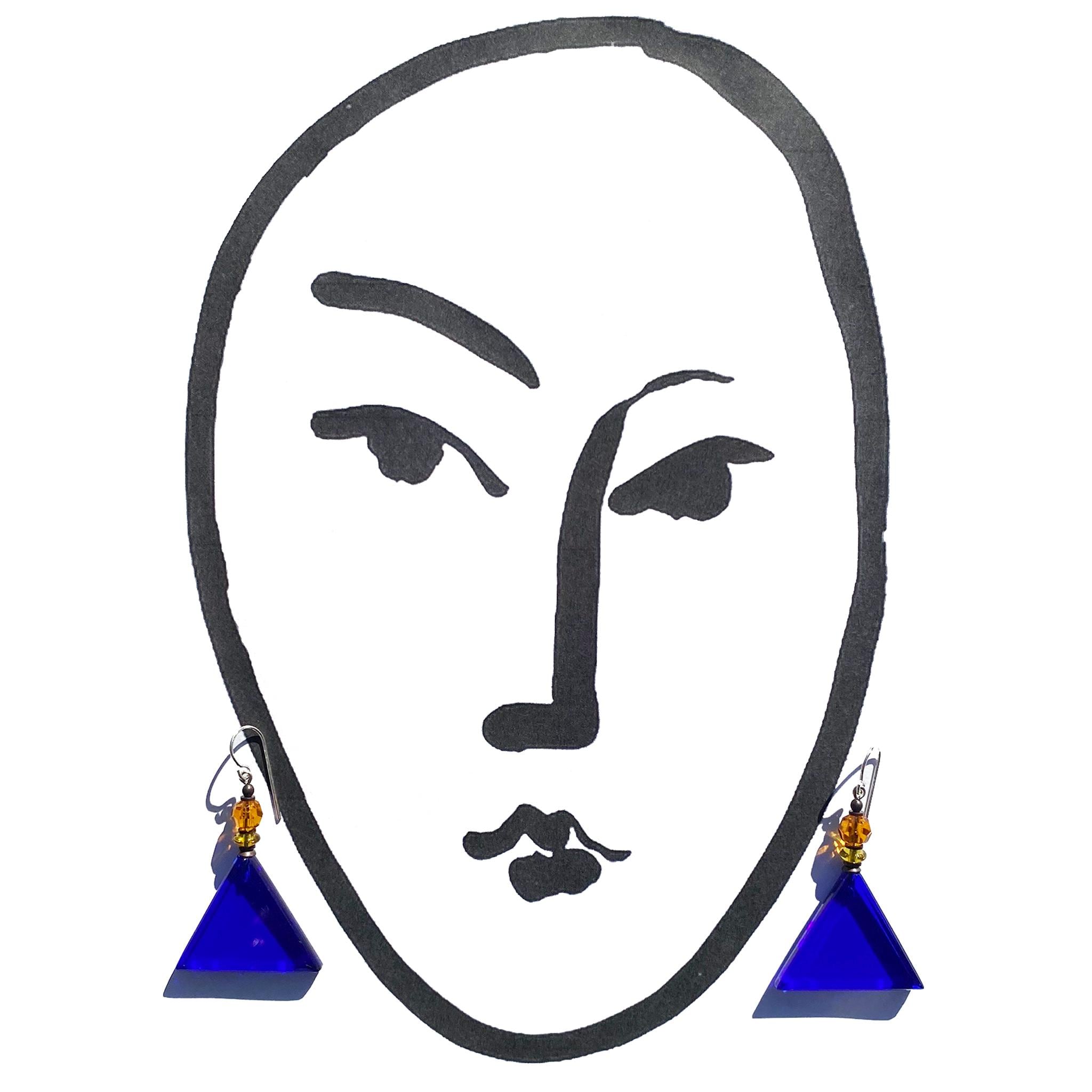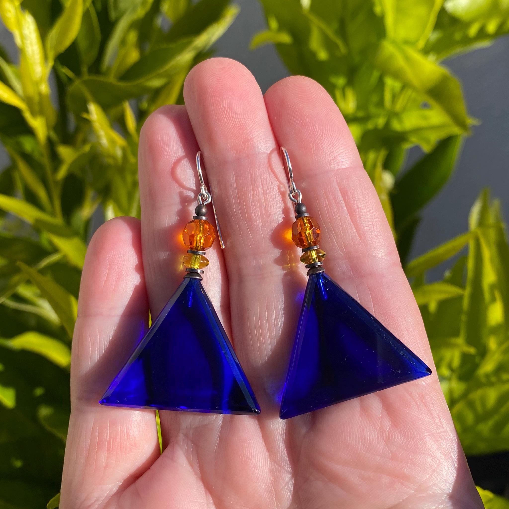 Cobalt glass earrings. Deep blue glass geometric drops, designed by Allen Owen and made for us in Germany. Olivine and orange top beads are Czech glass. Antiqued bronze trim with sterling silver earwires. Style 448 earrings measure 1 3/4 inches long. All handwork done in the USA.