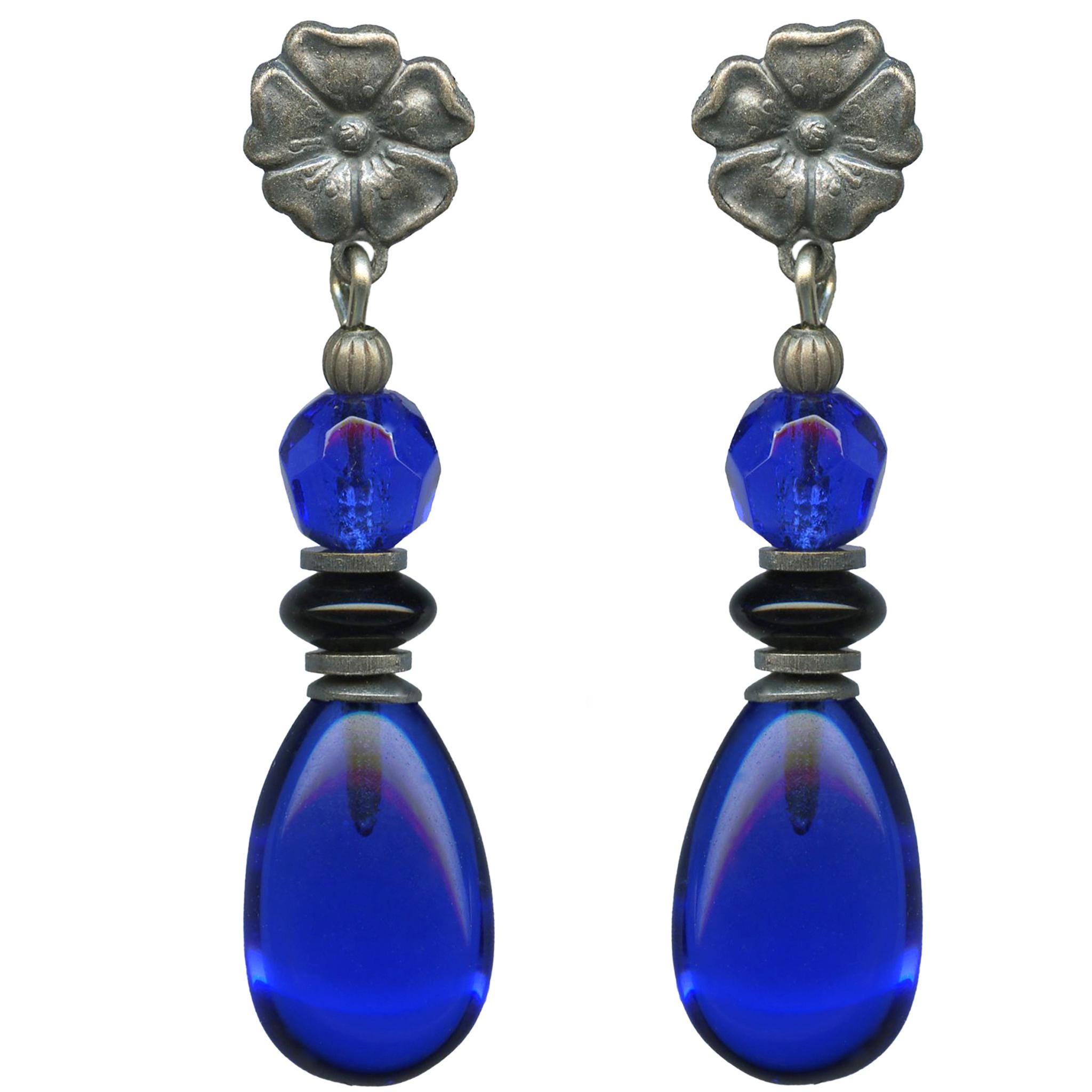Cobalt and jet glass post earrings. Cobalt glass drops, made for us in Germany with antique molds, circa 1920-1930. Cobalt and jet Czechoslovakian glass top beads. Metal trim is antiqued silver plate, from our own tooling with stainless steel posts. Raindrops 21 earrings measure 1 3/8 inches in length. All hand work is done in the USA.