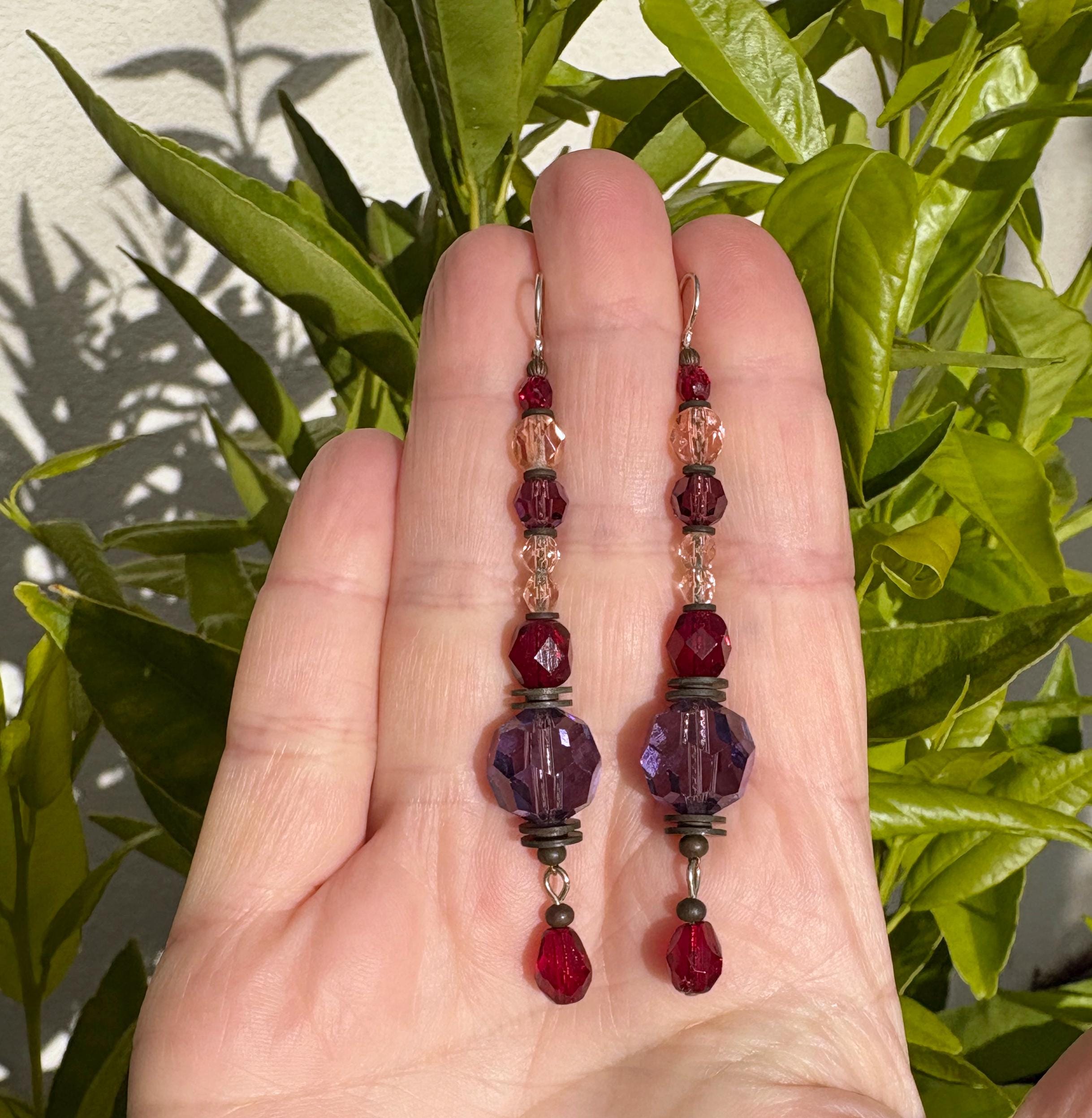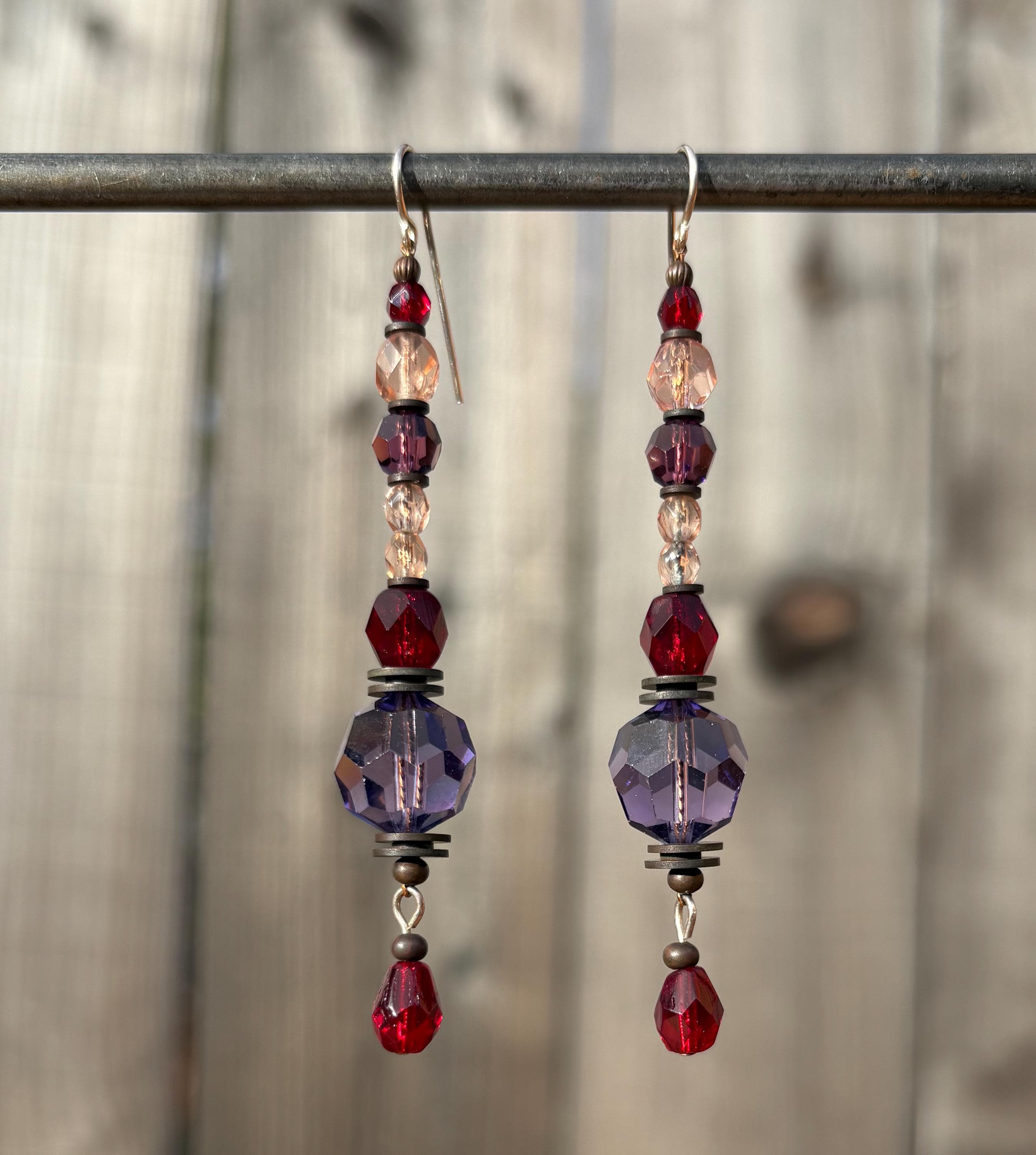 Amethyst and garnet shoulder duster earrings. Shades of amethyst, garnet and light topaz in Czech glass and Austrian crystal. Metal trim is antiqued bronze, from our own tooling, with sterling silver ear wires. "New Wine" shoulder duster earrings measure 2 3/4 inches long. All handwork done in the USA.
