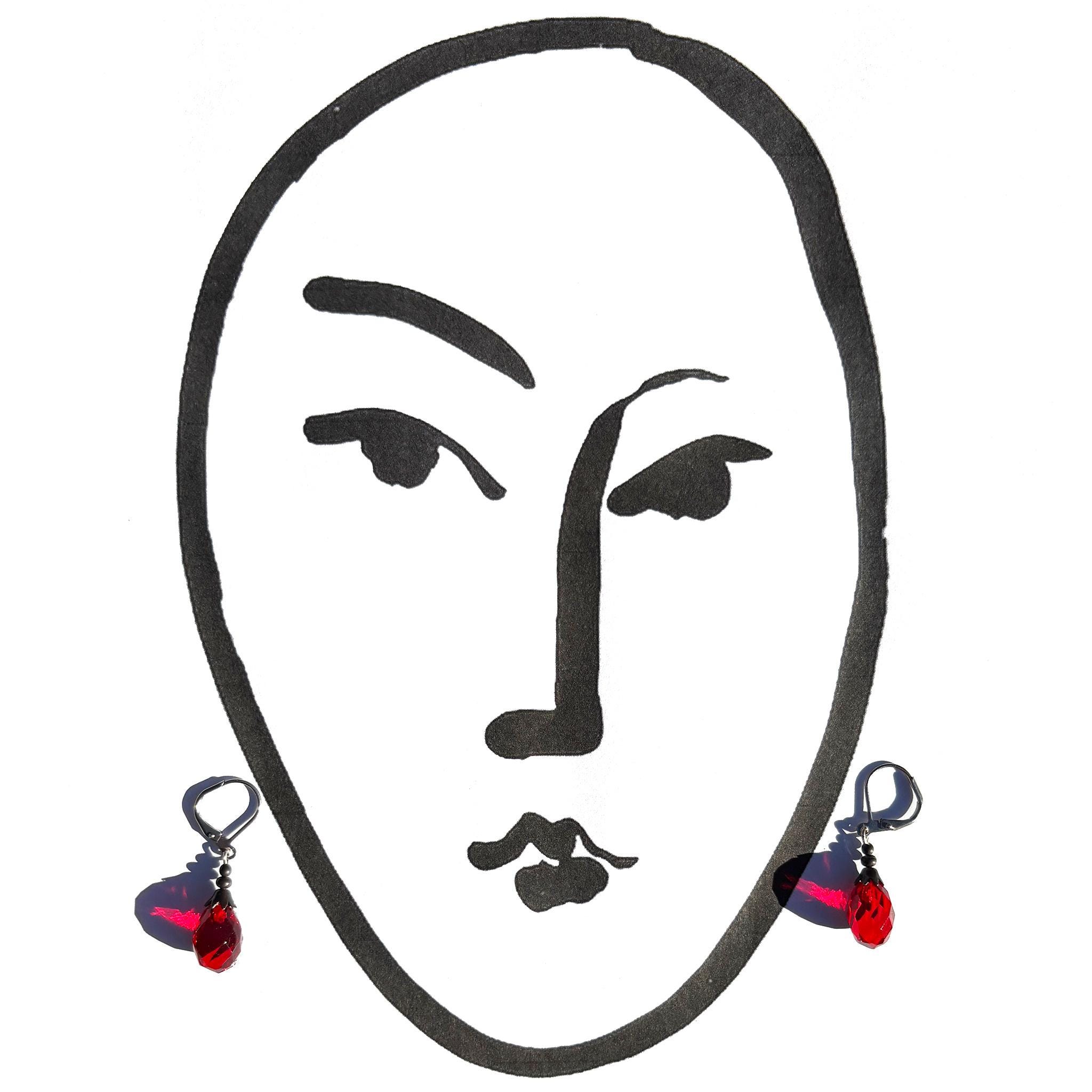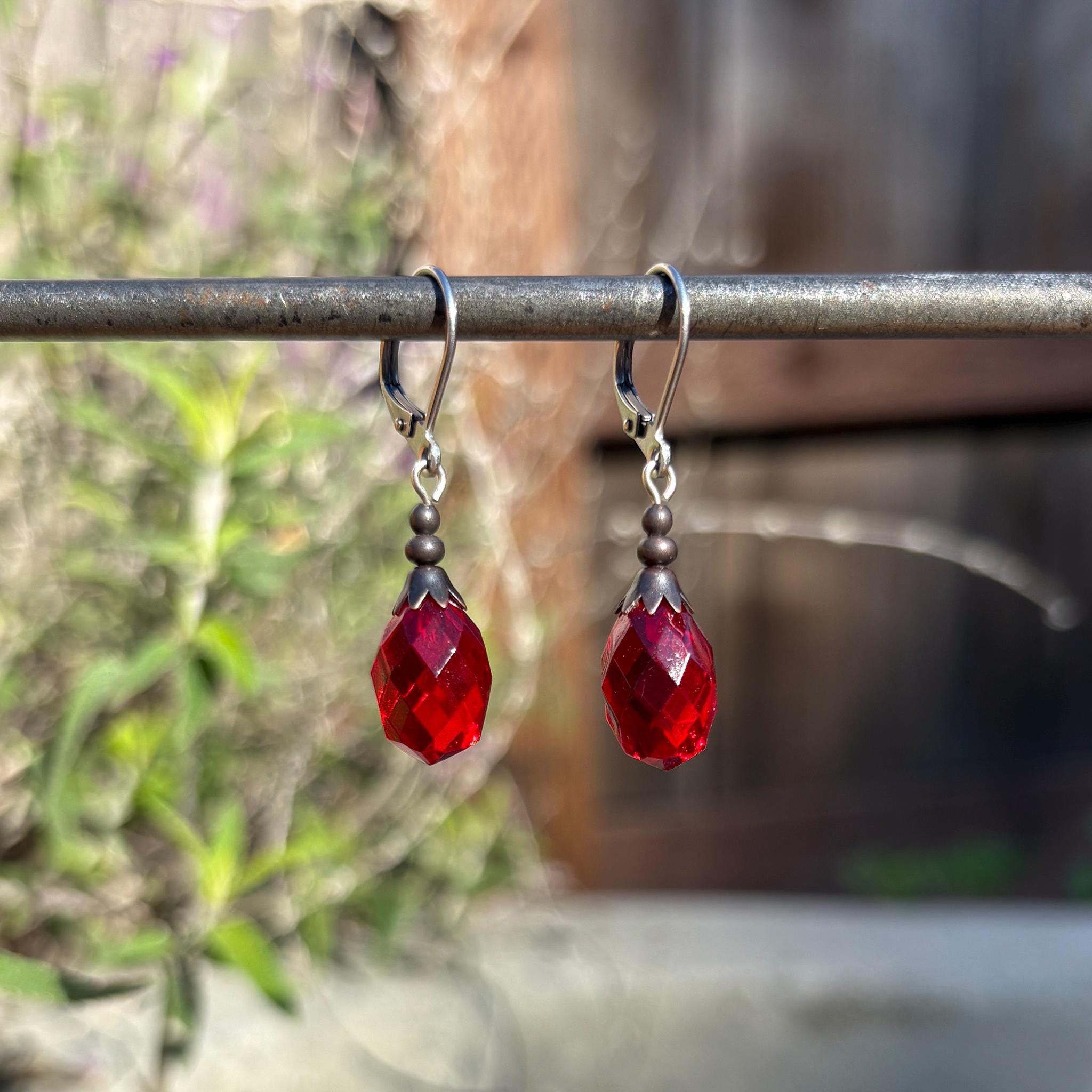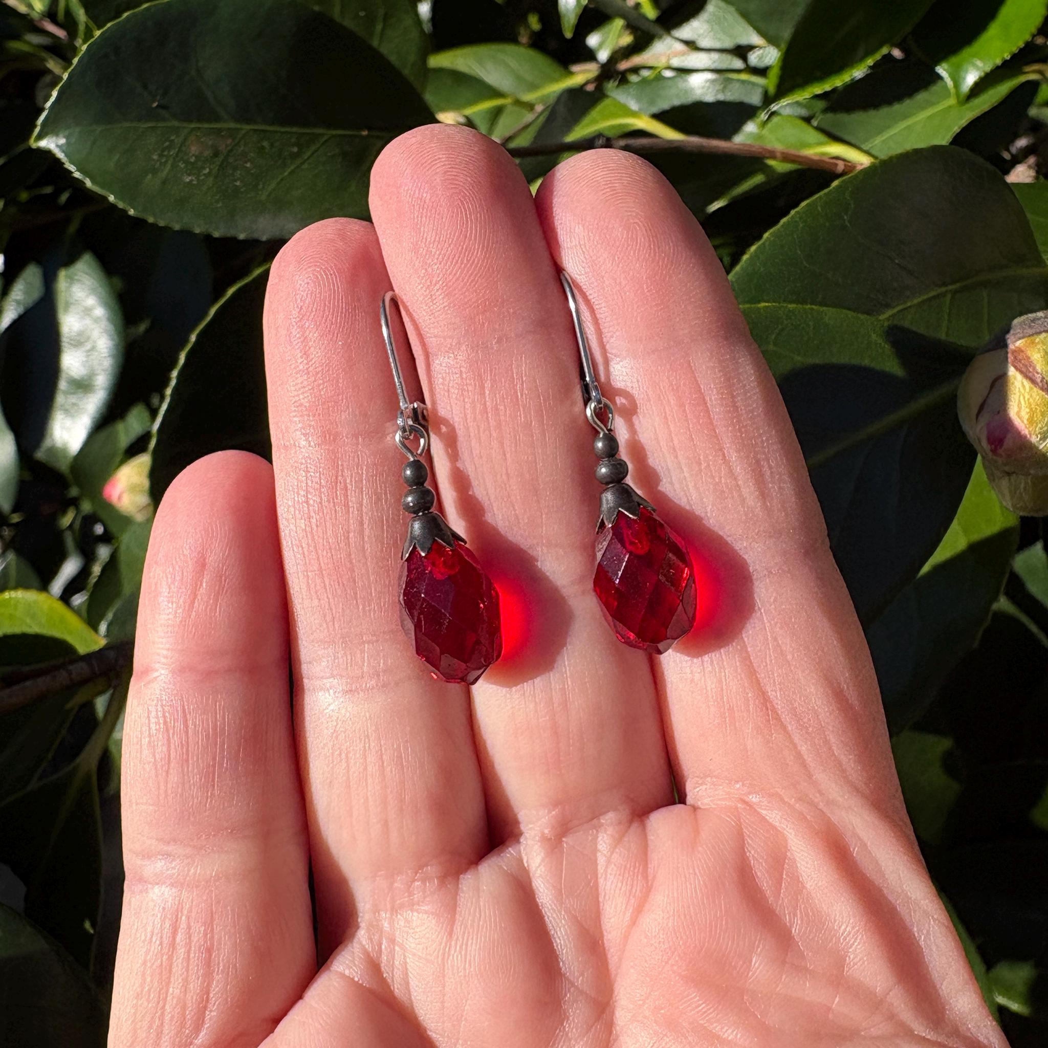 Red glass earrings. Red antique Czechoslovakian glass drops. Metal trim is antiqued bronze. "Bijoux 1" earrings measures 7/8 inches long. Stainless steel lever backs, also available with sterling silver french wires. All handwork done in the USA.