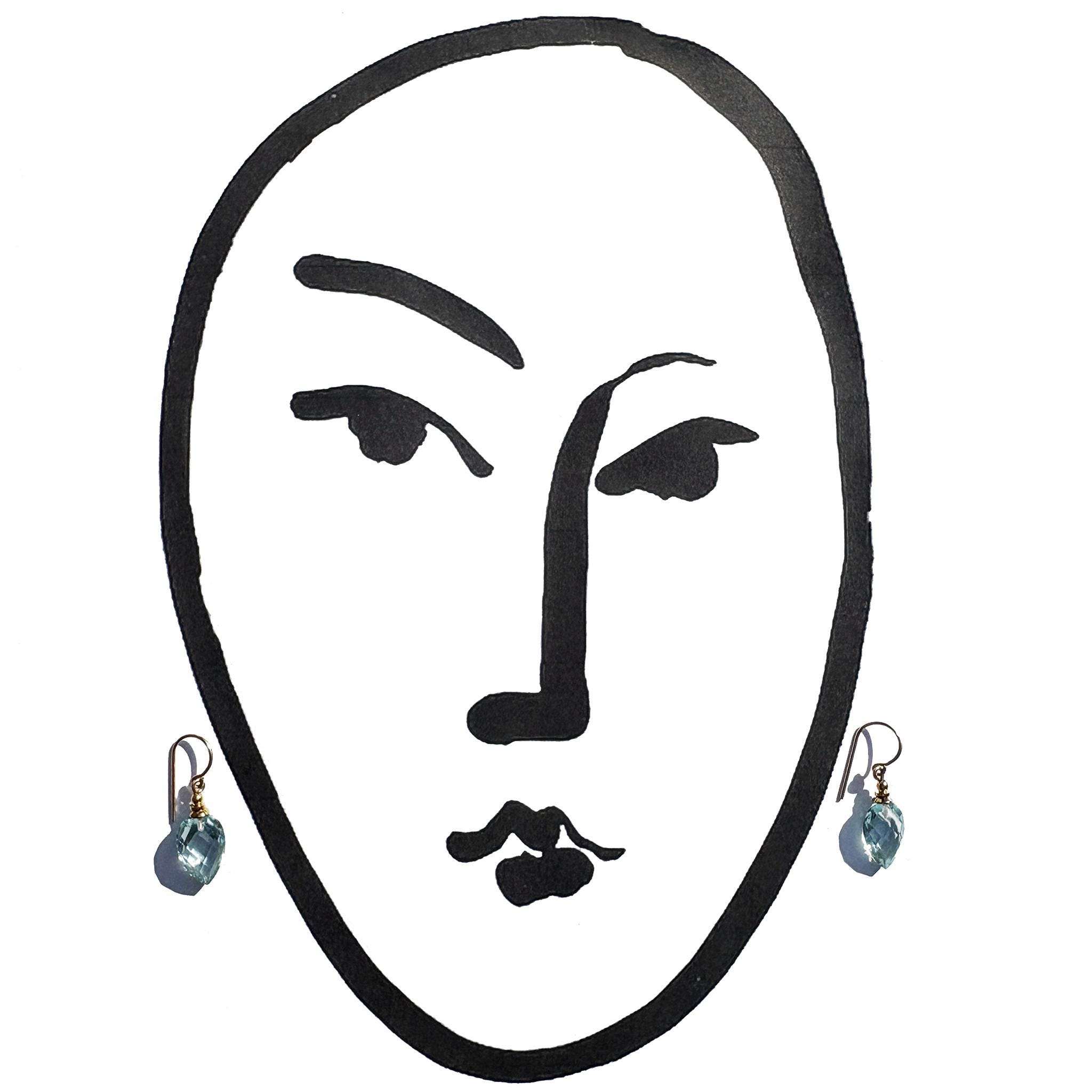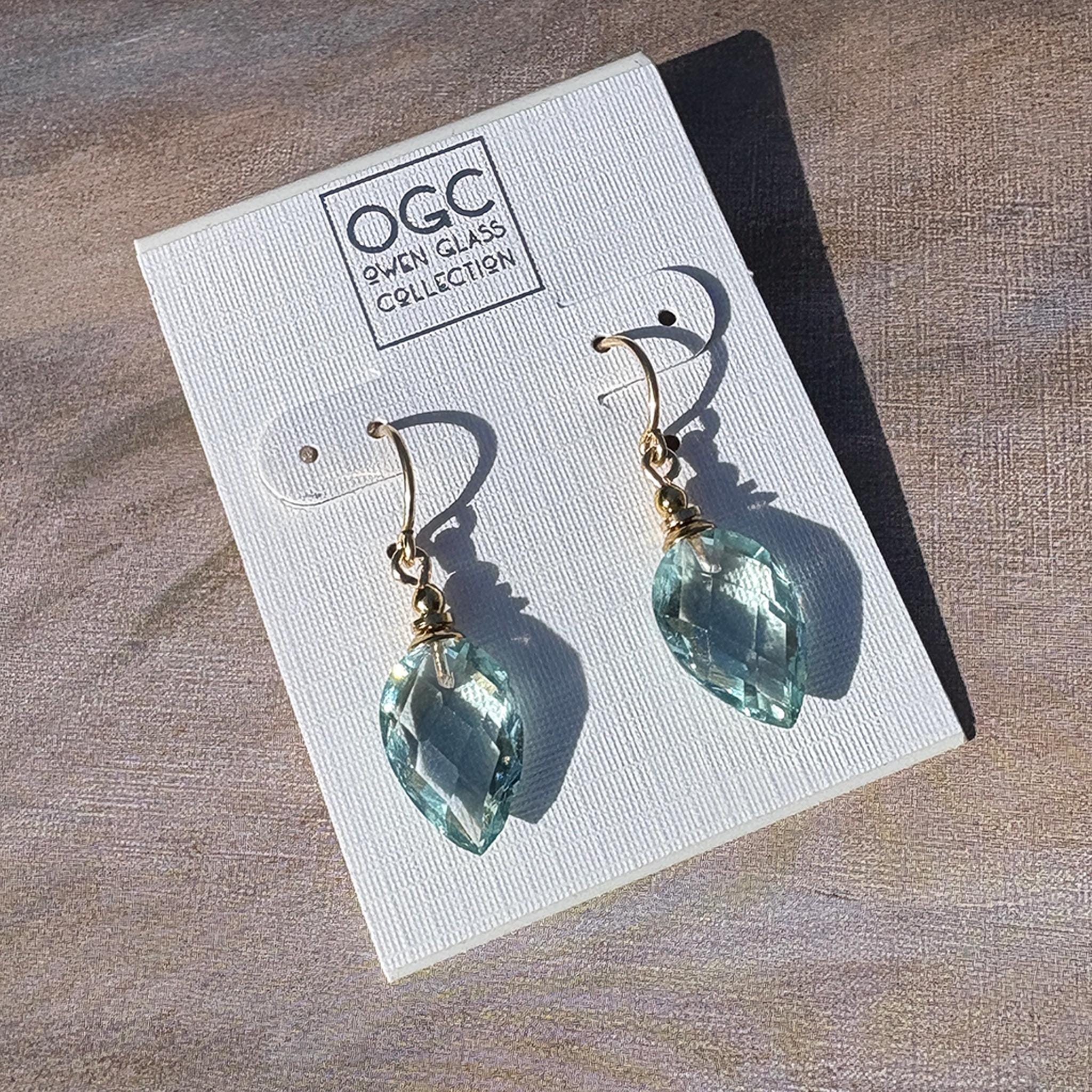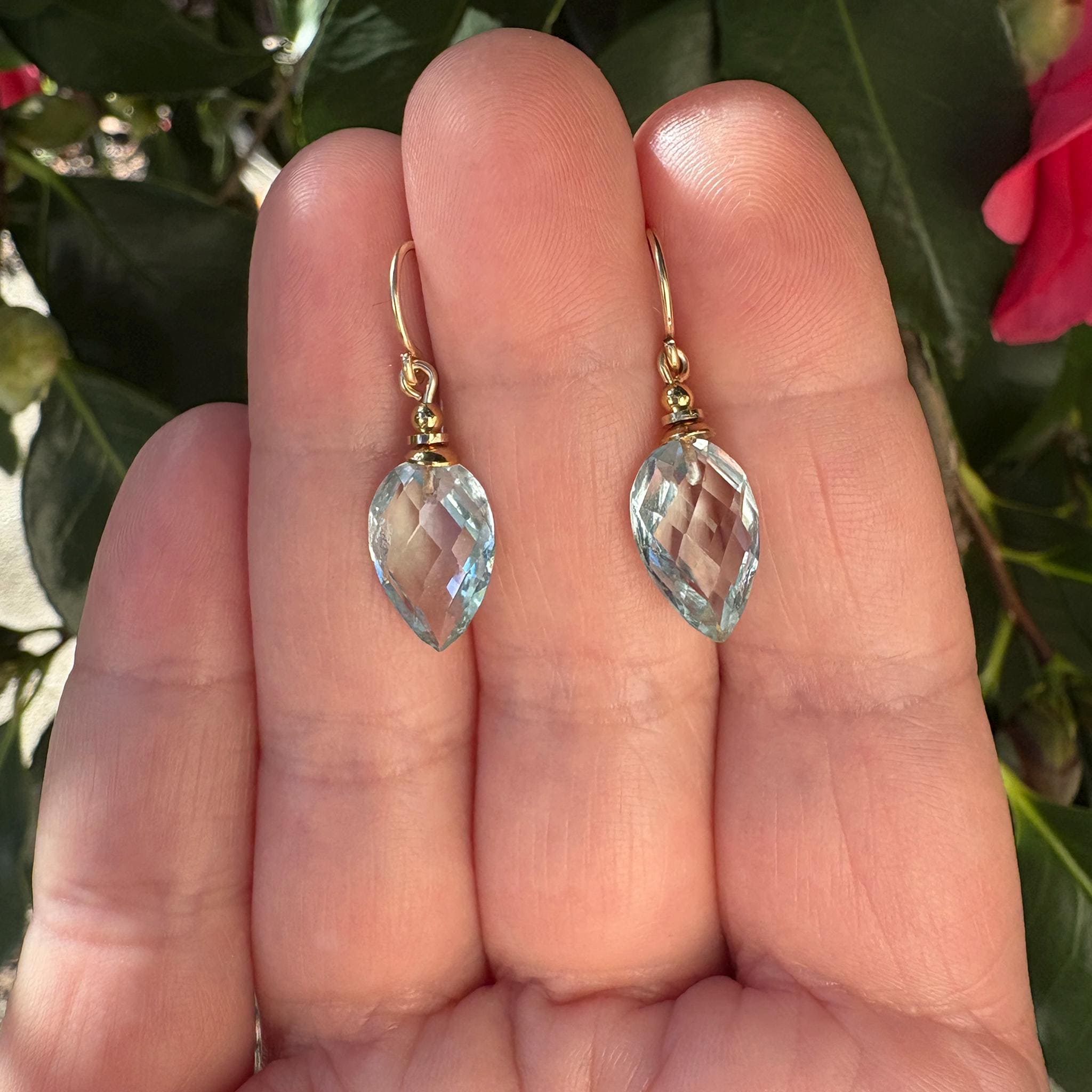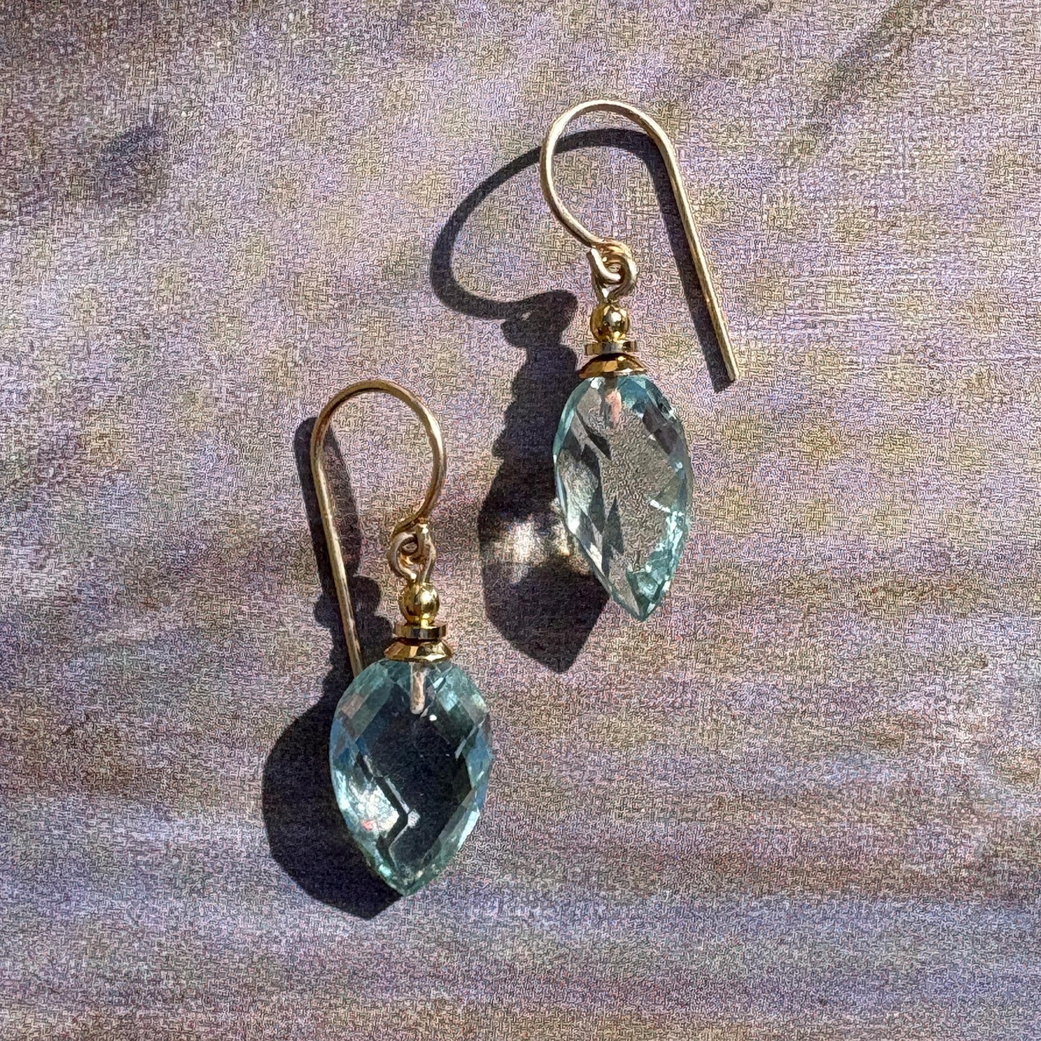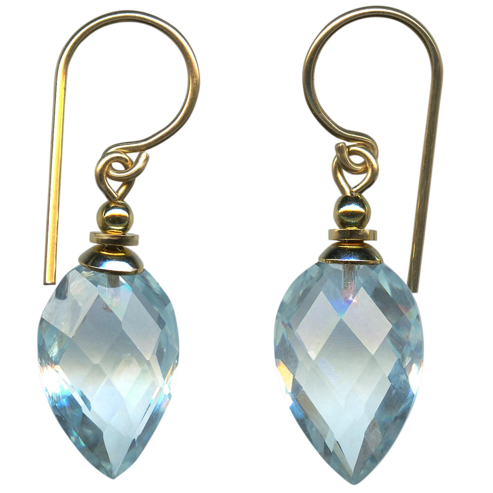 Extra fine faceted aquamarine blue glass drops, made for us in Germany. 14-karat gold-filled ear wires with gold-dipped trim. Harlequin 6 earrings measure 7/8 inch long. All handwork done in the USA.
