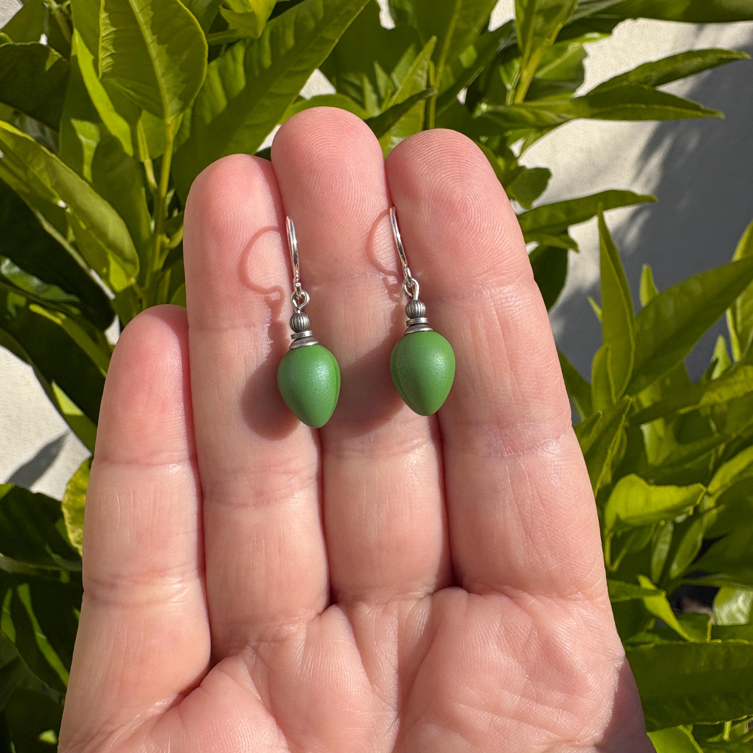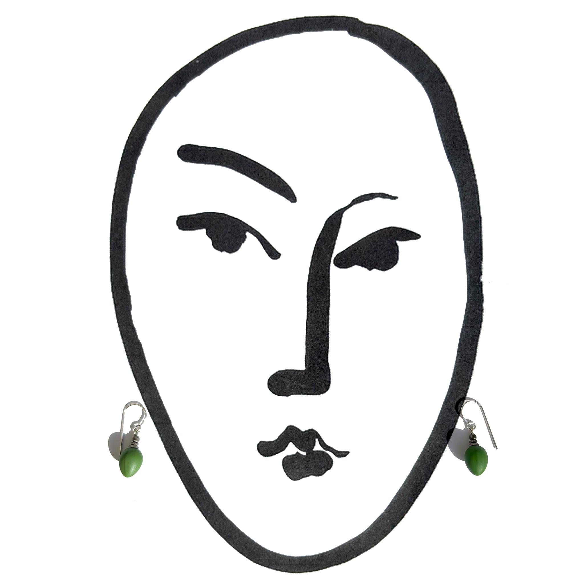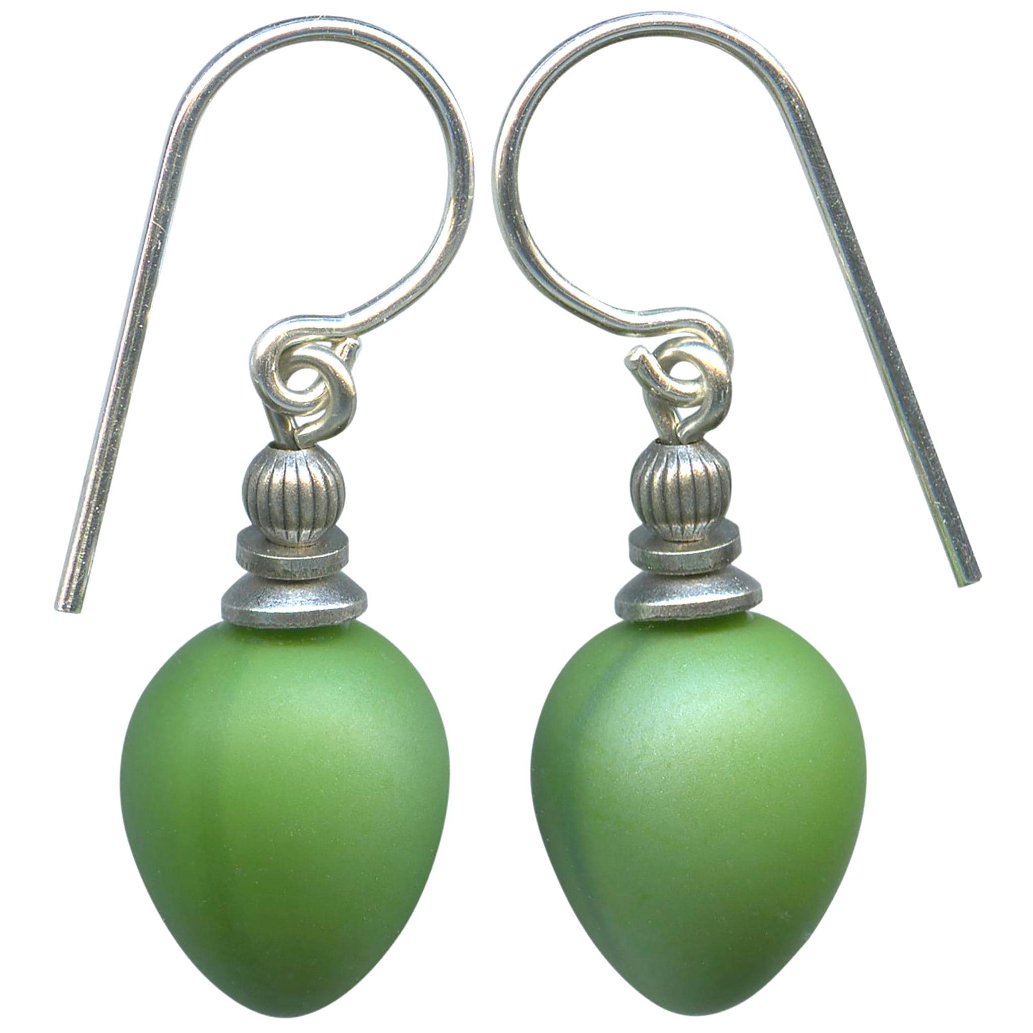 Opaque green glass earrings. These glass drops were designed by Allen Owen and made for us in Germany. Metal trim is antiqued silver plate with sterling silver ear wires. "Mini Berries 34" earrings measure 3/4 inches long. All handwork done in the USA.
