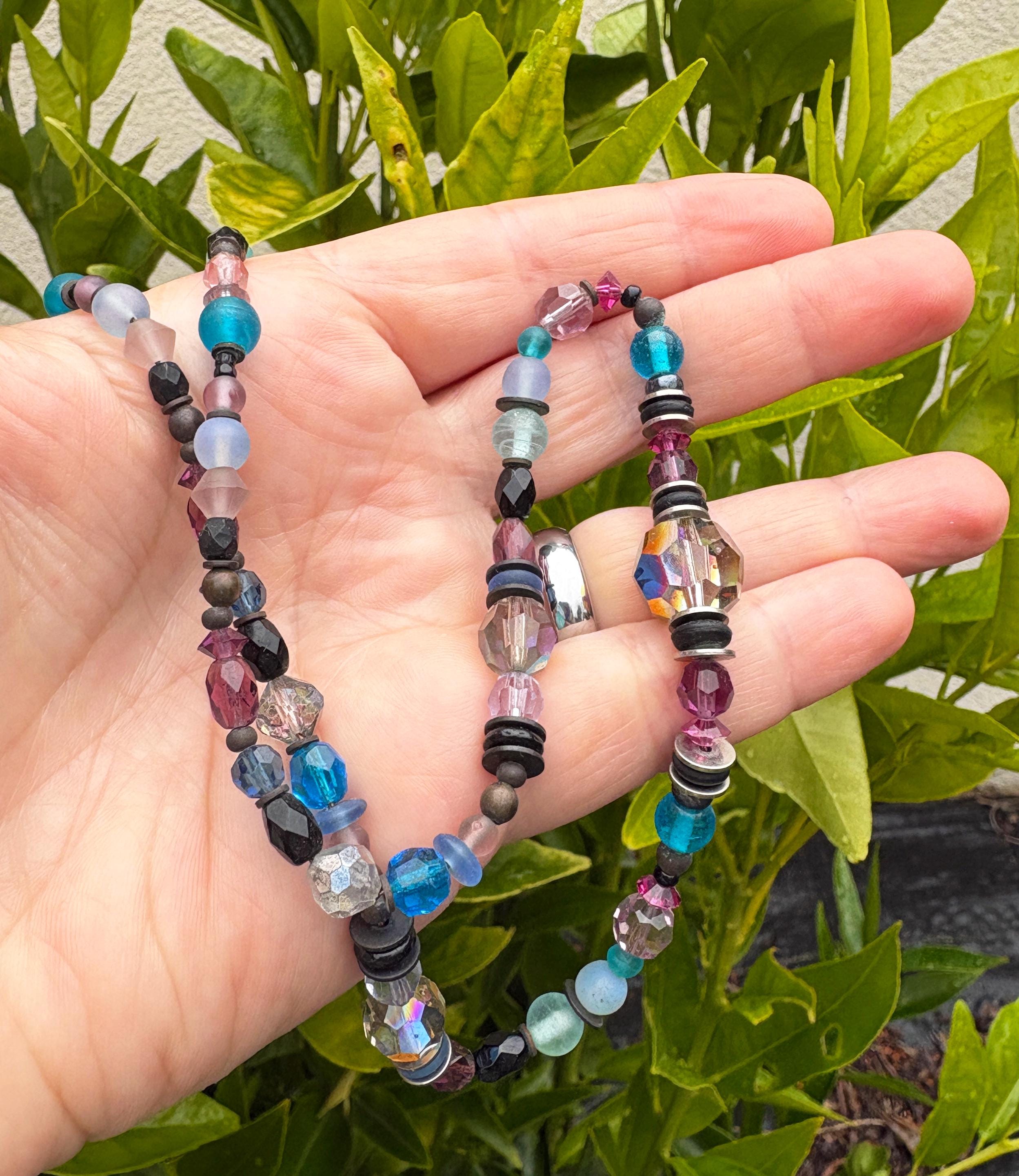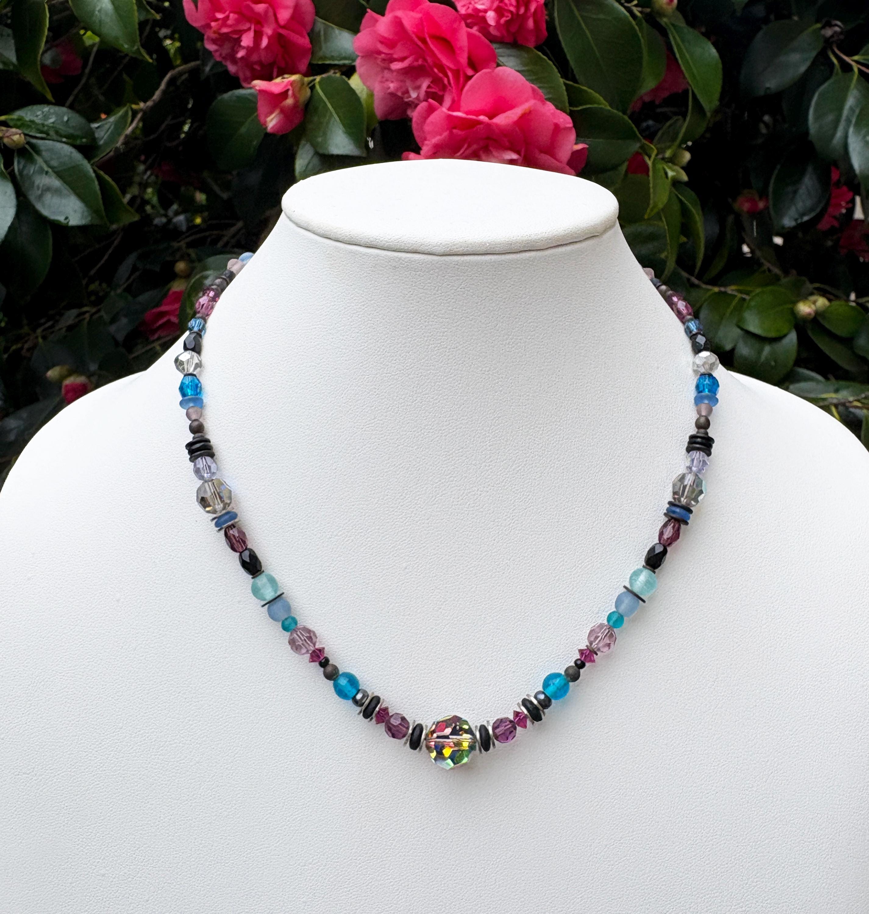 18-inch beaded necklace in shades of crystal, amethyst, turquoise, and fuchsia. Austrian crystal, antique Czech glass and bronze accents. "Remember Louis XIV" necklace is handmade in the USA. A 2 inch extender is included.