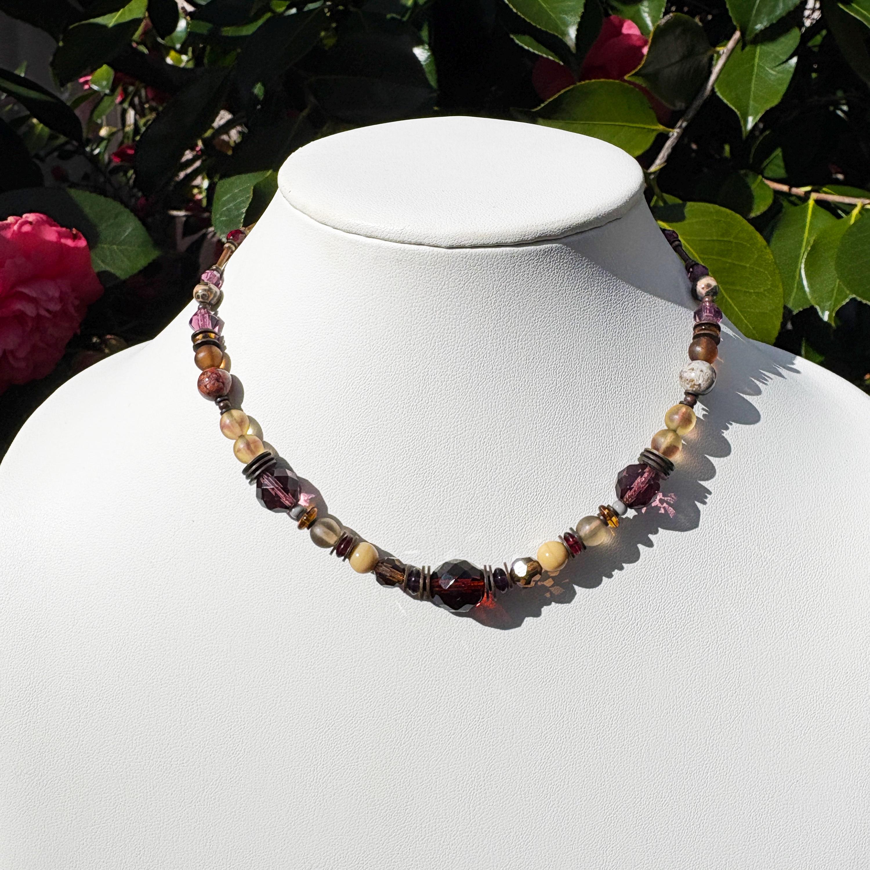 Earth-toned beaded necklace. Austrian crystal and antique Czechoslovakian glass from our collection in shades of smoke topaz, amethyst and garnet with jasper gemstone accents. Many of the beads are rare and irreplaceable, circa 1920-1930, originating from Czechoslovakia, Bavaria, Wattens, Kobe and Milano. Metal parts from our own tooling are antiqued bronze. "Rinky Dinky Parlez-Vous" is 16 inches long. A 2-inch extender is included. All handwork done in the USA.