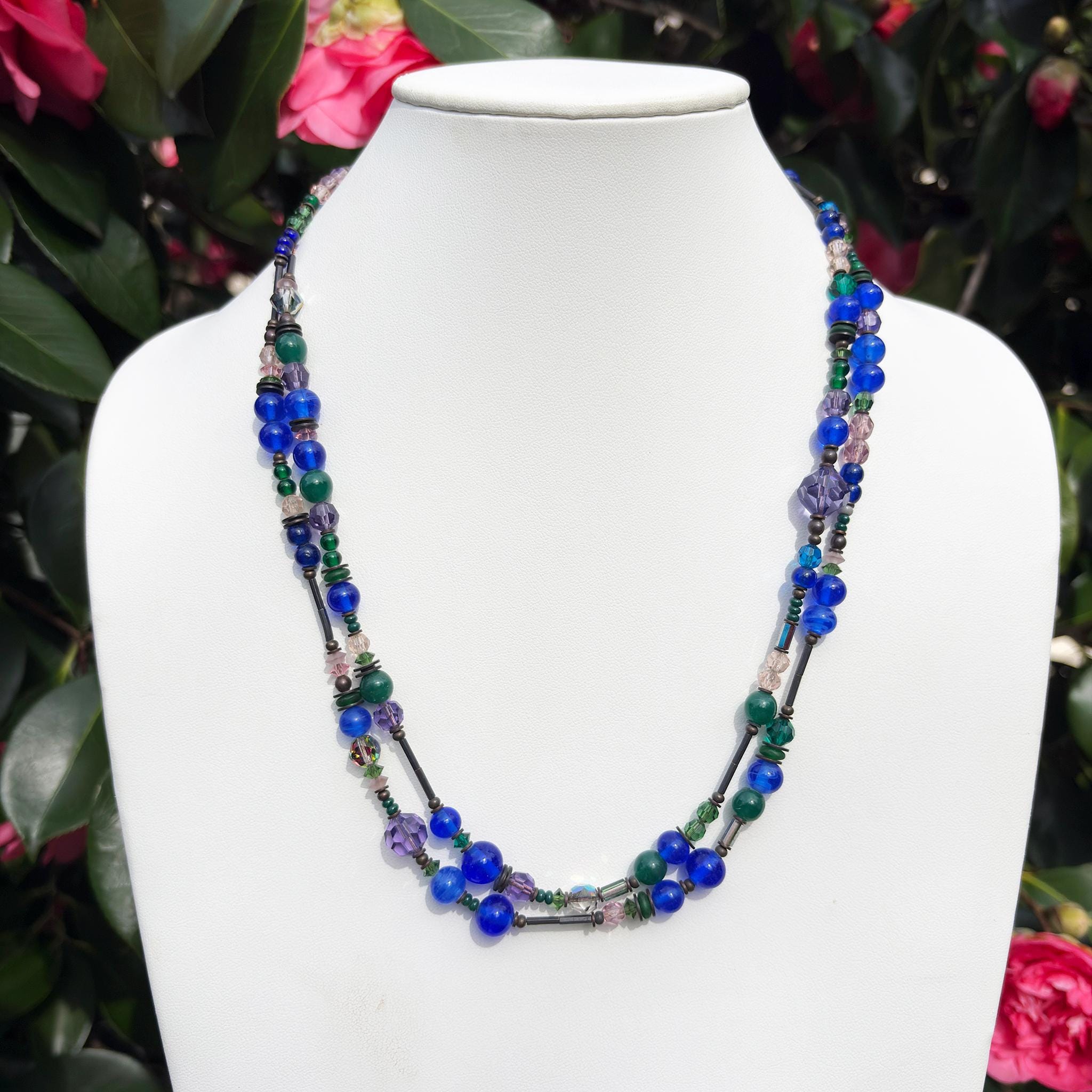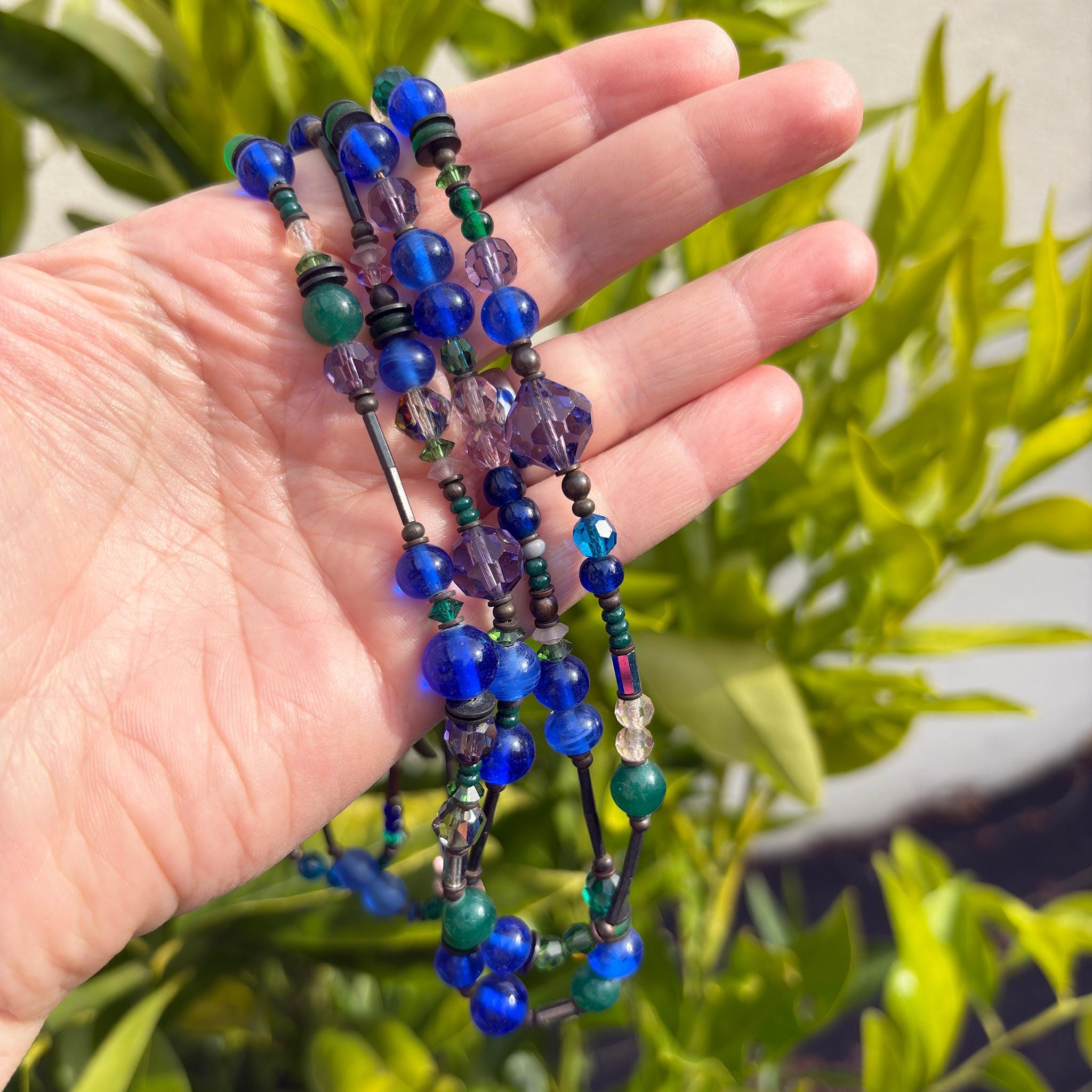 46-inch long beaded necklace. Antique Japanese and Czech glass with Austrian crystal. Antiqued bronze trim. "Middle Distance" necklace comes with a 2-inch extender. Handmade in the USA.
