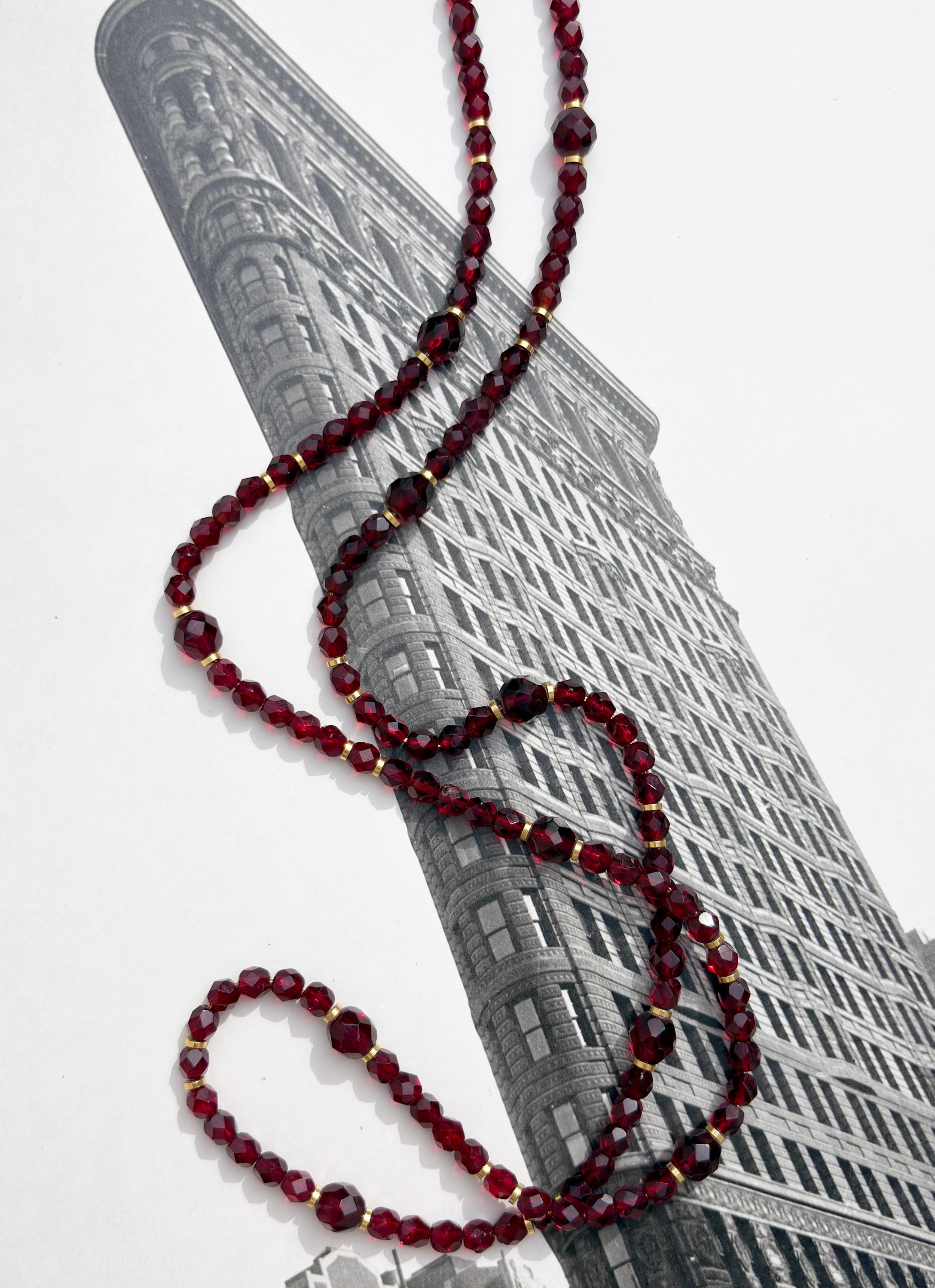 Garnet beaded necklace. Czech glass with 14-karat gold-dipped accents. "Bordeaux" necklace is 30 inches long. A 2 inch extender is included. Handmade in the USA.