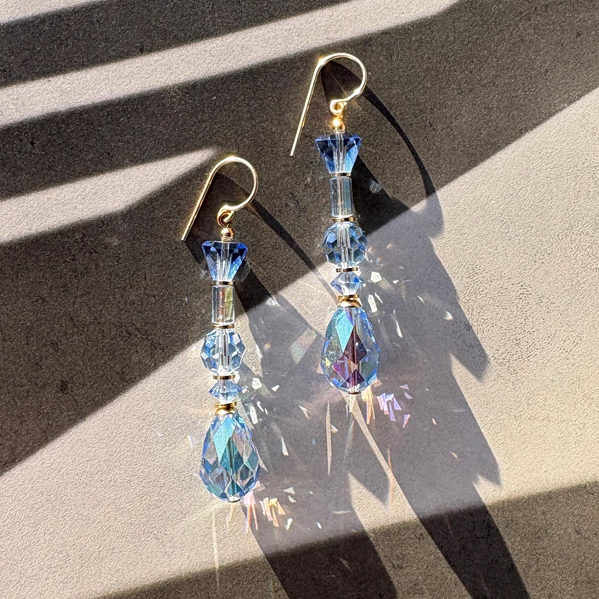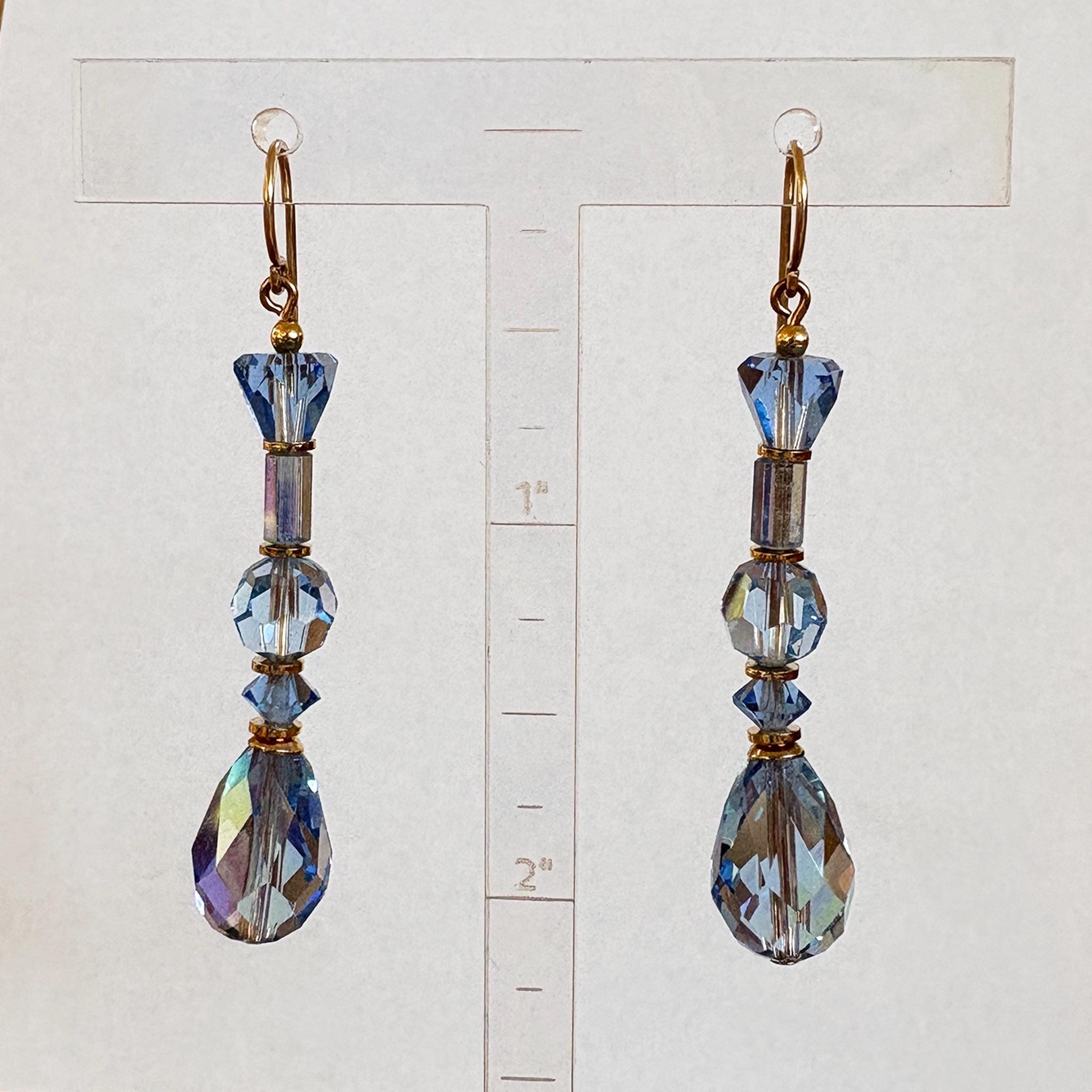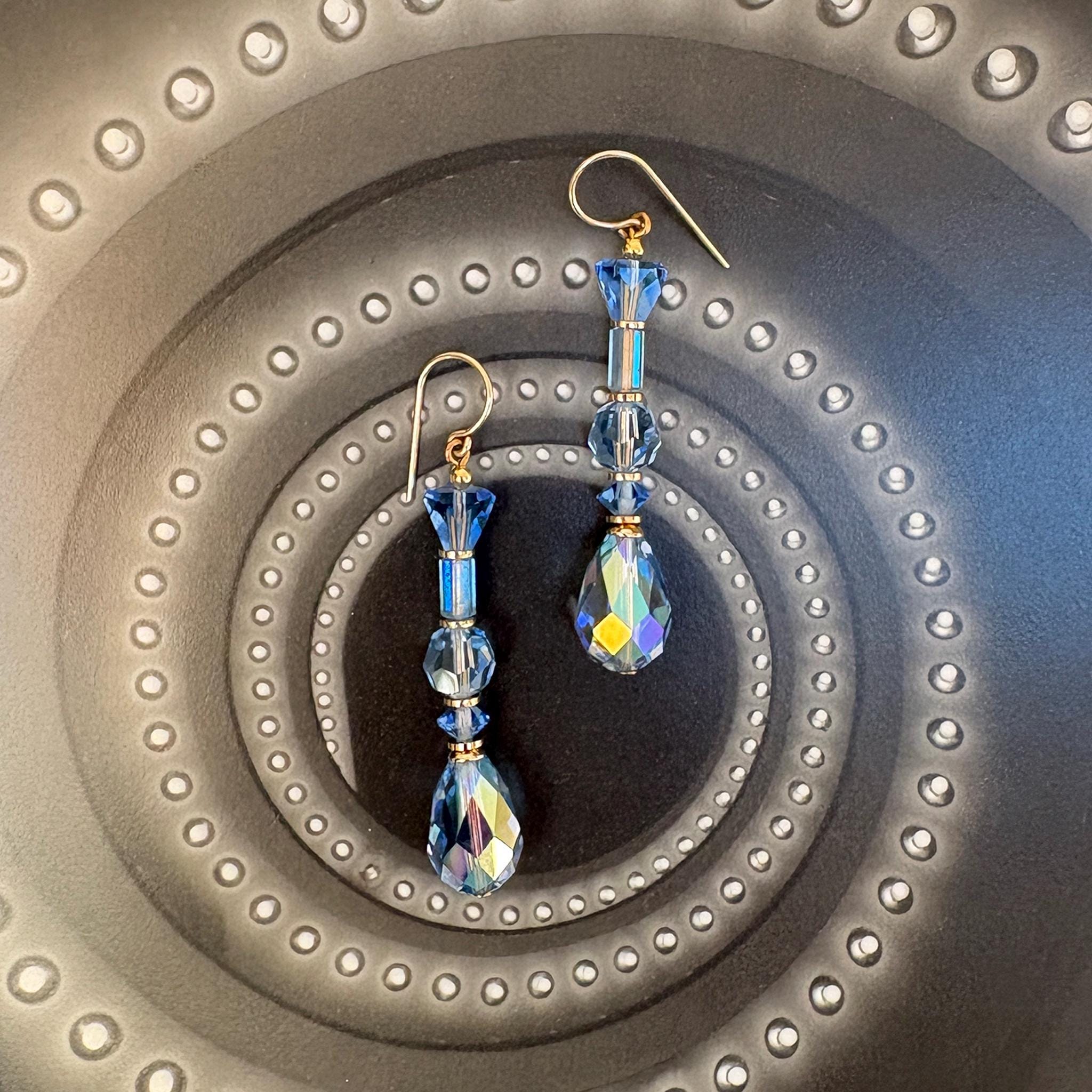 Light sapphire crystal earrings. Light blue iridescent Austrian crystal earrings. "Foxtrot 10" earrings measure 2 inches in length. Metal trim is gold dipped with 14-karat gold-filled ear wires. All handwork done in the USA.