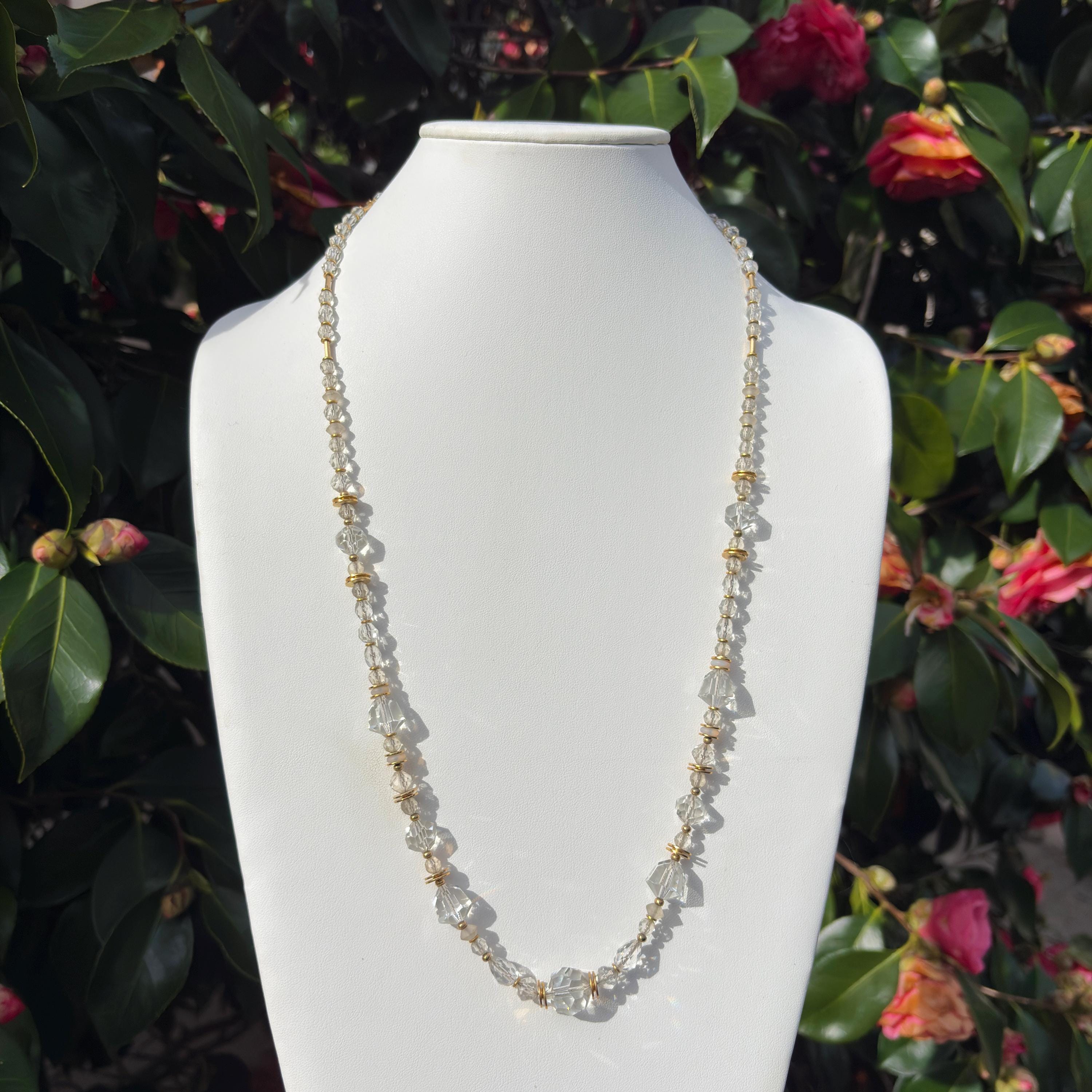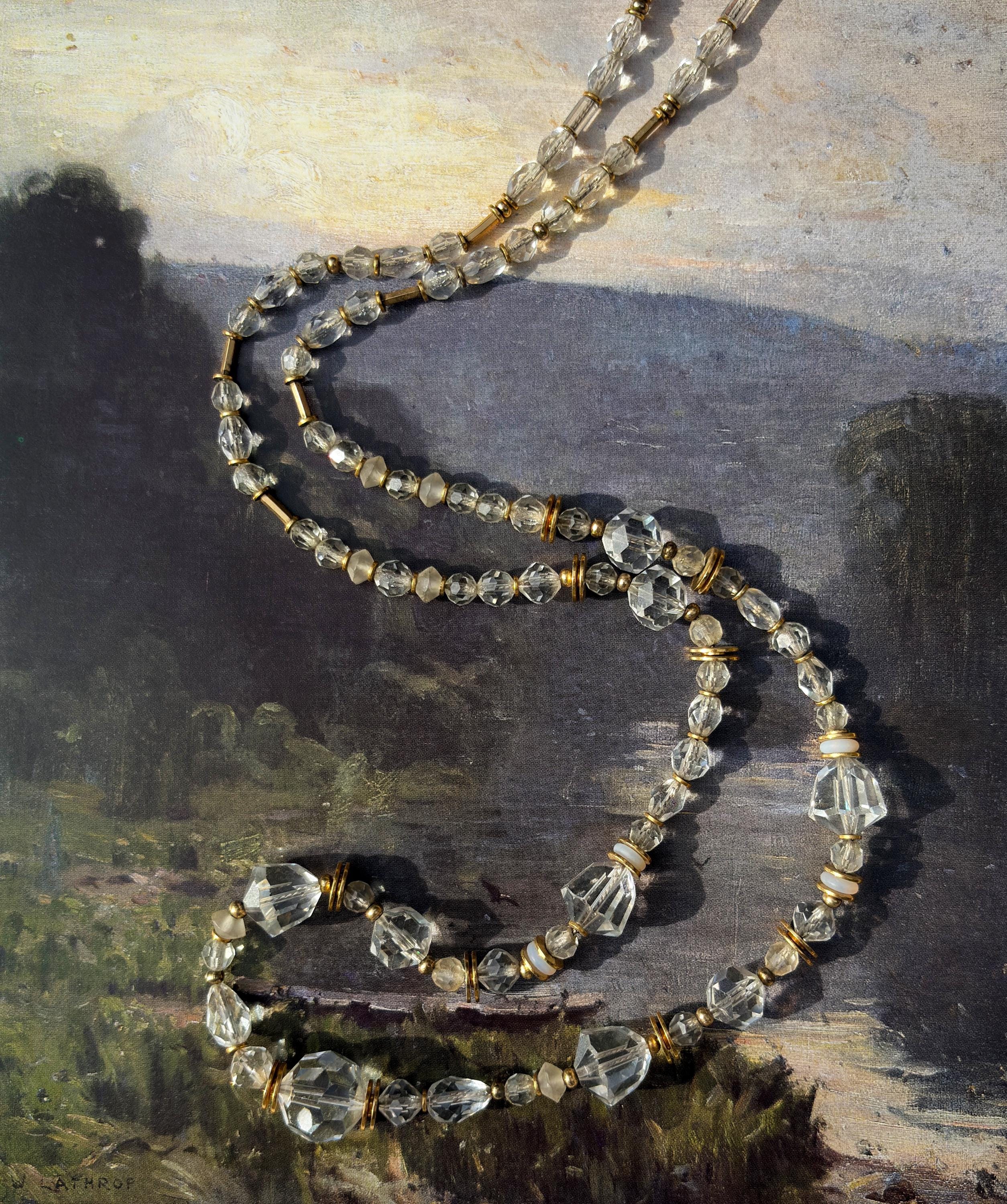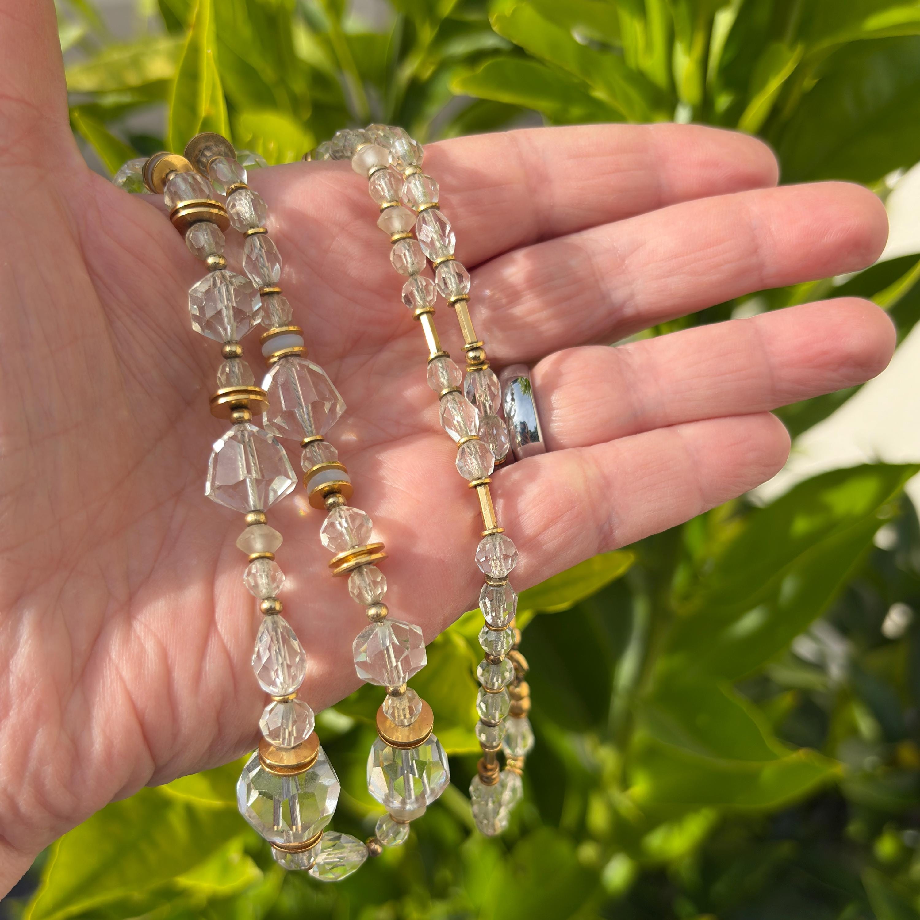 30-inch crystal beaded necklace. Rare Czech glass and Austrian crystal, from our collection. Many of the beads are rare and irreplaceable, circa 1920-1930, originating from Czechoslovakia, Bavaria, Wattens, Kobe and Milano. Metal parts from our own tooling are 14-karat gold dipped. "White Light" is 30 inches long, handmade in the USA. A 2-inch extender is included.