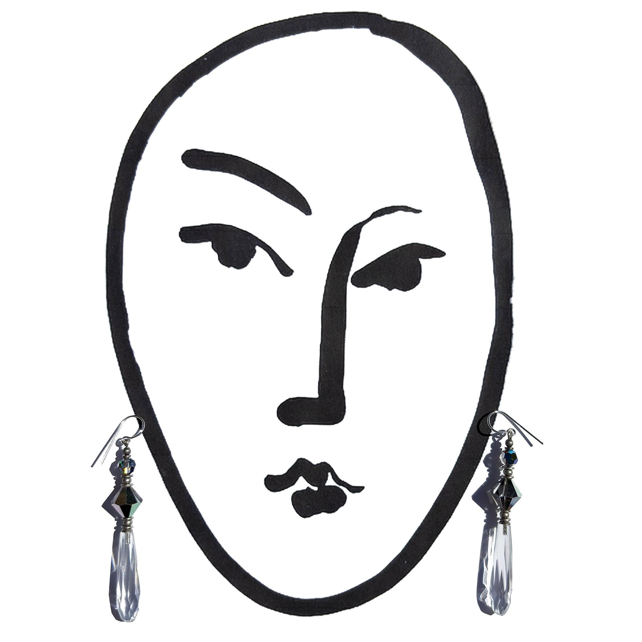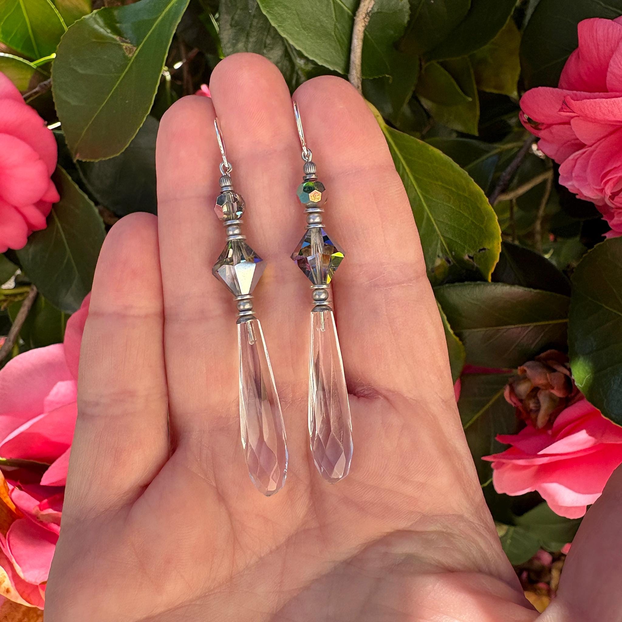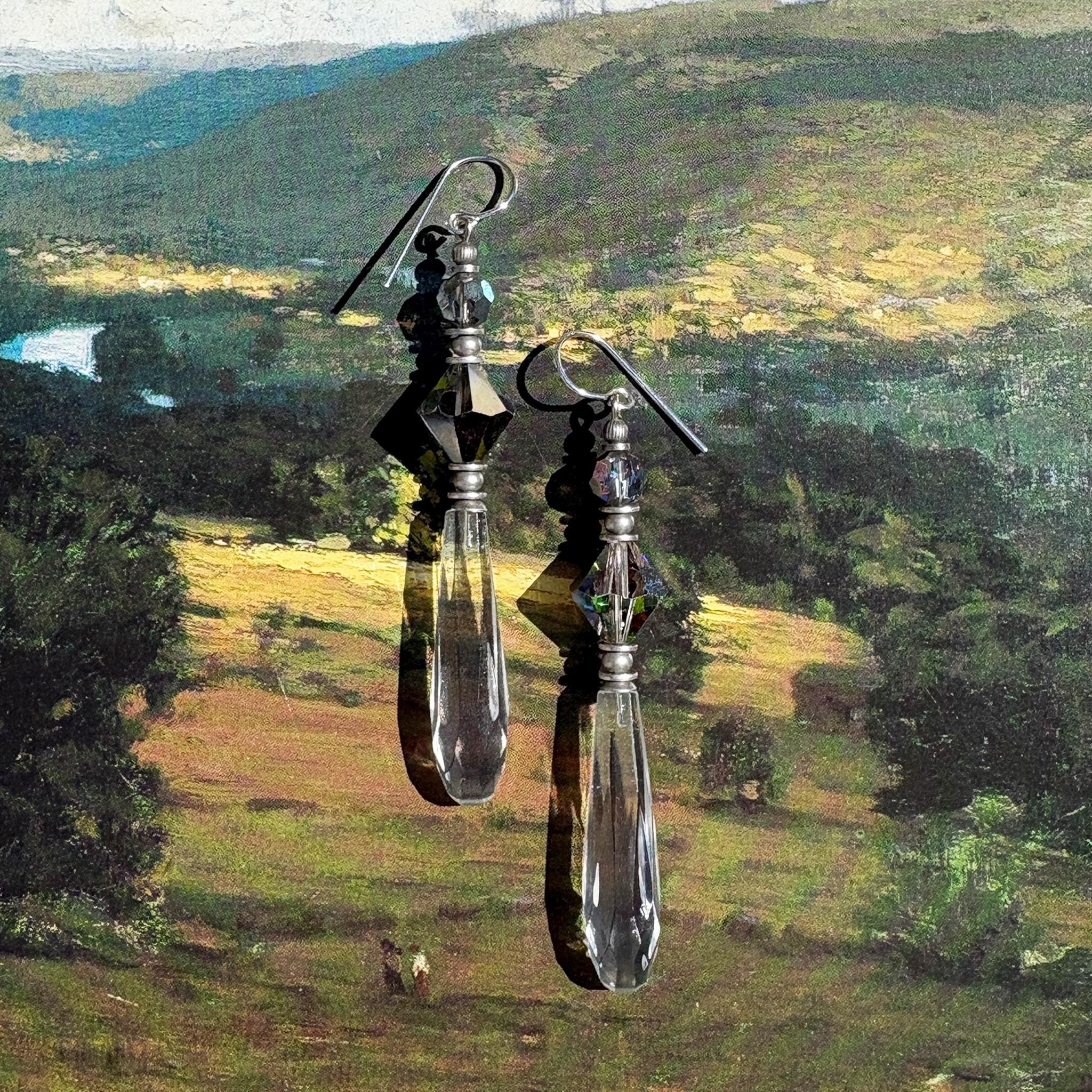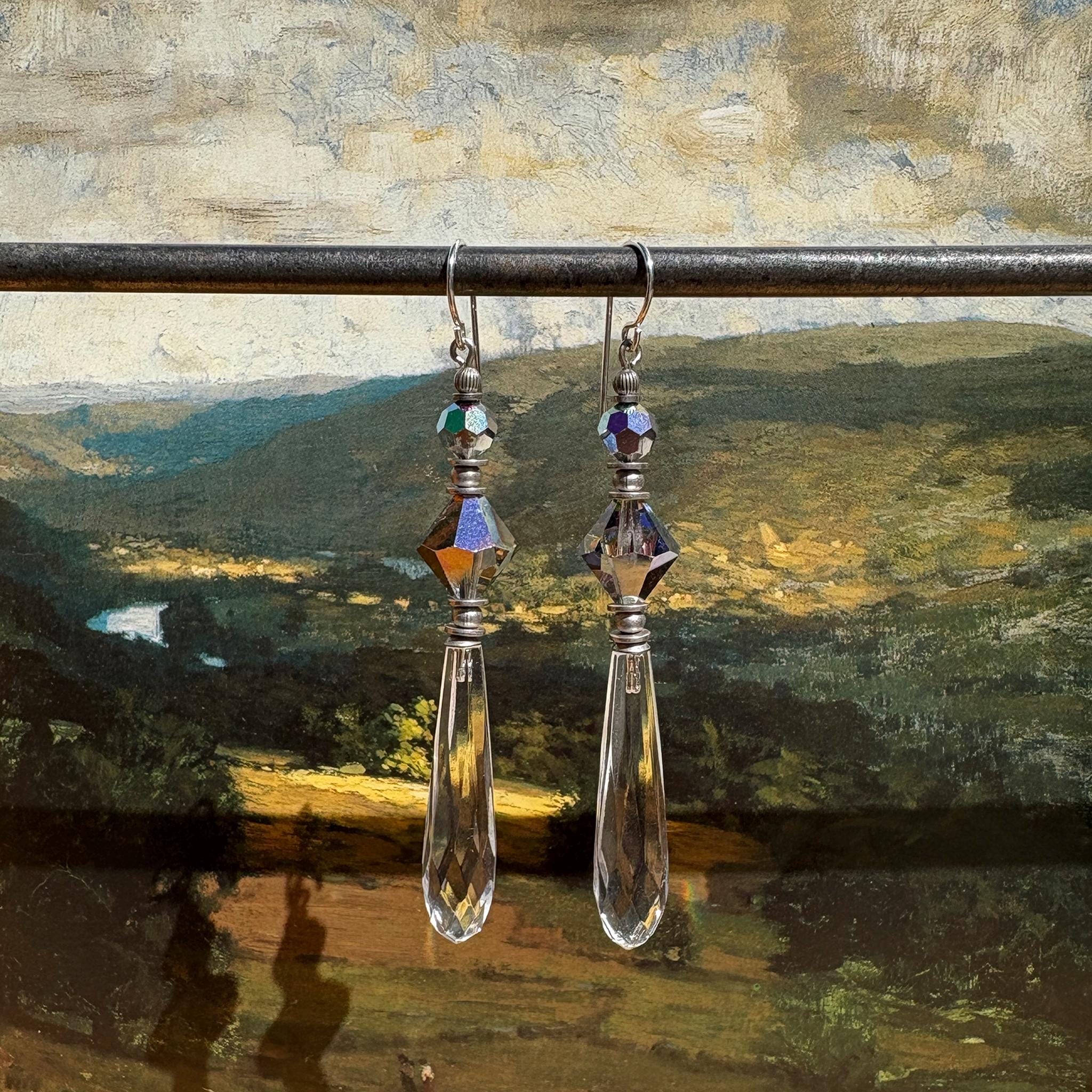 Clear crystal chandelier earrings. Clear glass prisms, designed by Allen Owen and made for us in Germany. Top beads are iridescent Austrian crystal. "Style 74" earrings measure 2.5 inches long. Metal trim is antiqued silver dipped with sterling silver ear wires. All handwork done in the USA.