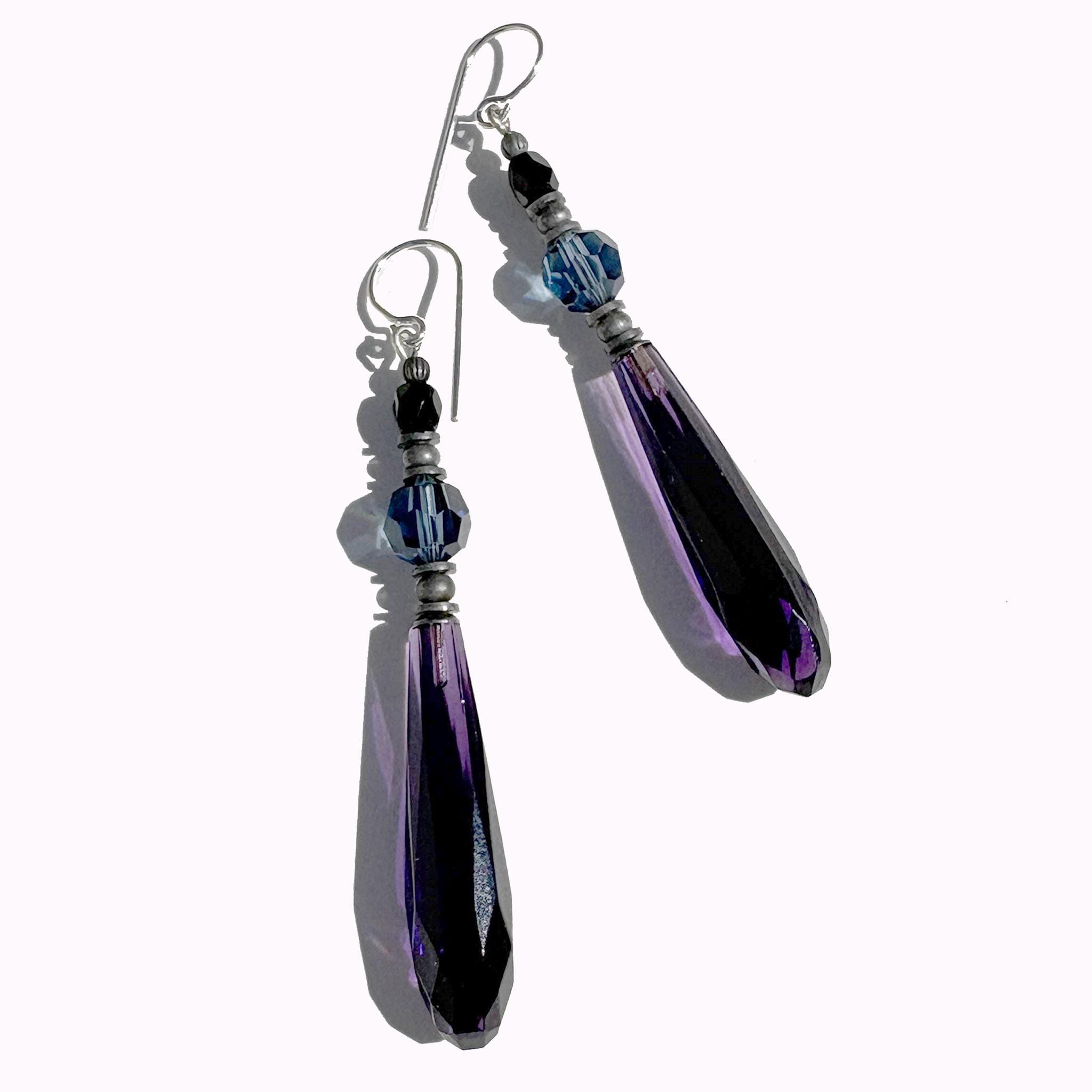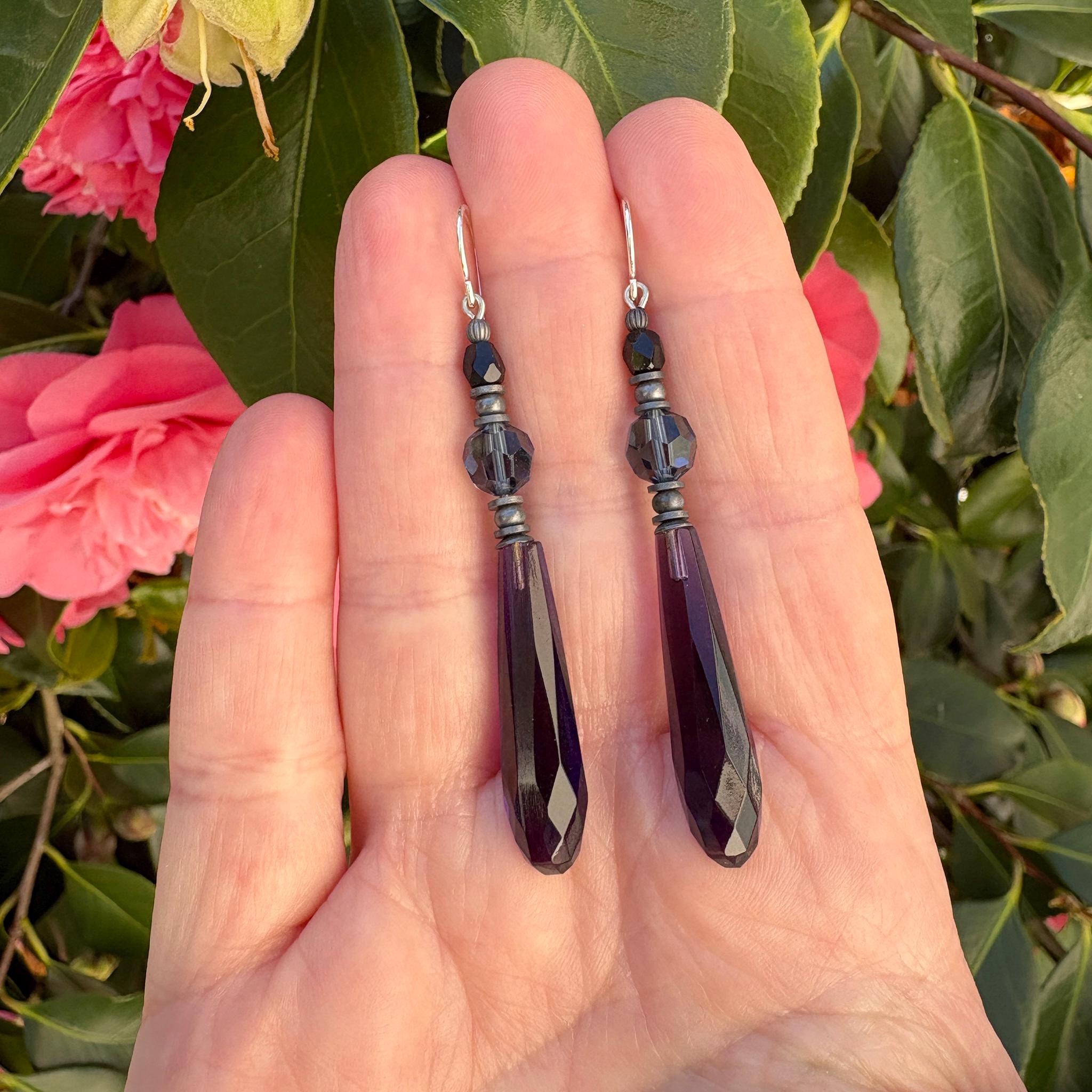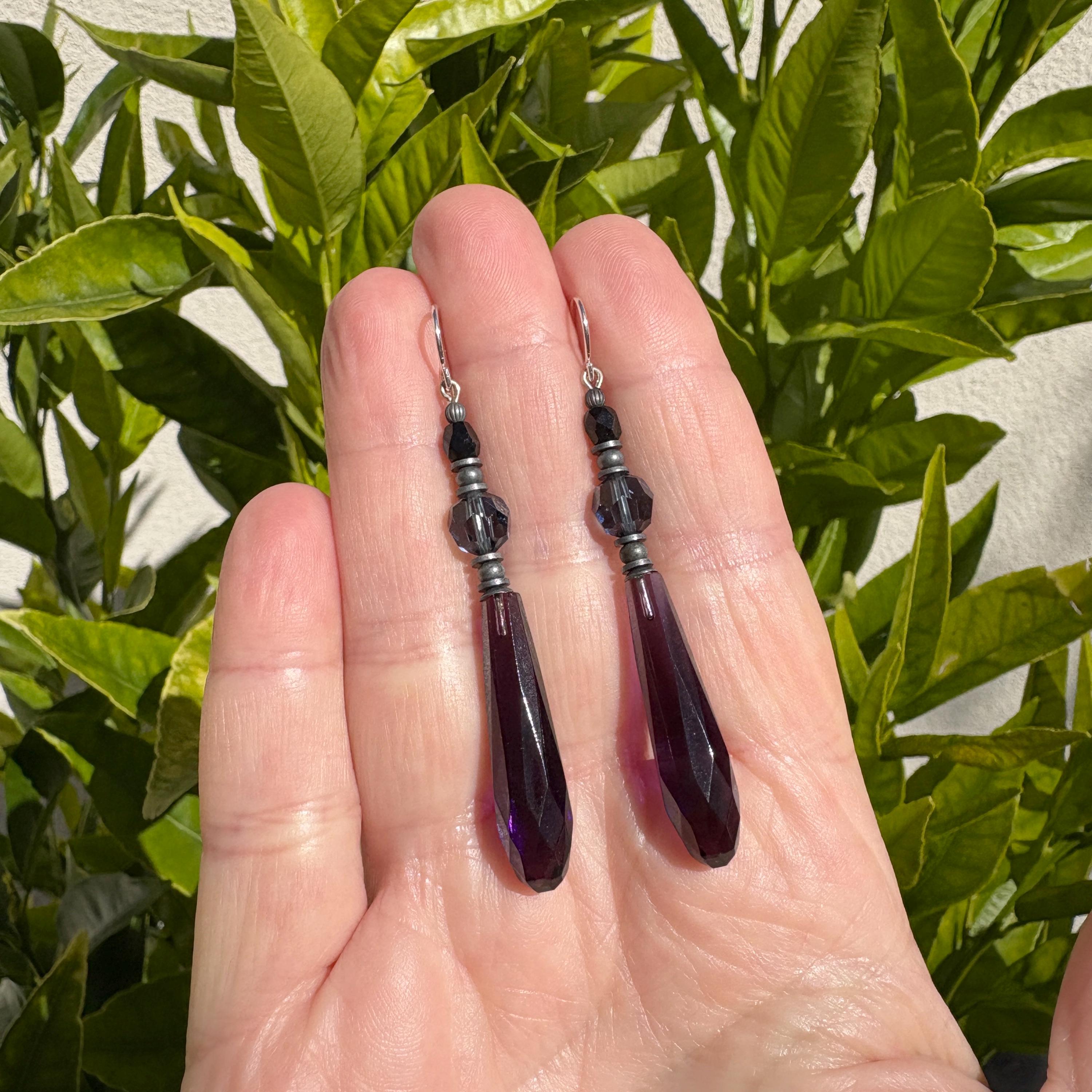 Amethyst glass earrings. Dark purple drops, designed by Allen Owen and made for us in Germany. Focal beads are indigo Austrian crystal and antique jet Czech glass top beads. Antique sterling silver dipped trim with sterling silver earwires. Style 90 earrings measure 2.25 inches in length. All handwork done in the USA.