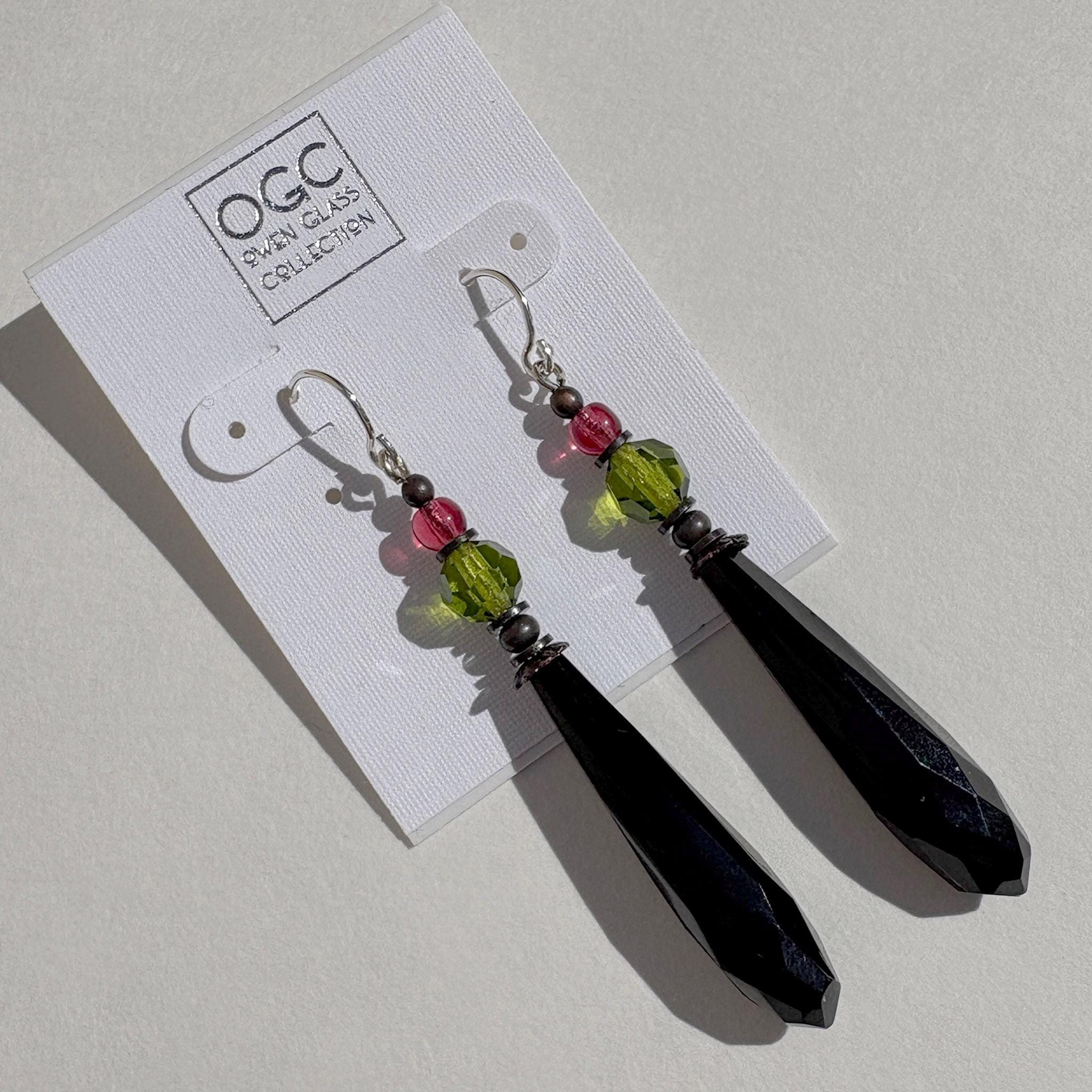 Jet prism earrings. Antique Czech glass drops, circa 1920-1930s, from our collection. Top beads in pink and green are Czech glass. Metal trim, from our own tooling, is antiqued bronze with sterling silver ear wires. Style "147A" earrings are 2 inches long. All handwork done in the USA..