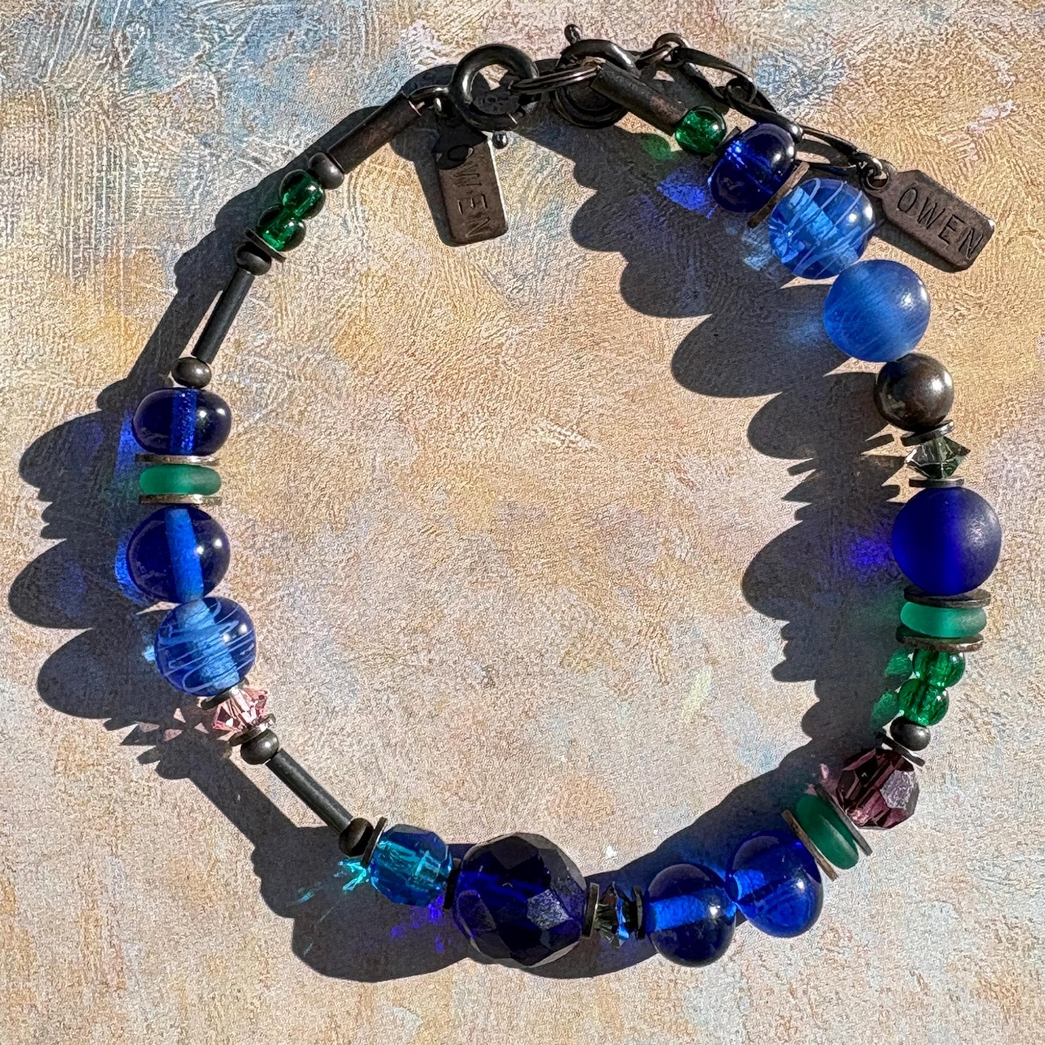 Cobalt blue bracelet. Austrian crystal and Czechoslovakian glass from our collection in shades of cobalt, emerald, amethyst and light rose. Many of the beads are rare and irreplaceable, originating from Czechoslovakia, Bavaria, Wattens, Kobe and Milano. Metal parts from our own tooling are antiqued bronze. "Middle Distance" bracelet is 7 inches long, handmade in the USA. A 1 inch extender is included.