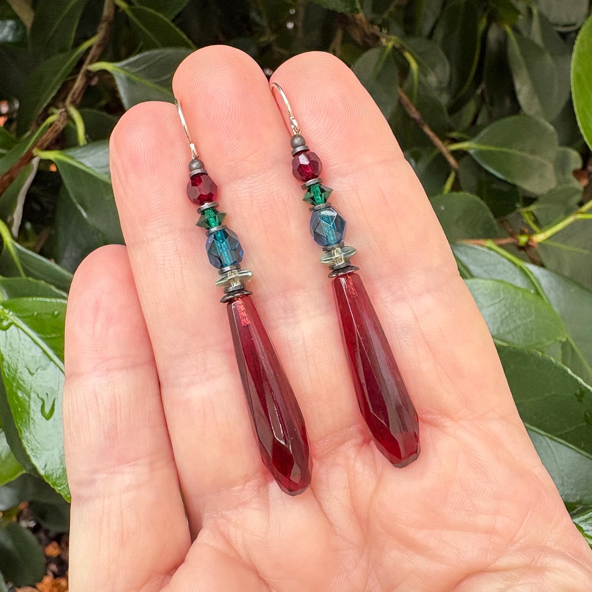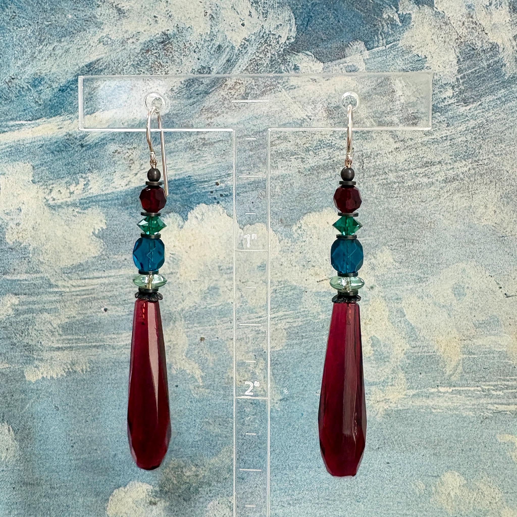 Burgundy red chandelier earrings. Garnet German glass prisms with Czech glass and Austrian crystal in garnet, emerald, turquoise and light peridot. Metal trim is antiqued bronze, from our own tooling, with sterling silver ear wires. These earrings measure 2.25 inches in length. All handwork done in the USA.