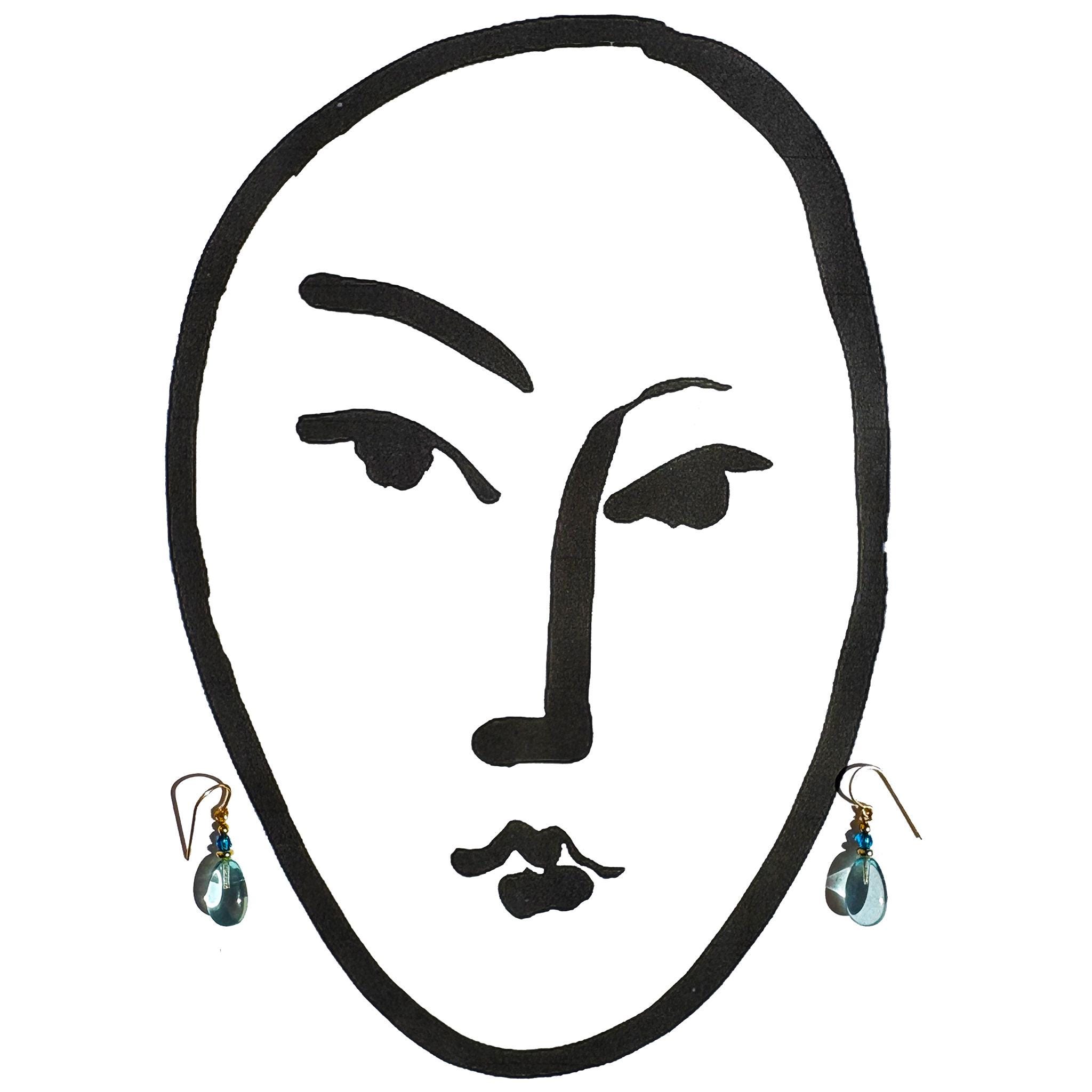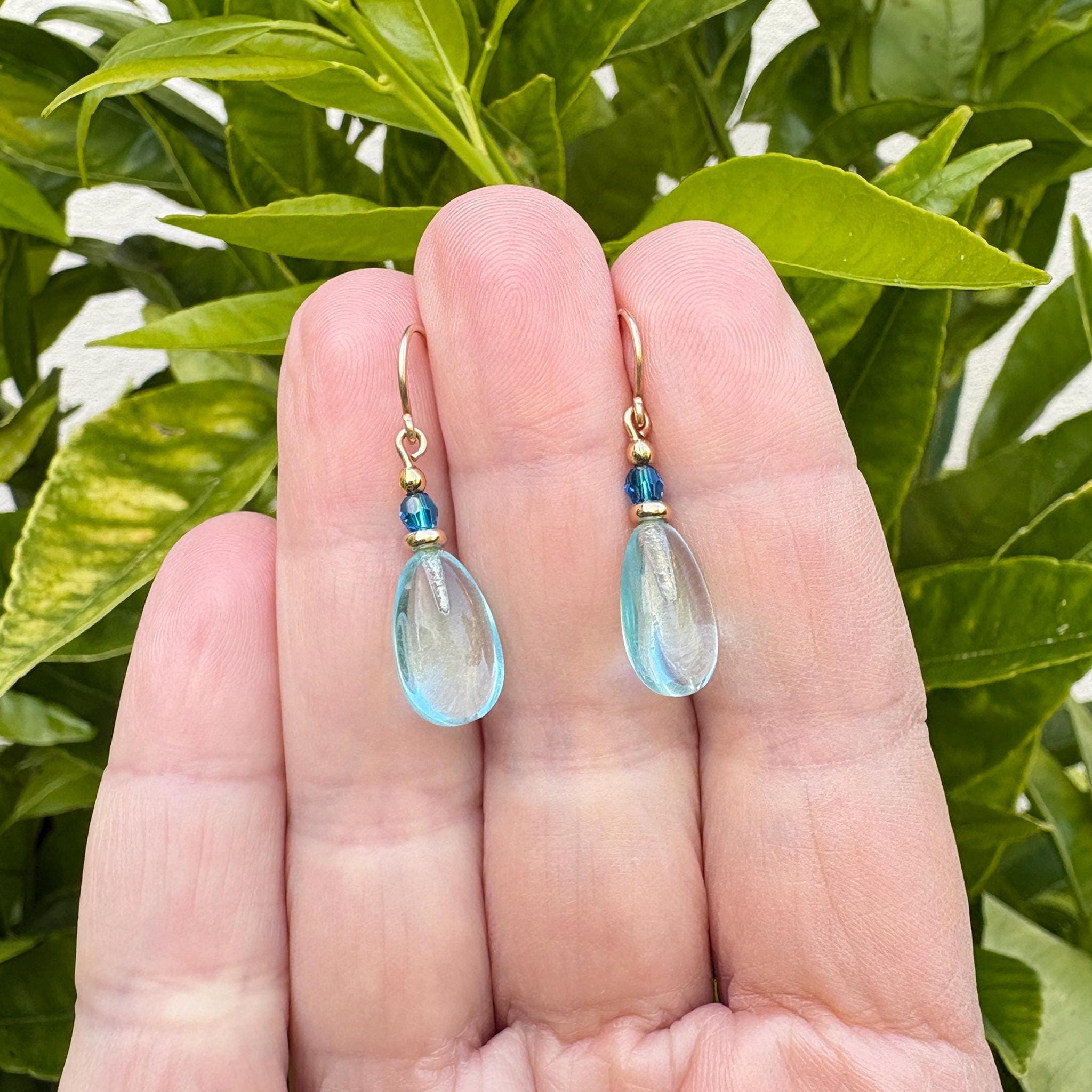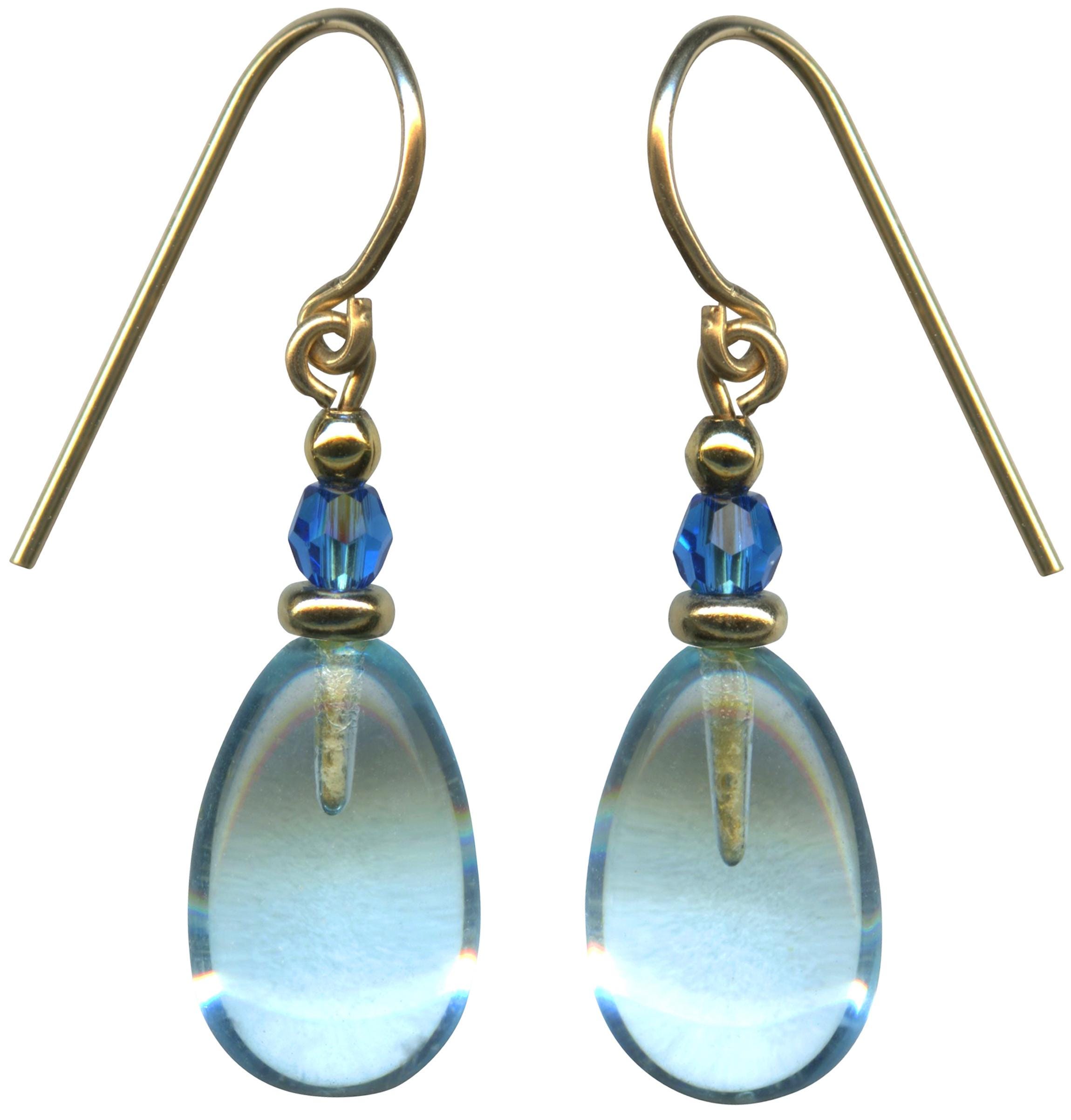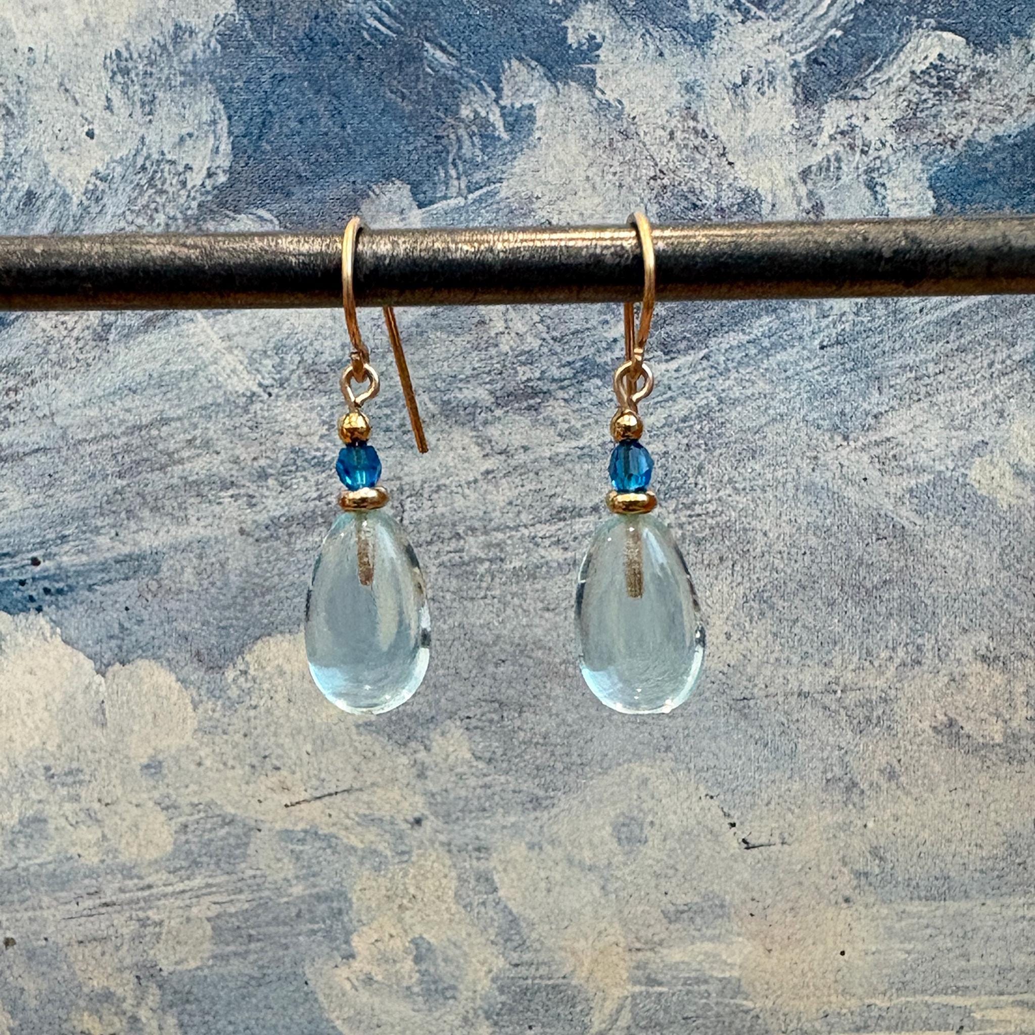 Aqua, turquoise and gold dangle earrings. Aquamarine glass drop earrings with turquoise Austrian crystal accents. Ear wires are 14 karat gold-filled. "Raindrops 109" measure 7/8 inches long. All handwork done in the USA.