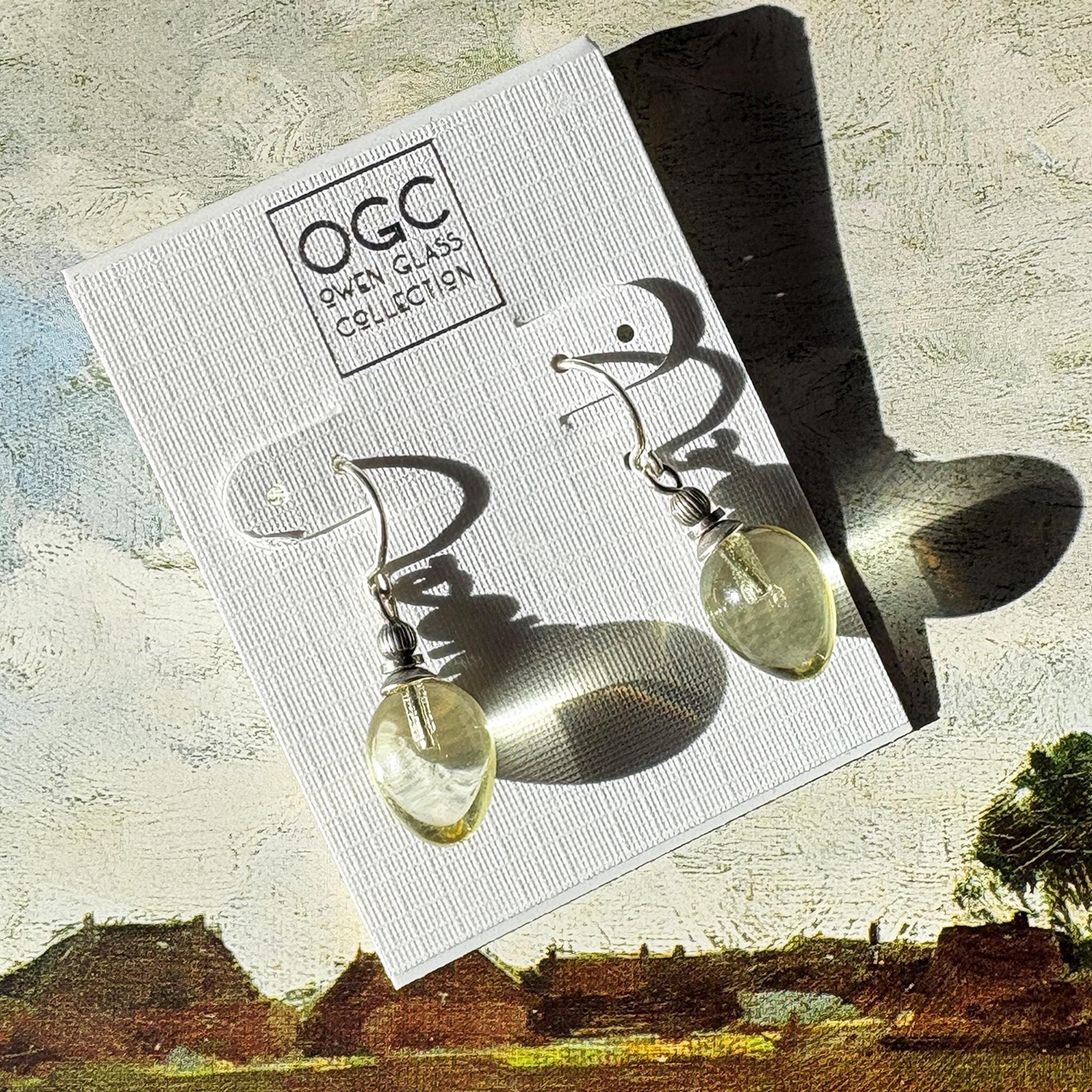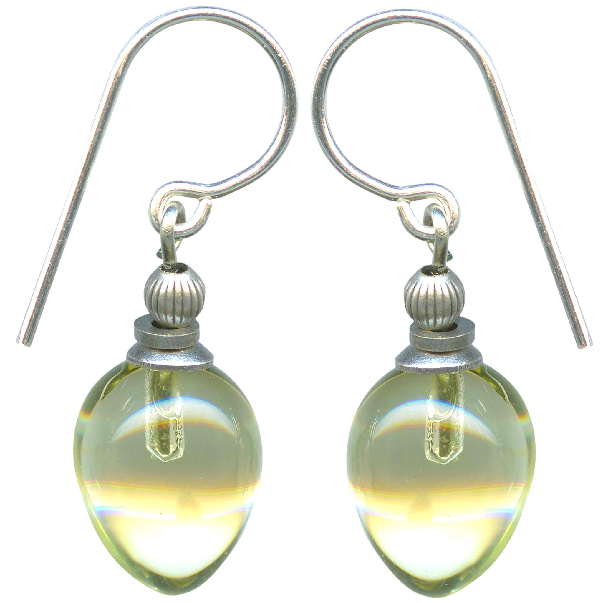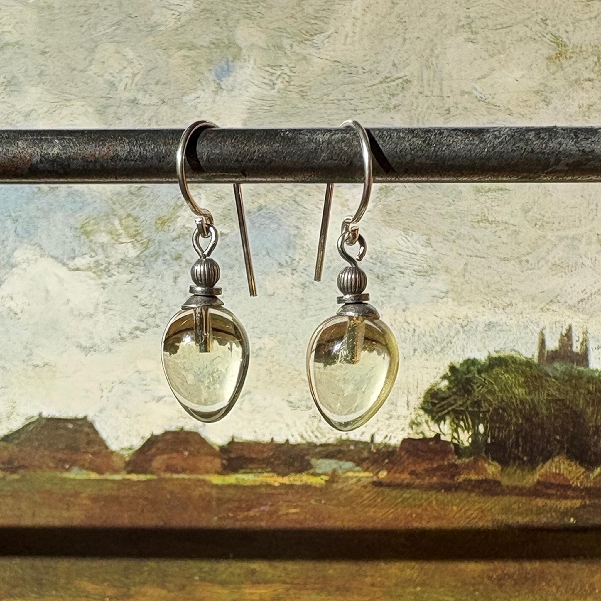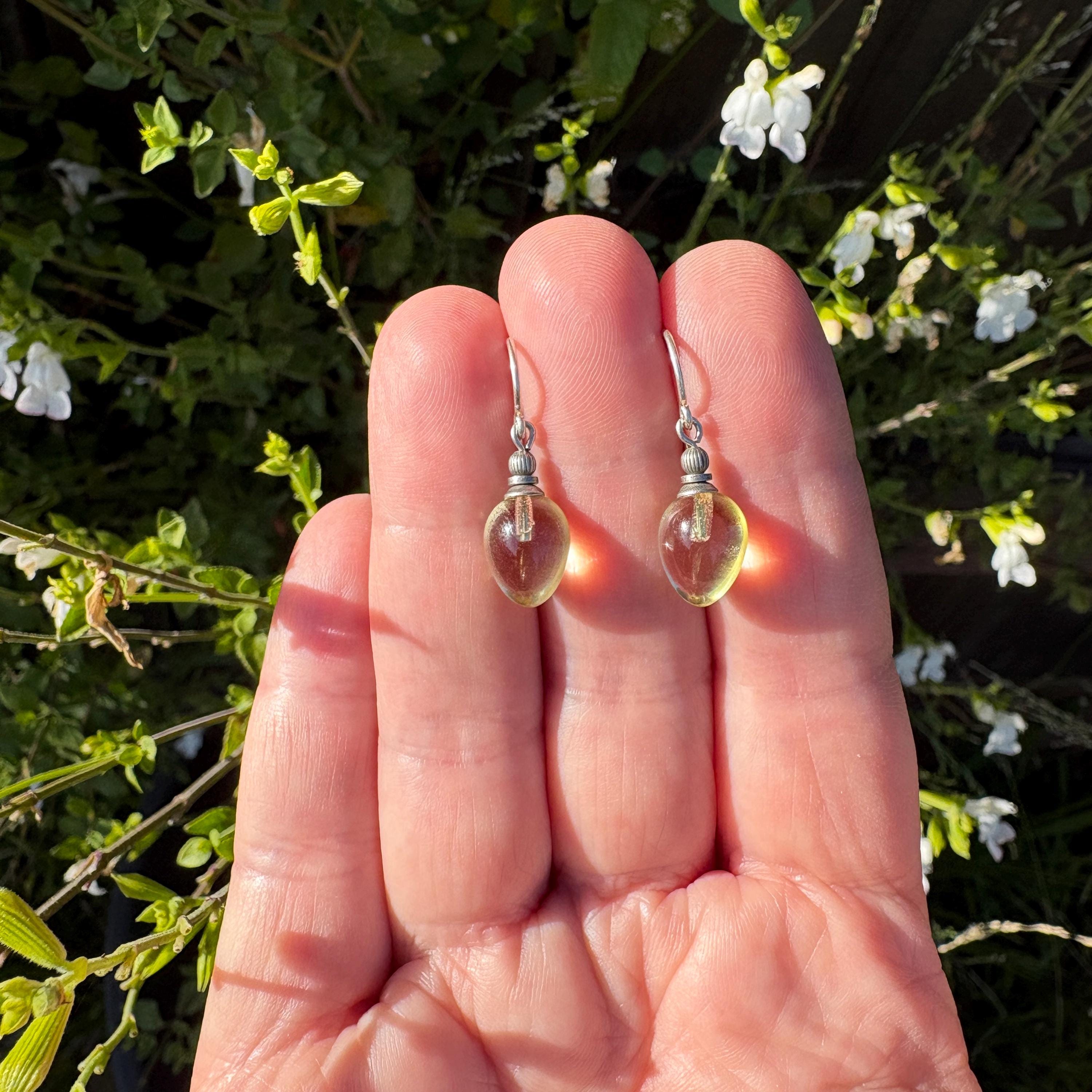 Clear yellow German glass drop earrings, from our collection. "Mini Berries 25" is 5/8 inches long. Trim is antiqued silver plate with sterling silver ear wires. All handwork done in the USA.