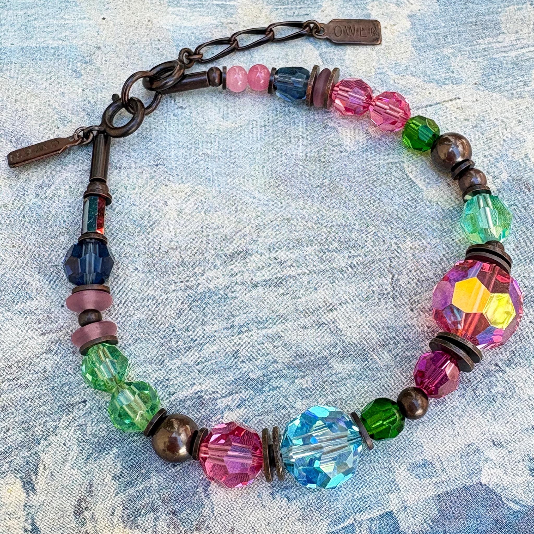 Pink and aqua beaded bracelet. Czech glass and Austrian crystal bracelet in shades pink, aqua and peridot. Metal parts from our own tooling are antiqued bronze. "Time Scales" bracelet measures 7 inches long. A 1 inch extender is included. All handwork done in the USA.